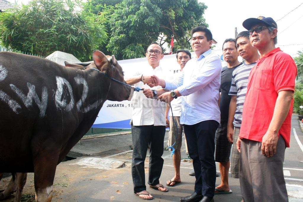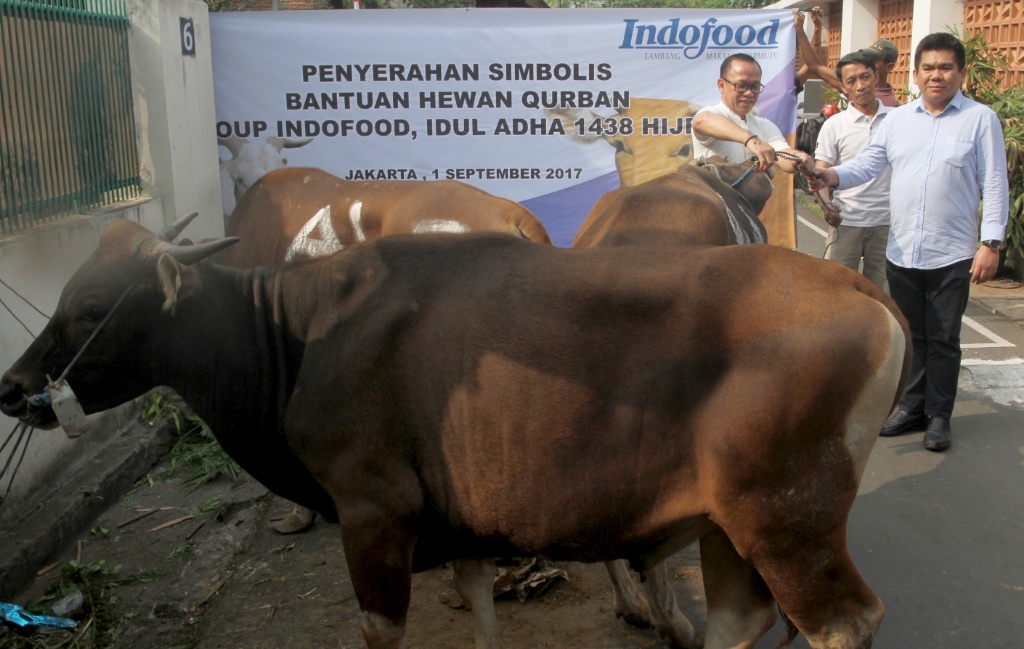 CSR Manager PT Indofood Sukses Makmur Tbk Albert Abraham (tengah) secara simbolis menyerahkan hewan kurban sapi sebanyak 3 ekor dan kambing 8 ekor kepada pengurus RW 01 Dwisunu Irwantono (kiri) dikawasan Setiabudi, Jakarta, Jumat (1/9). Segenap Direksi dan Karyawan PT Indofood Sukses Makmur Tbk dalam memperingati Hari Raya Idul Adha 1438 H memberikan bantuan hewan Kurban sebagai wujud tanggung jawab sosial perusahaan (CSR) bagi masyarakat. Total bantuan hewan kurban yang disalurkan Indofood group diseluruh wilayah tanah air bagi masyarakat disekitar kantor, pabrik dan perkebunan berjumlah 56 sapi dan 155 kambing. AKTUAL/Eko S Hilman