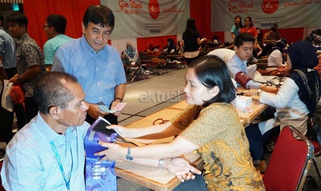 Direktur PT Indofood Sukses Makmur Tbk, Joseph Bataona (kanan) didampingi Head Of CSR PT Indofood Sukses Makmur Tbk, Deni Puspahadi menyapa para peserta donor darah di Kantor Sudirman Plaza, jakarta, senin (9/10). Indofood bekerja sama dengan PMI mengelar acara donor darah dalam rangka memperingati Hari Sumpah Pemuda.Secara rutin, Indofood melaksnakan Donor darah sejak tahun 1994 yang dilaksanakan setiap 3 bulan sekali. Kegiatan donor darah yang melibatkan karyawan Indofood dan masyarakat sekitar kantor pusat, sepanjang tahun 2016 lalu mengumpulkan sekitar 1.600 kantong darah. Kali ini dengan semangat " Ayo Gelorakan Peduli Sesama" acara ini menargetkan sekitar 500 pendonor yang berpartisipasi dalam acara ini. AKTUAL/Eko S Hilman
