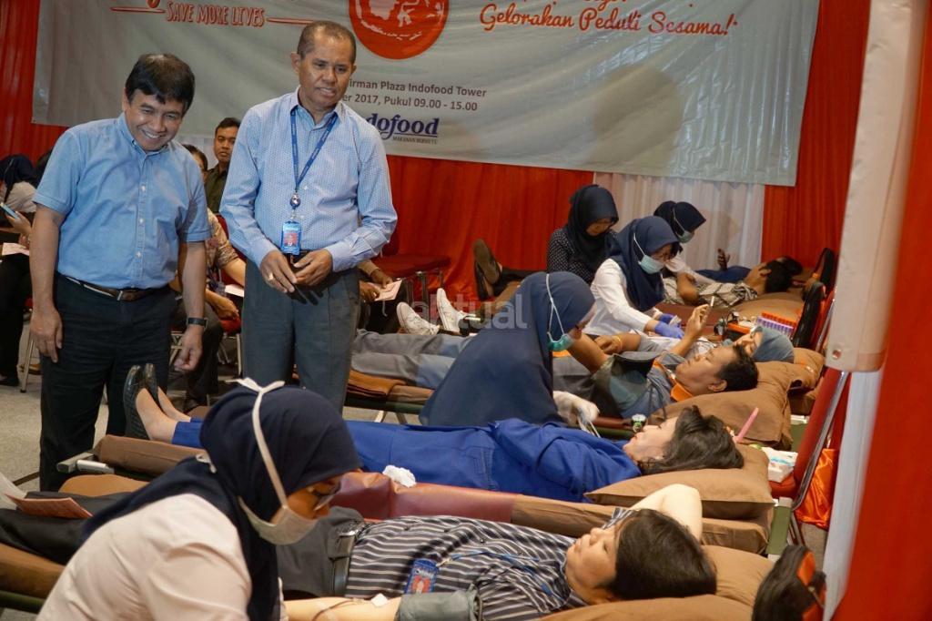 Direktur PT Indofood Sukses Makmur Tbk, Joseph Bataona (kanan) didampingi Head Of CSR PT Indofood Sukses Makmur Tbk, Deni Puspahadi menyapa para peserta donor darah di Kantor Sudirman Plaza, jakarta, senin (9/10). Indofood bekerja sama dengan PMI mengelar acara donor darah dalam rangka memperingati Hari Sumpah Pemuda.Secara rutin, Indofood melaksnakan Donor darah sejak tahun 1994 yang dilaksanakan setiap 3 bulan sekali. Kegiatan donor darah yang melibatkan karyawan Indofood dan masyarakat sekitar kantor pusat, sepanjang tahun 2016 lalu mengumpulkan sekitar 1.600 kantong darah. Kali ini dengan semangat ” Ayo Gelorakan Peduli Sesama” acara ini menargetkan sekitar 500 pendonor yang berpartisipasi dalam acara ini. AKTUAL/Eko S Hilman