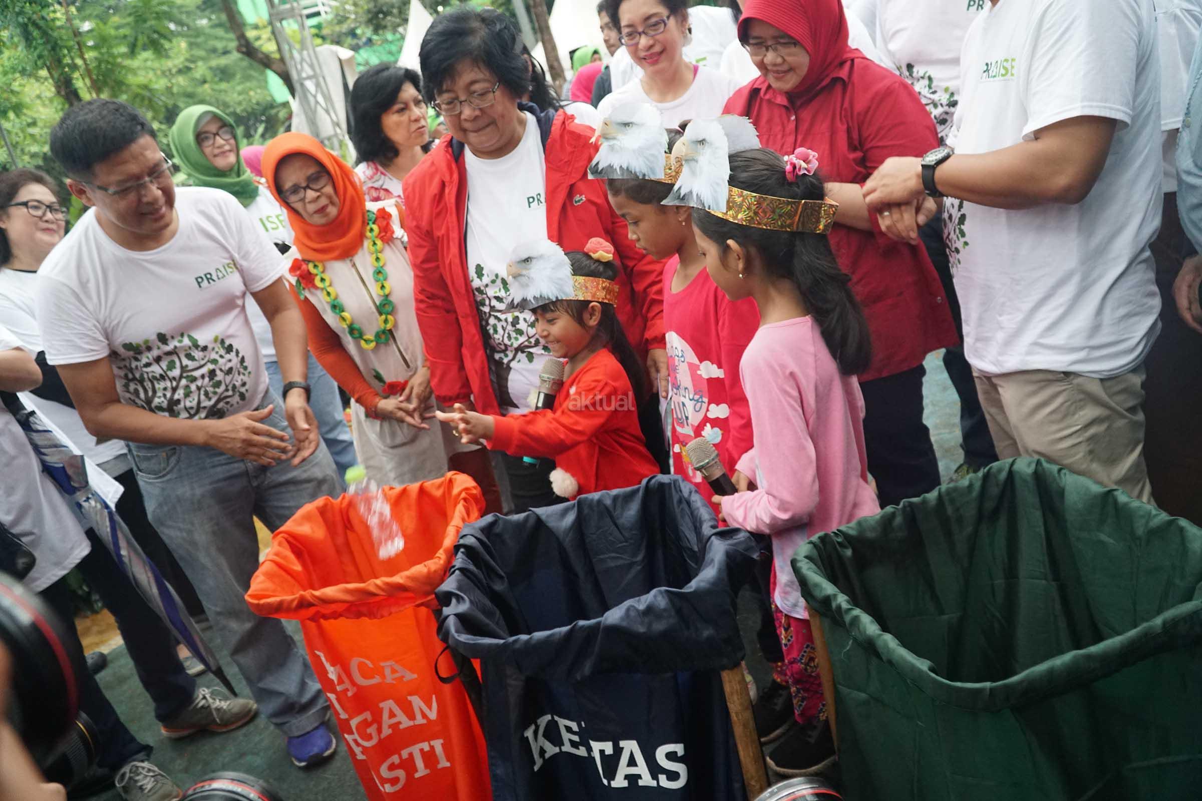 Menteri Lingkungan Hidup dan Kehutanan Siti Nurbaya Bakar (kedua kiri), didampingi GM Corporate Communications PT Indofood Sukses Makmur Tbk Stefanus Indrajati (kiri), mengajarkan anak-anak membuang sampah ke dalam tong sampah pada peringatan Hari Peduli Sampah Nasional 2017, di Jakarta, Minggu (19/2). Pada kesempatan itu juga diluncurkan Aliansi untuk Kemasan dan Daur Ulang bagi Indonesia Berkelanjutan, PRAISE (Packaging and Recycling Alliance for Indonesia Sustainable Environtment) yang diprakarsai 6 perusahaan consumer goods Indonesia. AKTUAL/Eko S Hilman