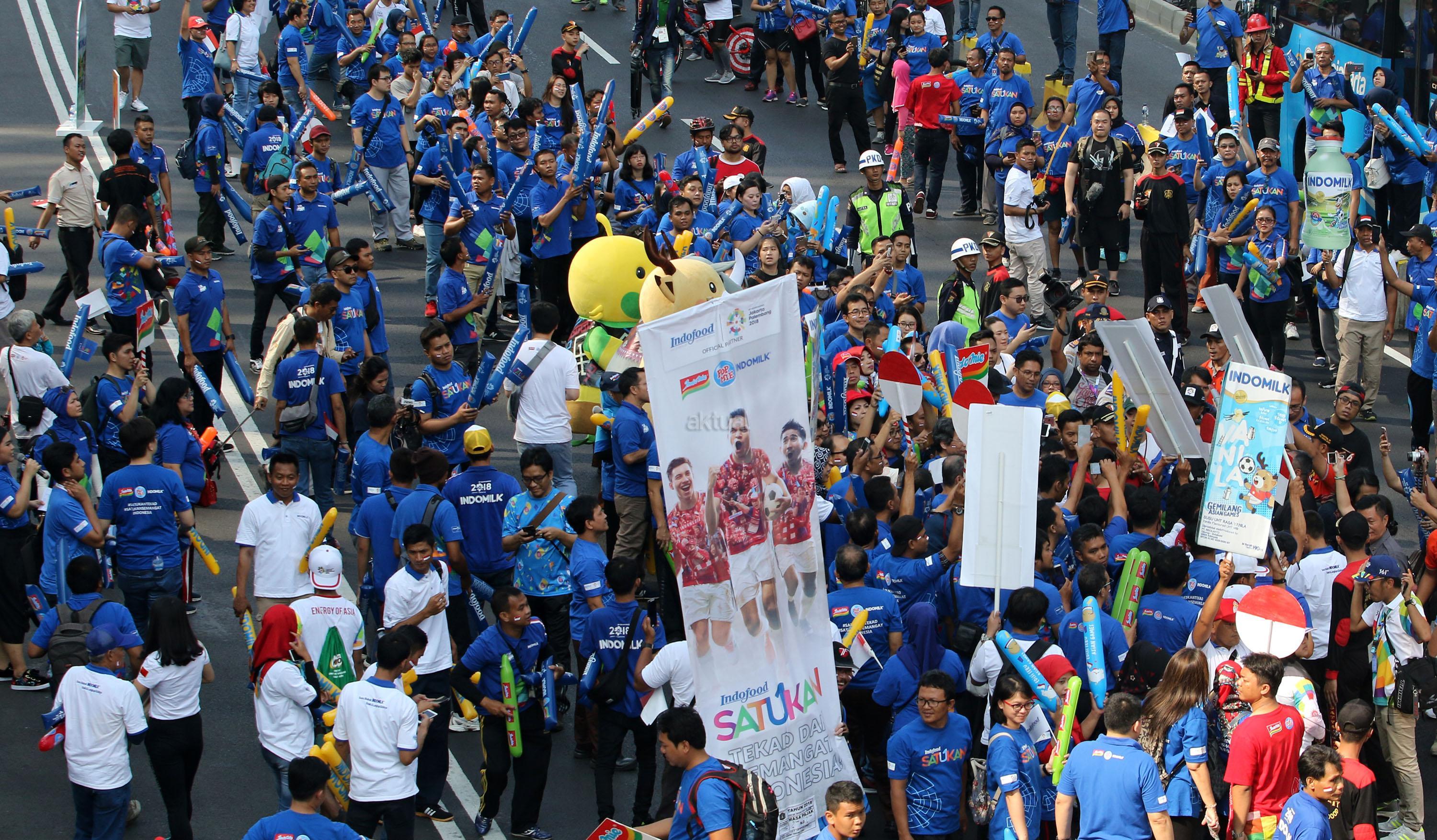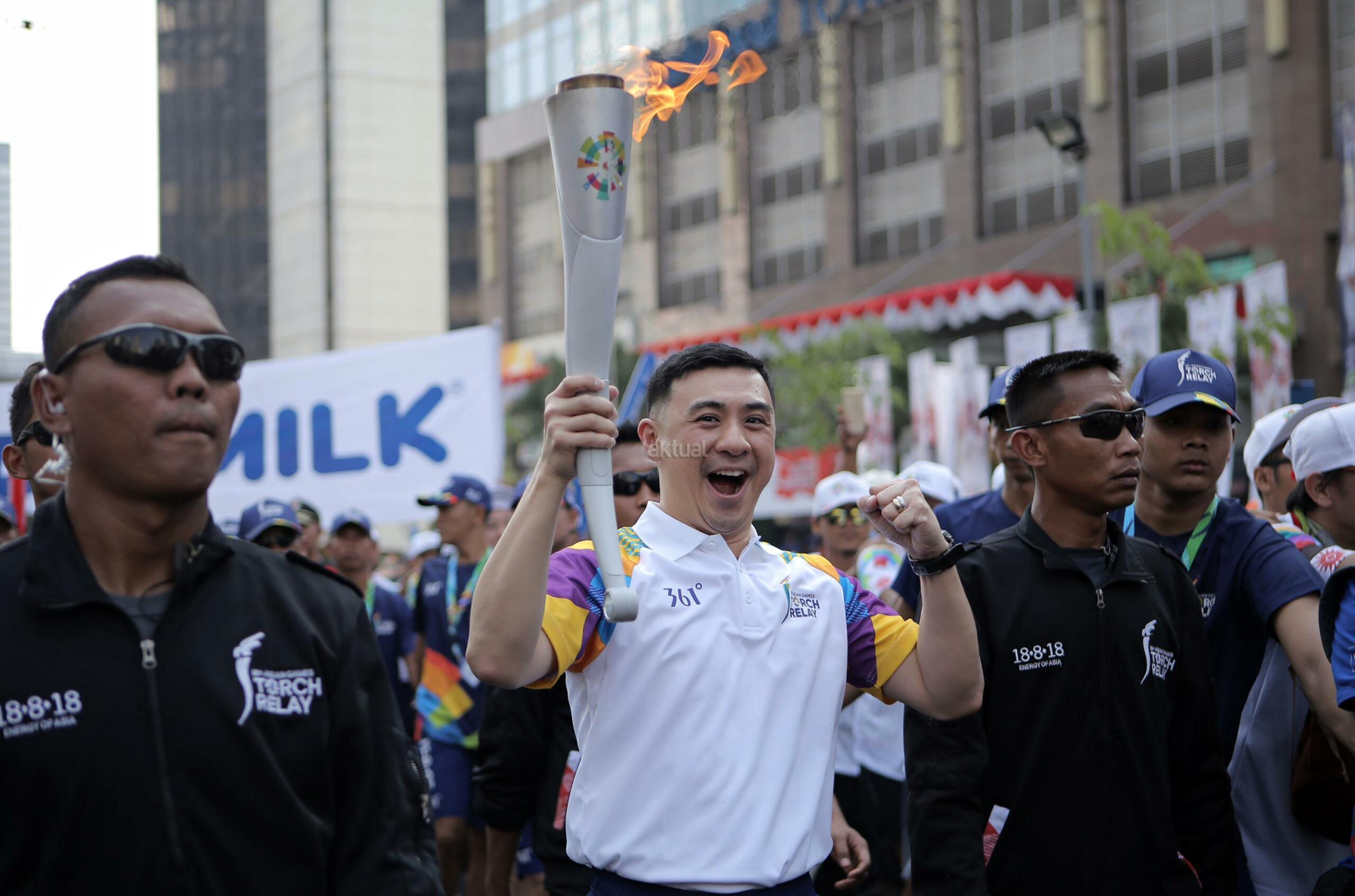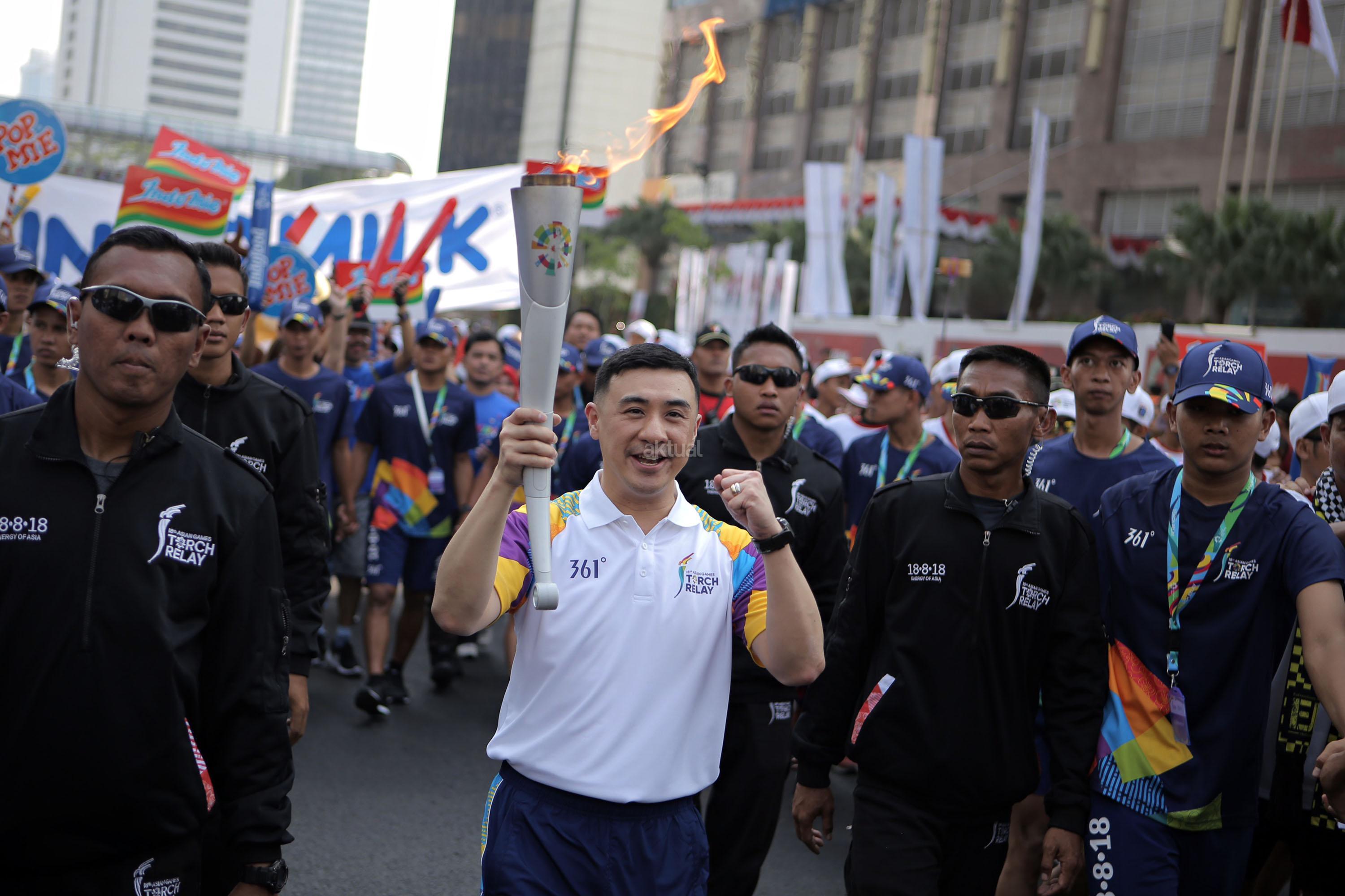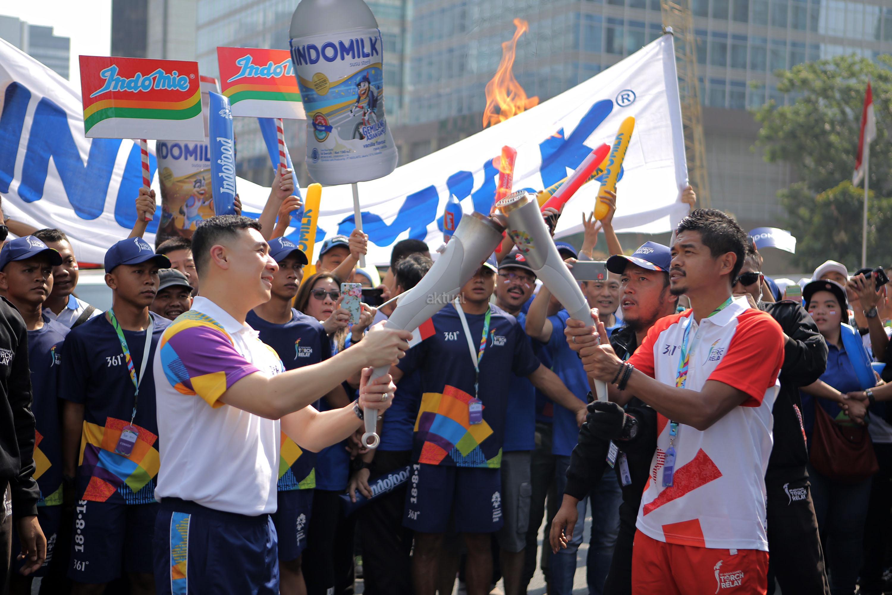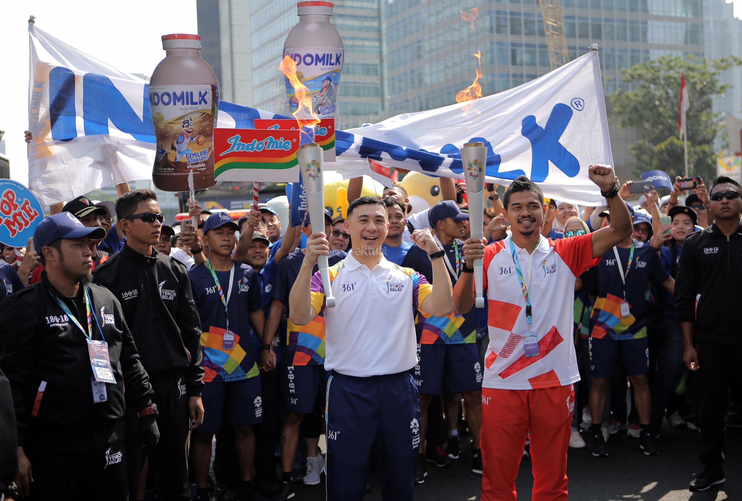 Direktur PT Indofood Sukses Makmur, Axton Salim (kiri) melakukan relay obor yang diberikan kepada atlet sepak bola Bambang Pamungkas (kanan) untuk meneruskan api obor abadi yang akan dibawa ke Stadion Gelora Bung Karno untuk pembukaan Asian Games ke 18 di Jakarta, Sabtu (18/8/2018). PT Indofood Sukses Makmur Tbk menyatakan partisipasinya dalam pawai obor atau Torch Relay Asian Games 2018. Indofood turut menyemarakkan pawai obor di 6 kota dengan melibatkan berbagai elemen masyarakat seperti atlet nasional, masyarakat umum dan juga karyawan Indofood yang tersebar di kota-kota besar Indonesia. AKTUAL/Tino Oktaviano