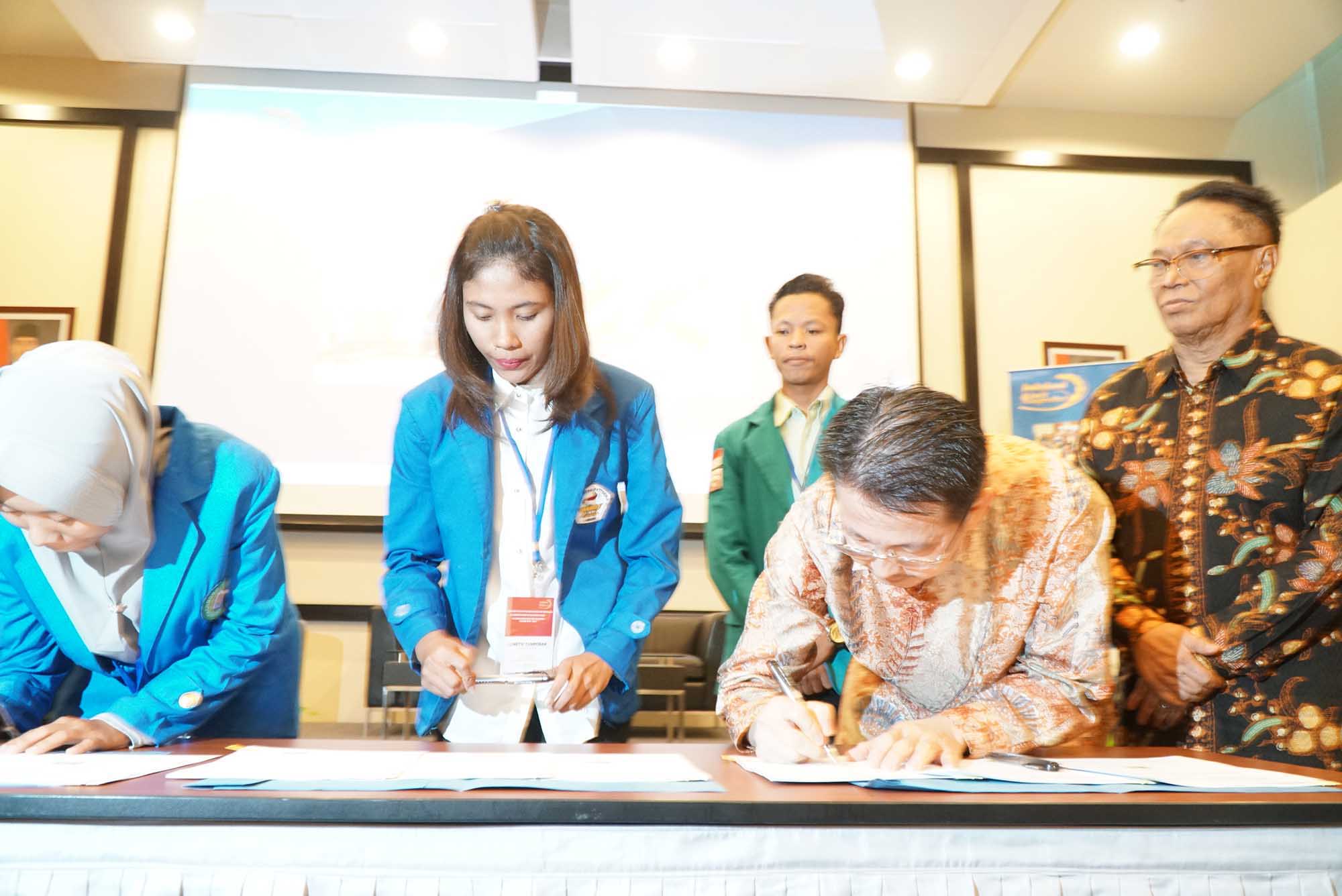 Direktur PT Indofood Sukses Makmur Tbk, Suaimi Suriady disaksikan Ketua Tim Pakar periode 1998-2018 dan Prof. Dr. Ir. Purwiyatno Hariyadi, Msc, menandatangani naskah serta memberikan secara simbolis bantuan dana riset program Indofood Riset Nugraha (IRN) 2018-2019 kepada perwakilan mahasiswa/I disela seminar dan bedah buku di Jakarta, Kamis (6/9). Dalam kesempatan yang sama Tiga buah buku mengenai pangan dan gizi karya Prof. Dr. Ir FG Winarno, Mc dibedah. AKTUAL/Eko S Hilman