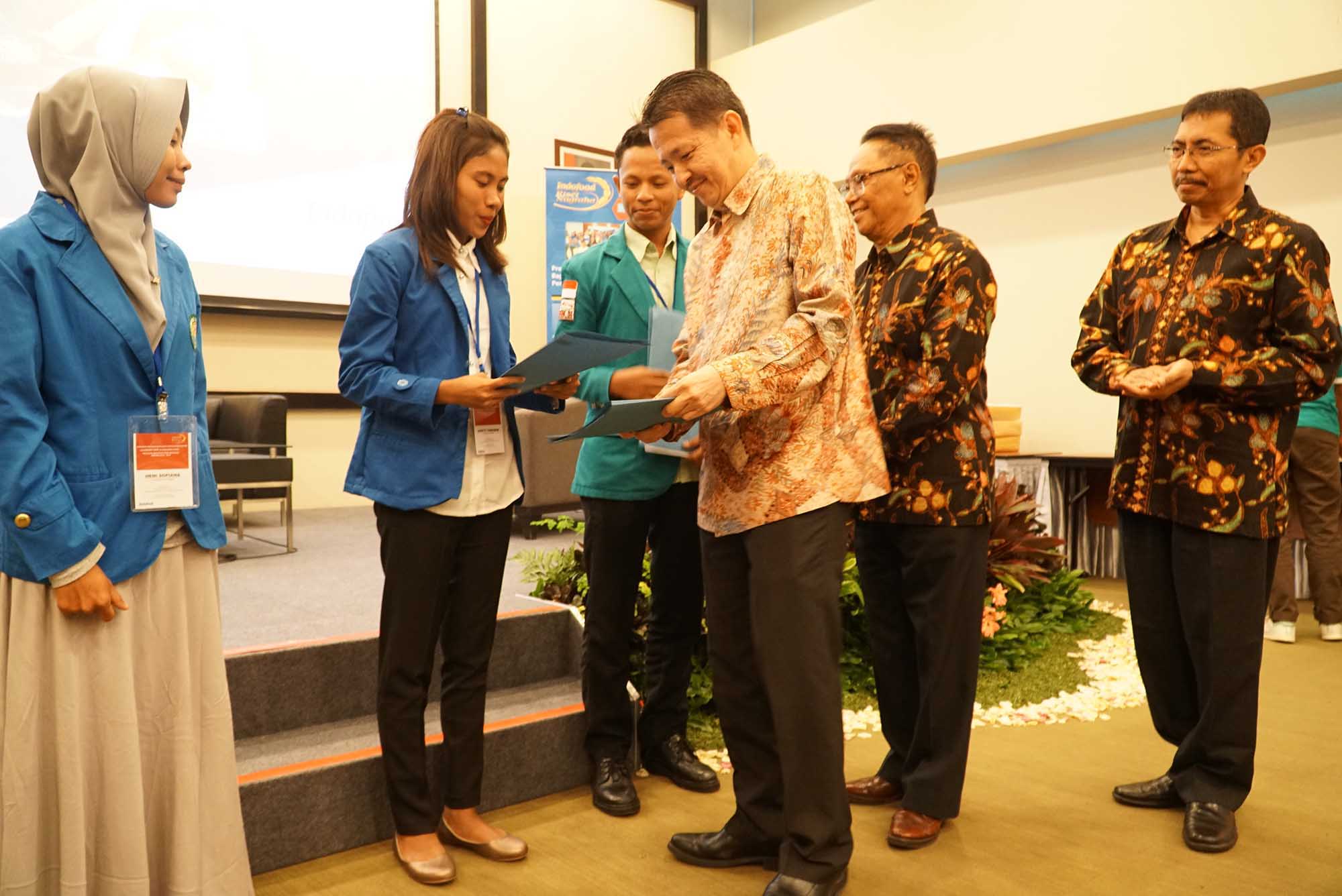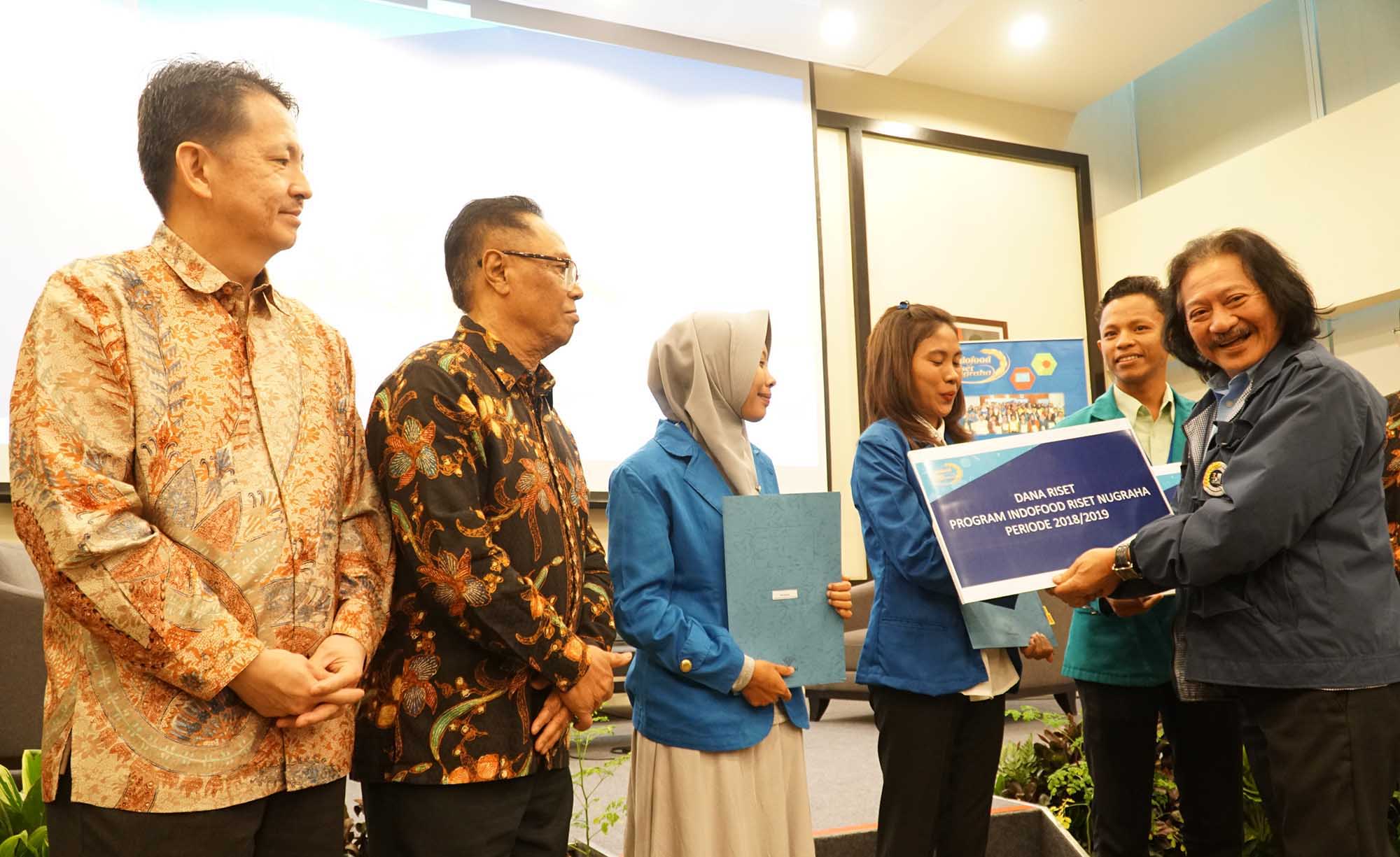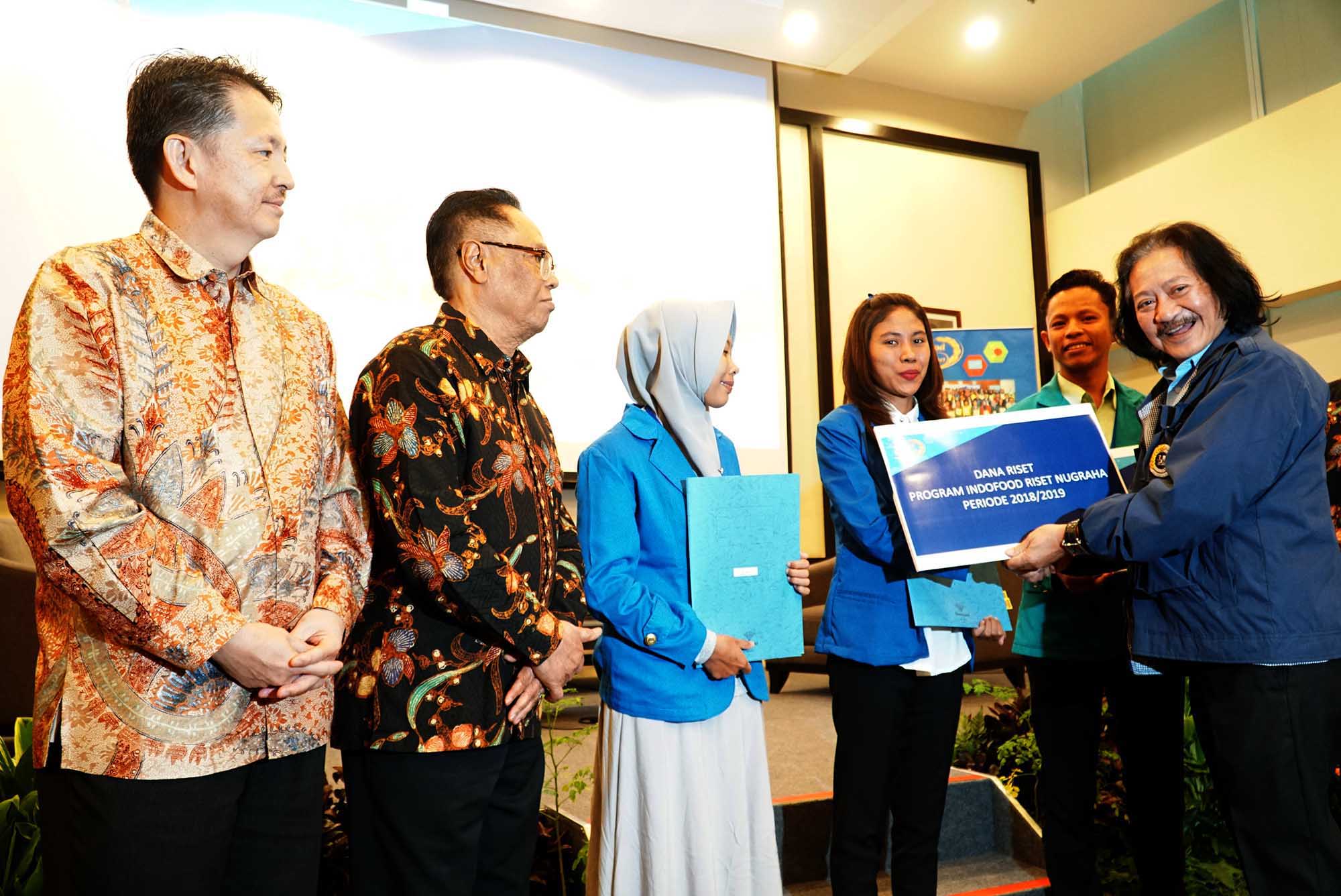 Direktur PT Indofood Sukses Makmur Tbk, Suaimi Suriady disaksikan Ketua Tim Pakar periode 1998-2018 dan Prof. Dr. Ir. Purwiyatno Hariyadi, Msc, memberikan secara simbolis bantuan dana riset program Indofood Riset Nugraha (IRN) 2018-2019 kepada perwakilan mahasiswa/I disela seminar dan bedah buku di Jakarta, Kamis (6/9). Dalam kesempatan yang sama Tiga buah buku mengenai pangan dan gizi karya Prof. Dr. Ir FG Winarno, Mc dibedah. AKTUAL/Eko S Hilman