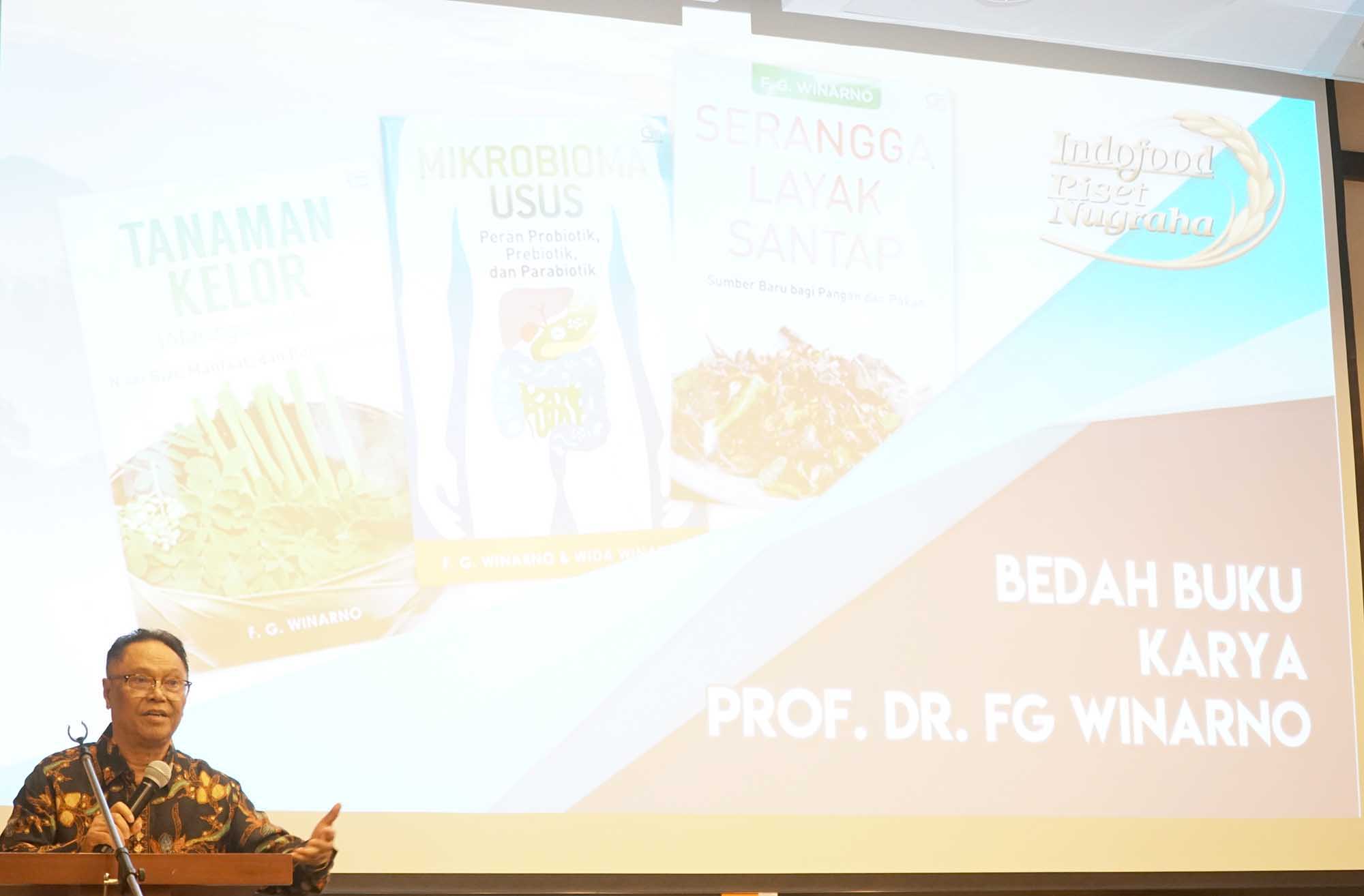 Tiga buah buku mengenai pangan dan gizi karya Prof. Dr. Ir FG Winarno, Mc dibedah pada acara seminar dan bedah buku di Jakarta, Kamis 6/9/2018). Ketiga buku yang didukung oleh Indofood Riset Nugraha (IRN) itu masing-masing Serangga Layak Santap: Sumber Baru bagi Pangan dan Pakan, Tanaman Kelor: Manfaat dan Potensi Usaha, serta Mikrobioma Usus: Peran Probiotik, Prebiotik, dan Parabiotik. Peserta yang hadir sebagian besar mahasiswa dari berbagai perguruan tinggi . Pada waktu yang bersamaan diberikan juga bantuan dana riset dari Pt Indofood Sukses Makmur melalaui program IRN kepada 58 mahasiswa S1. Selain bantuan dana, mahasiswa juga akan mendapatkan pendampingan dan bumbungan teknis dari tim pakar IRN selama melakukan penelitiansebagai syarat kelulusan pendidikan tingkat sarjananya. AKTUAL/Eko S Hilman