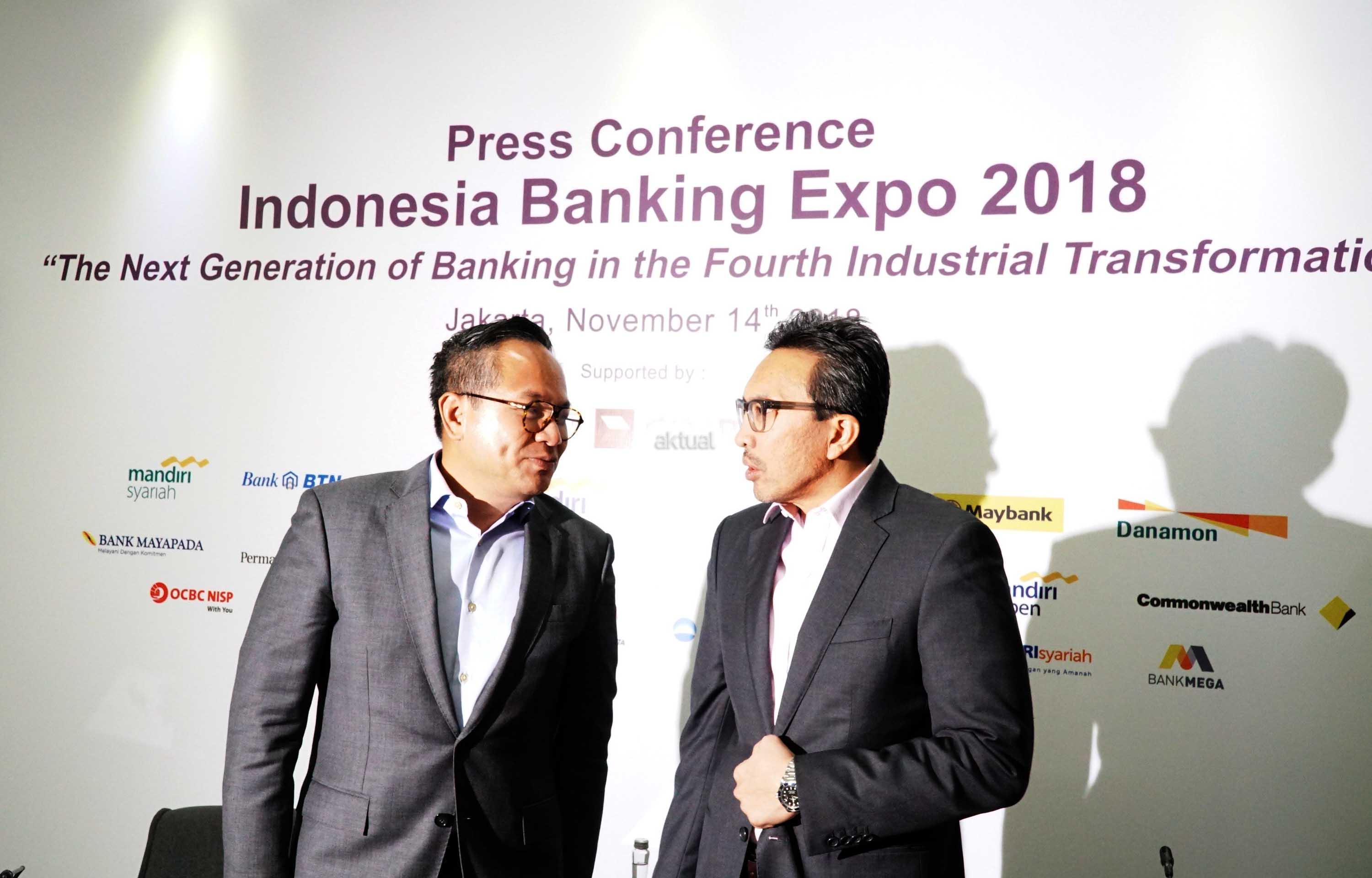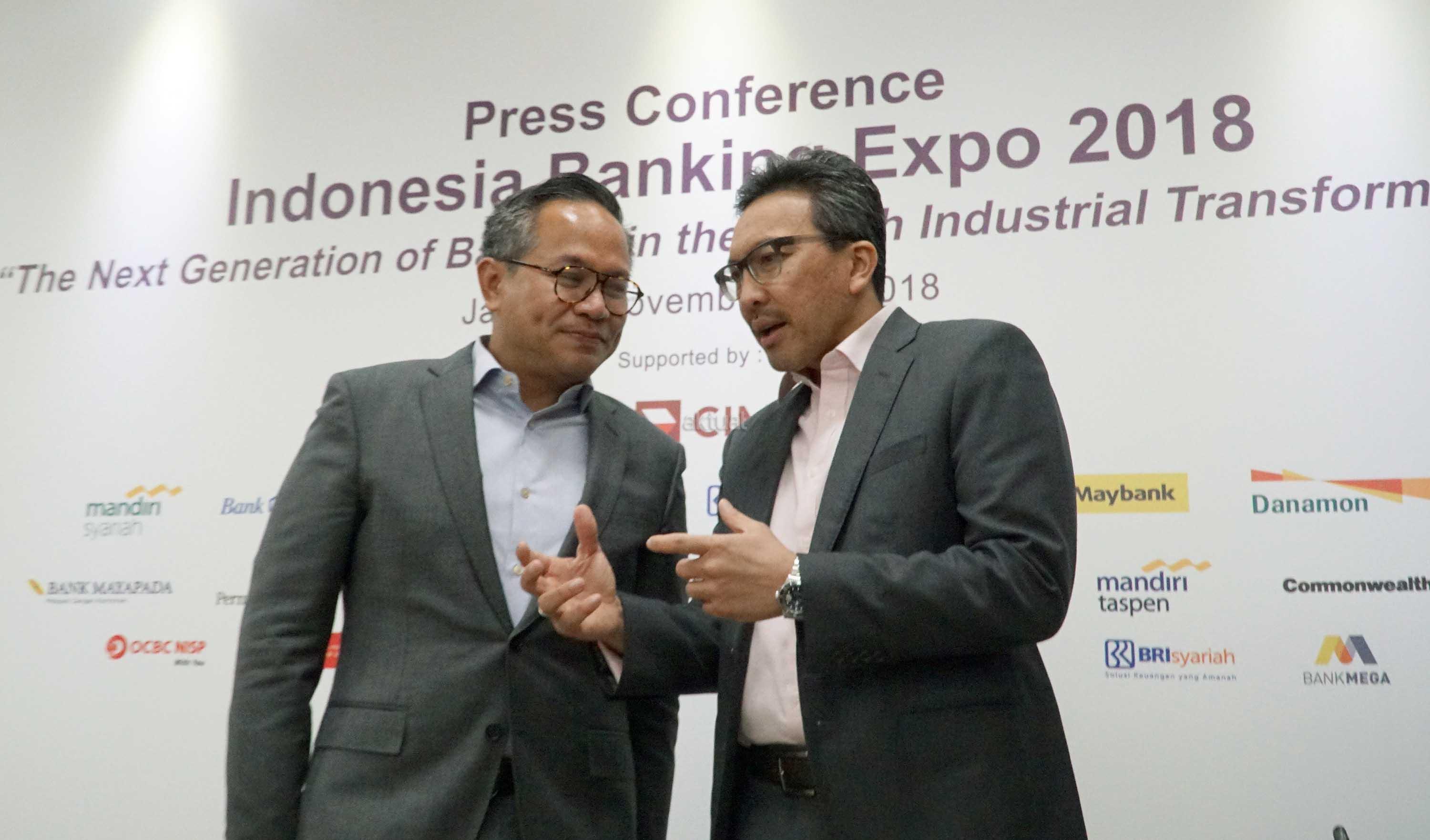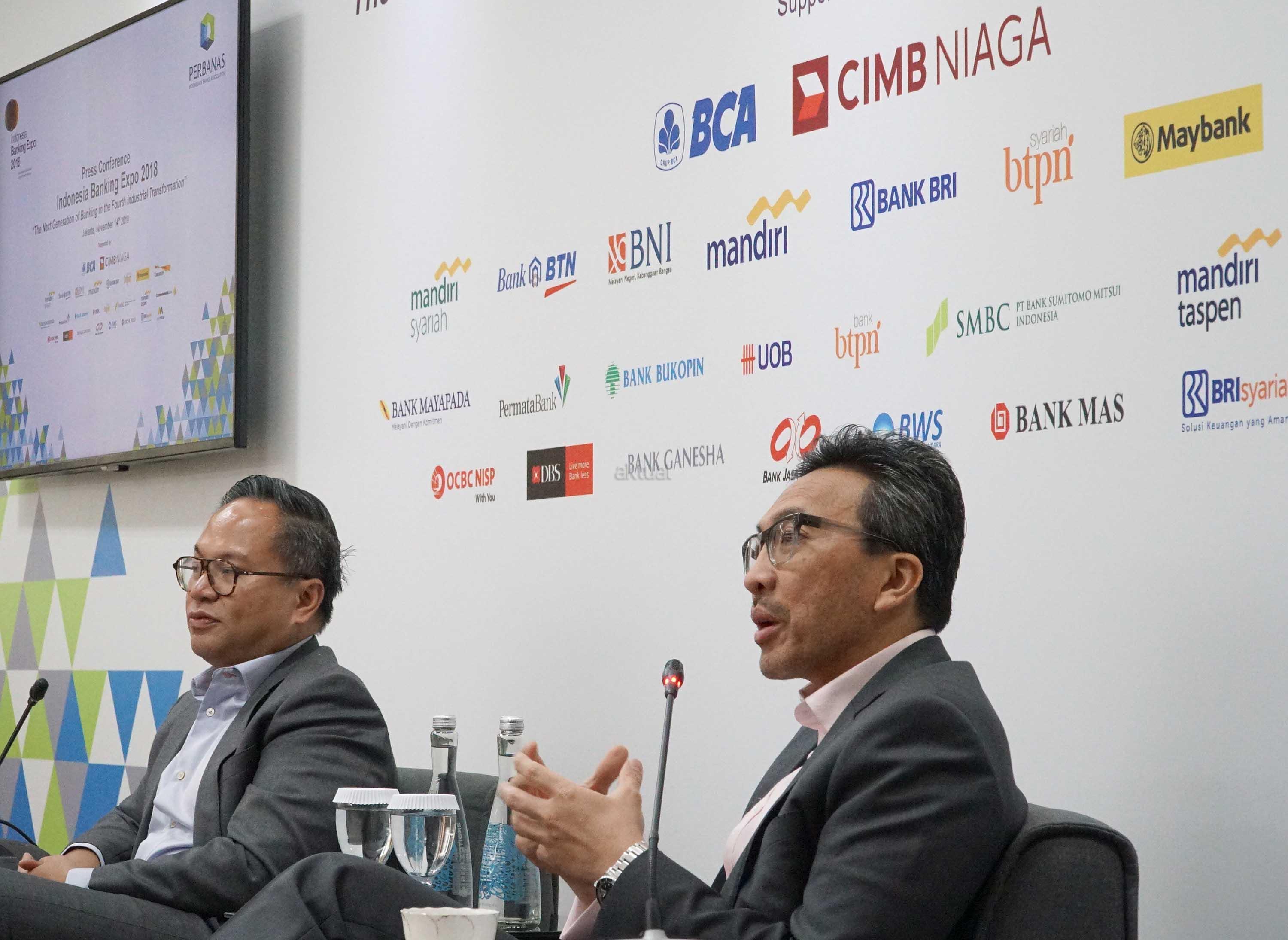 Ketua Steering Committee IBEX 2018 Tigor M. Siahaan (kanan) bersama Ketua Umum Perhimpunan Bank Nasional (Perbanas) Kartika Wirjoatmodjo (kiri) memberikan penjelasan kepada wartawan saat konferensi pers Indonesia Banking Expo (IBEX) 2018 di Jakarta, Rabu (14/11/2018). Perbanas akan menggelar IBEX 2018 pada Kamis (15/11/2018) dengan tema besar ‘Generasi Baru Perbankan Dalam Transformasi Industri Keempat’. Acara akan menghadirkan nara sumber dari berbagai sektor terkait dengan perbankan, untuk membahas peran teknologi dalam transformasi industri generasi keempat serta bagaimana sektor perbankan harus menyikapinya. AKTUAL/Eko S Hilman