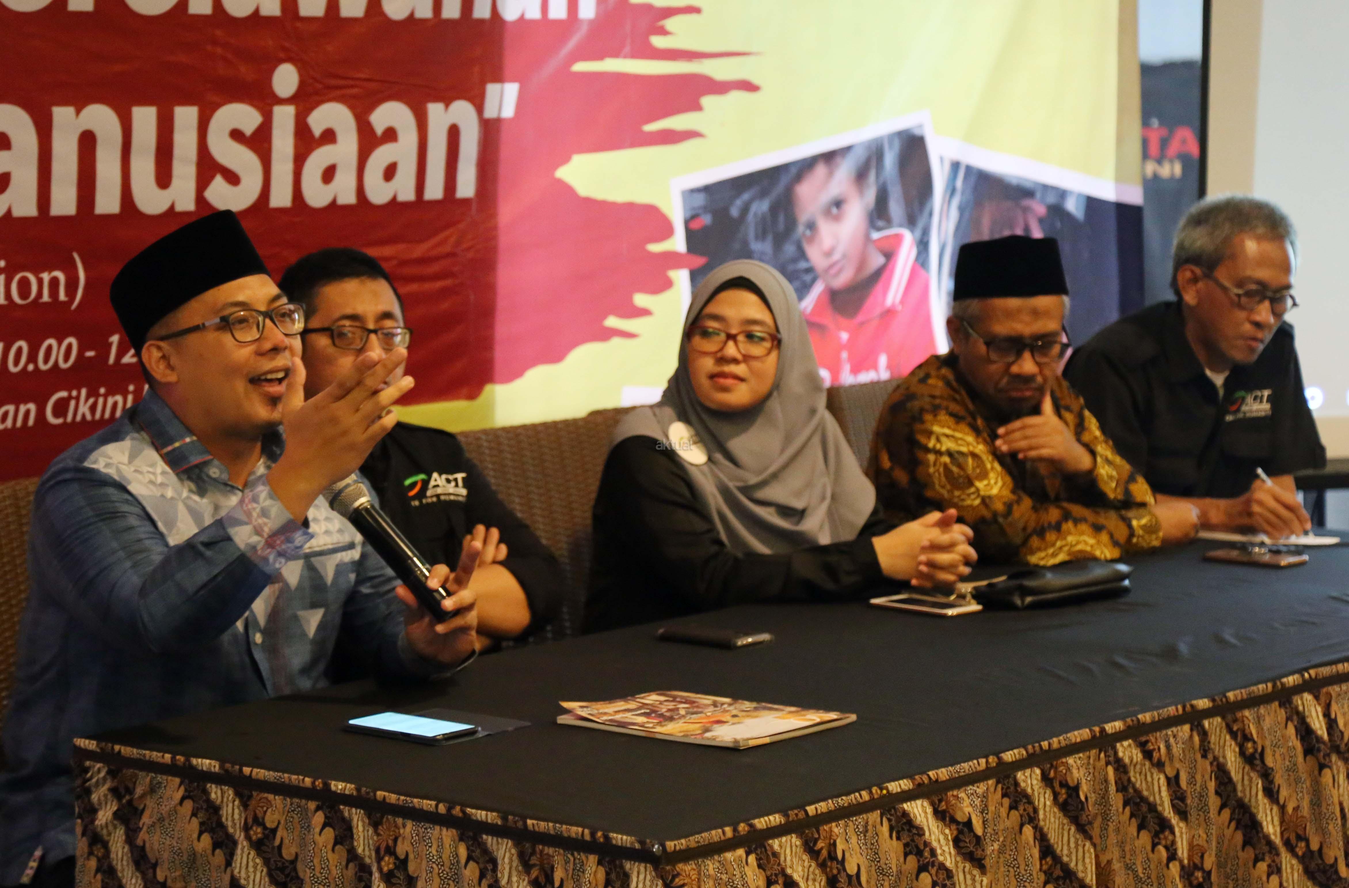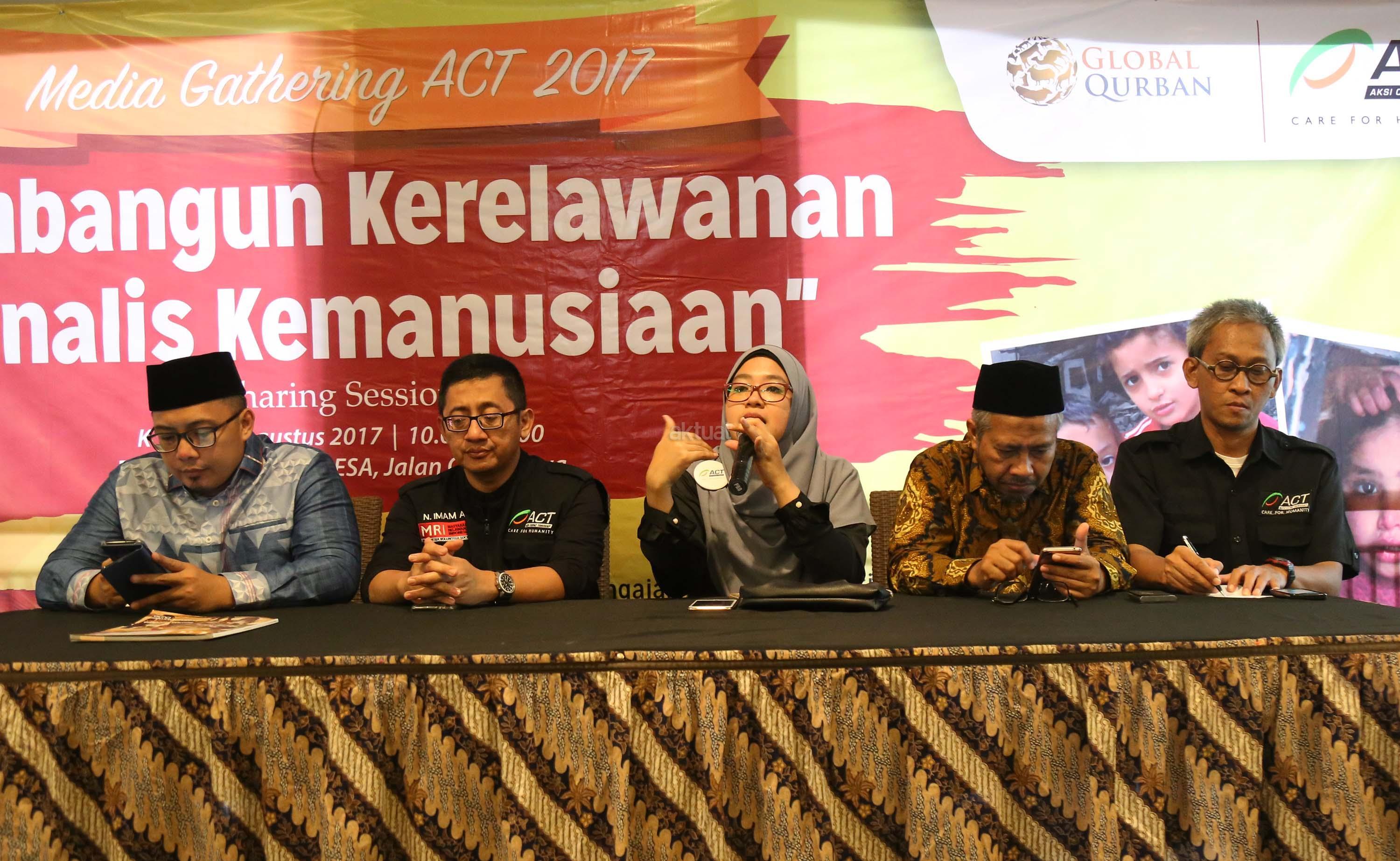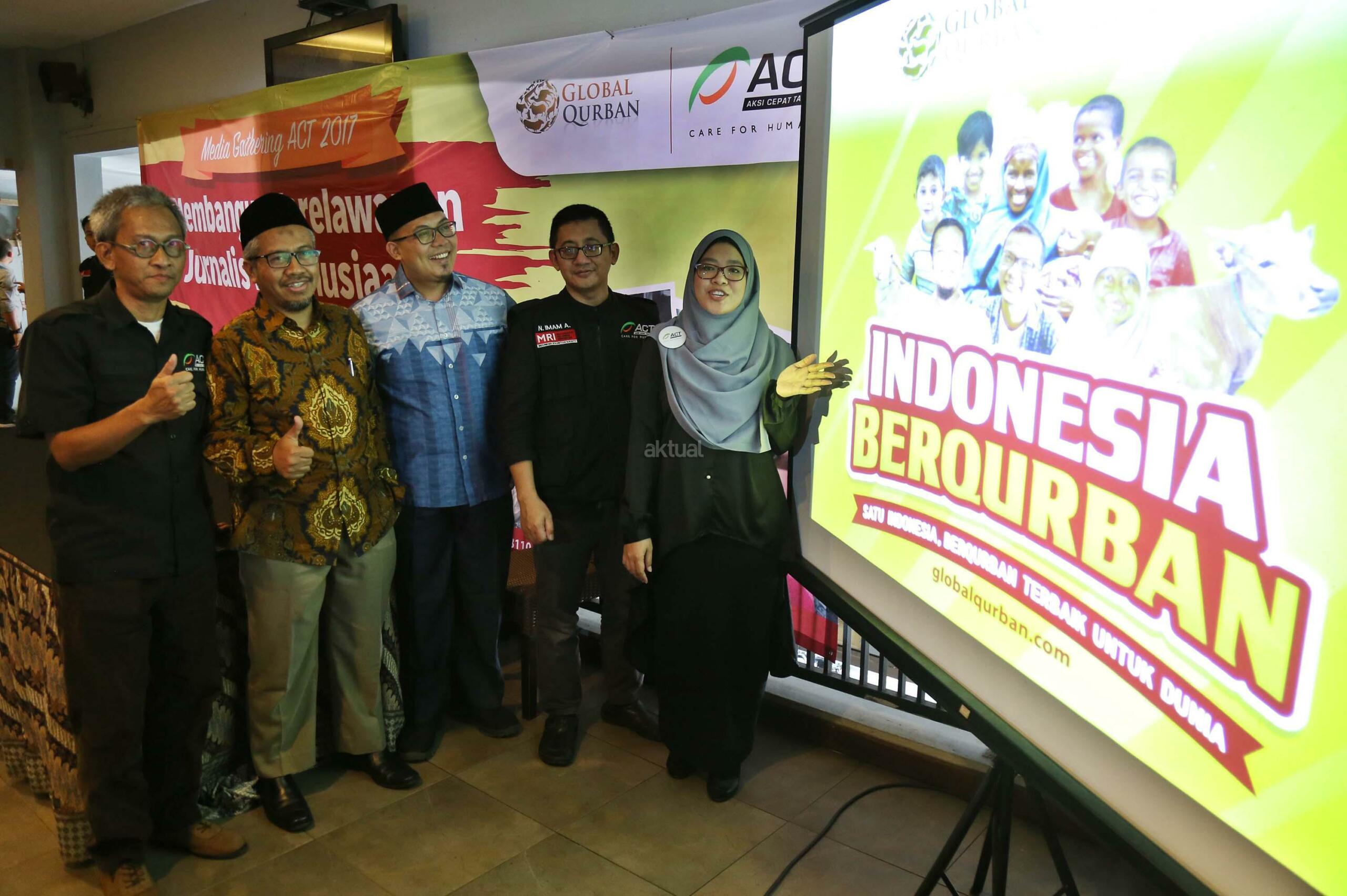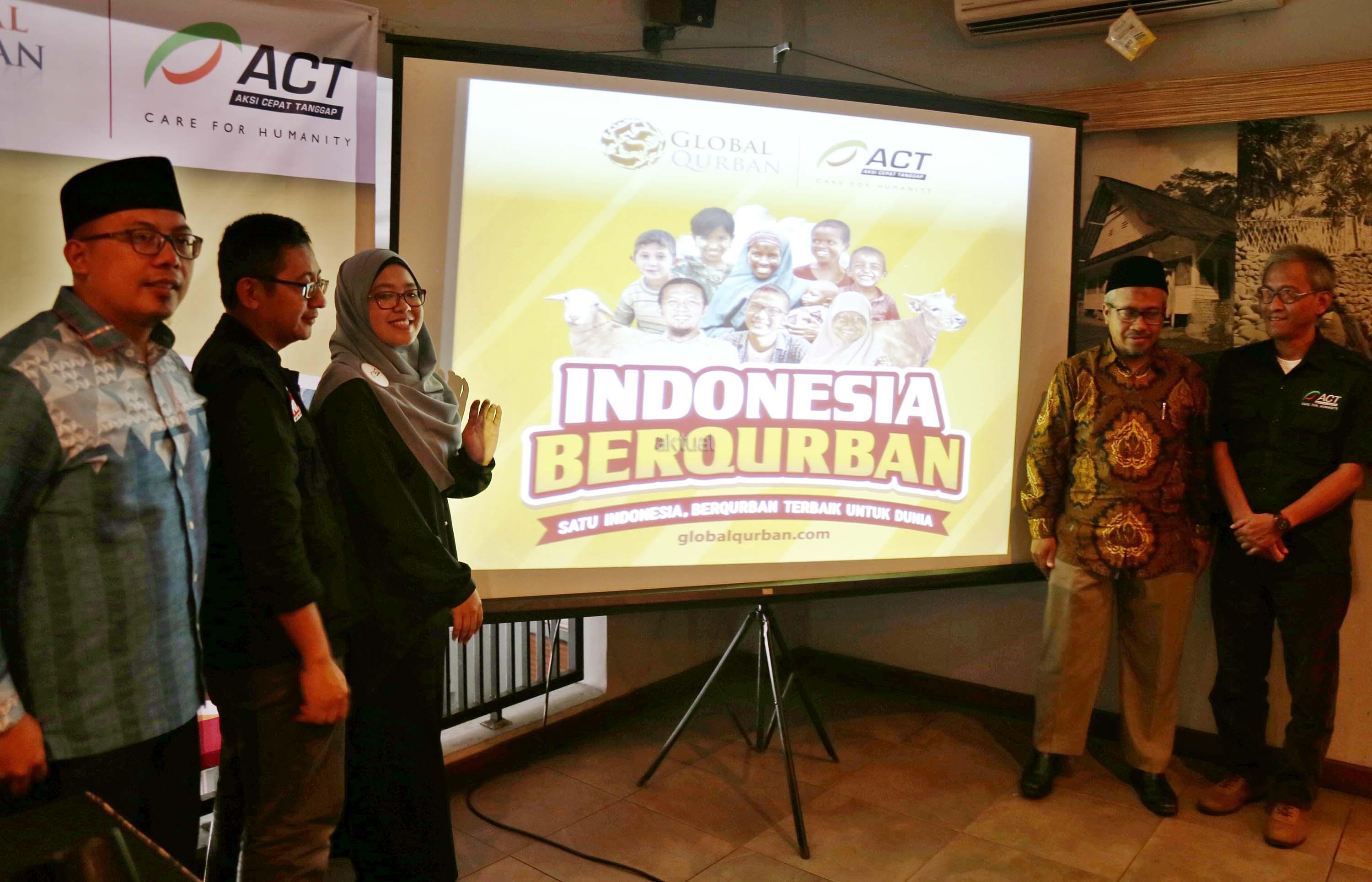 Pengawas Aksi Cepat Tanggap (ACT) Bobby Herwibowo, Senior Vice President ACT Imam Akbari, President Global Qurban Rini Maryani, Vice President ACT Iqbal Setyarso, Director of Global Humanity Response ACT Bambang Triyono saat menyampaikan program Global Qurban (GQ)- ACT di Jakarta, Kamis (24/8). Tahun 2016 lalu, GQ sukses mendistribusikan hewan kurban ke seluruh penjuru Indonesia serta 31 negara lainnya. Tahun ini, GQ masih akan menyapa seluruh provinsi di Indonesia sekaligus 40 negara pra-sejahtera dan yang terpapar konflik kemanusiaan. AKTUAL/Tino Oktaviano