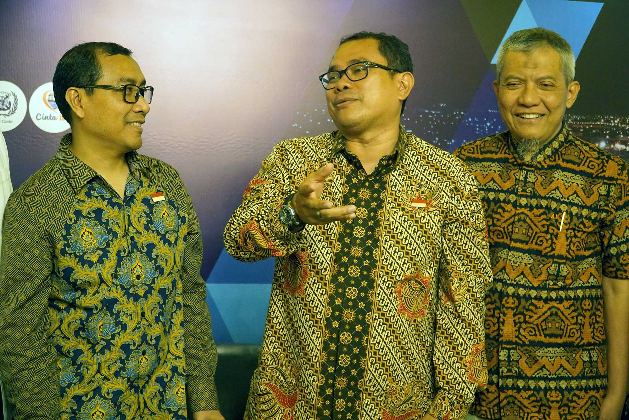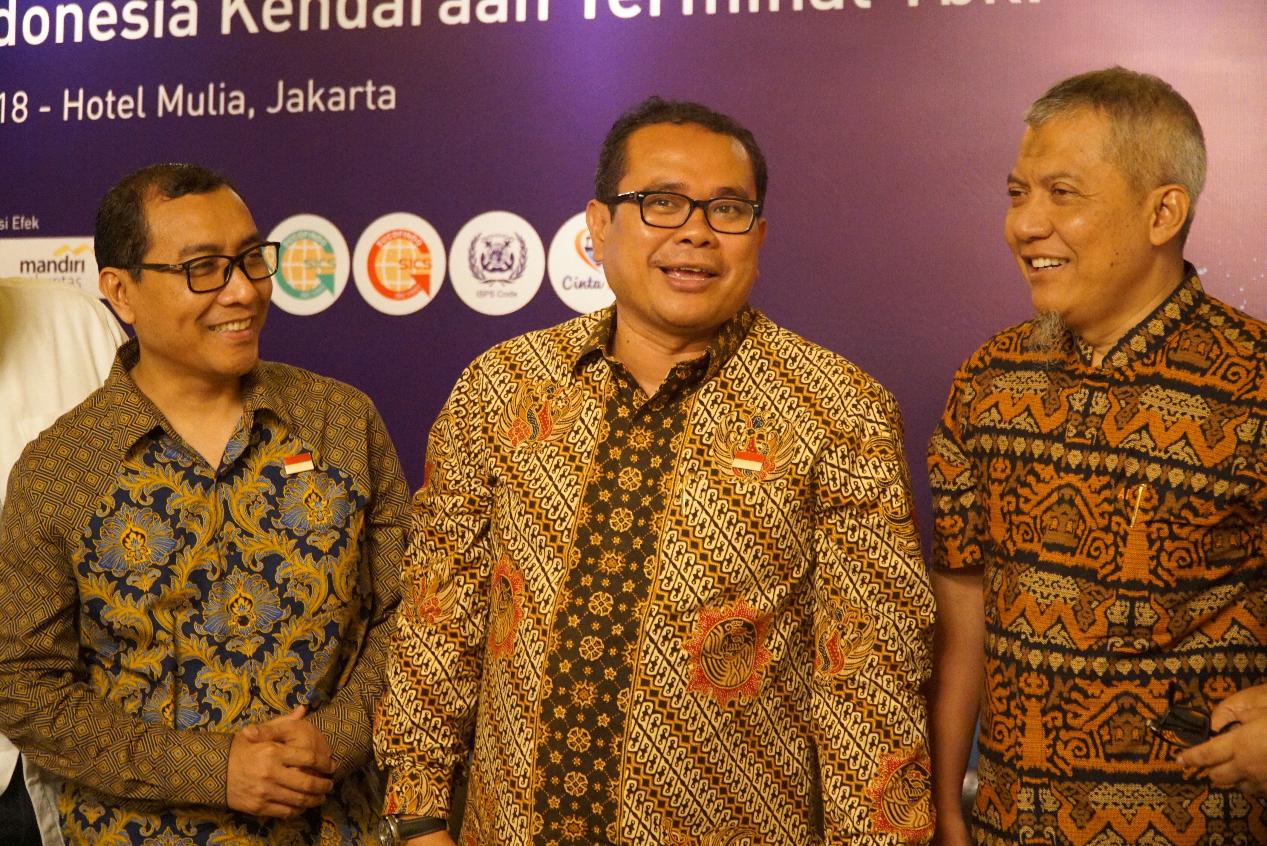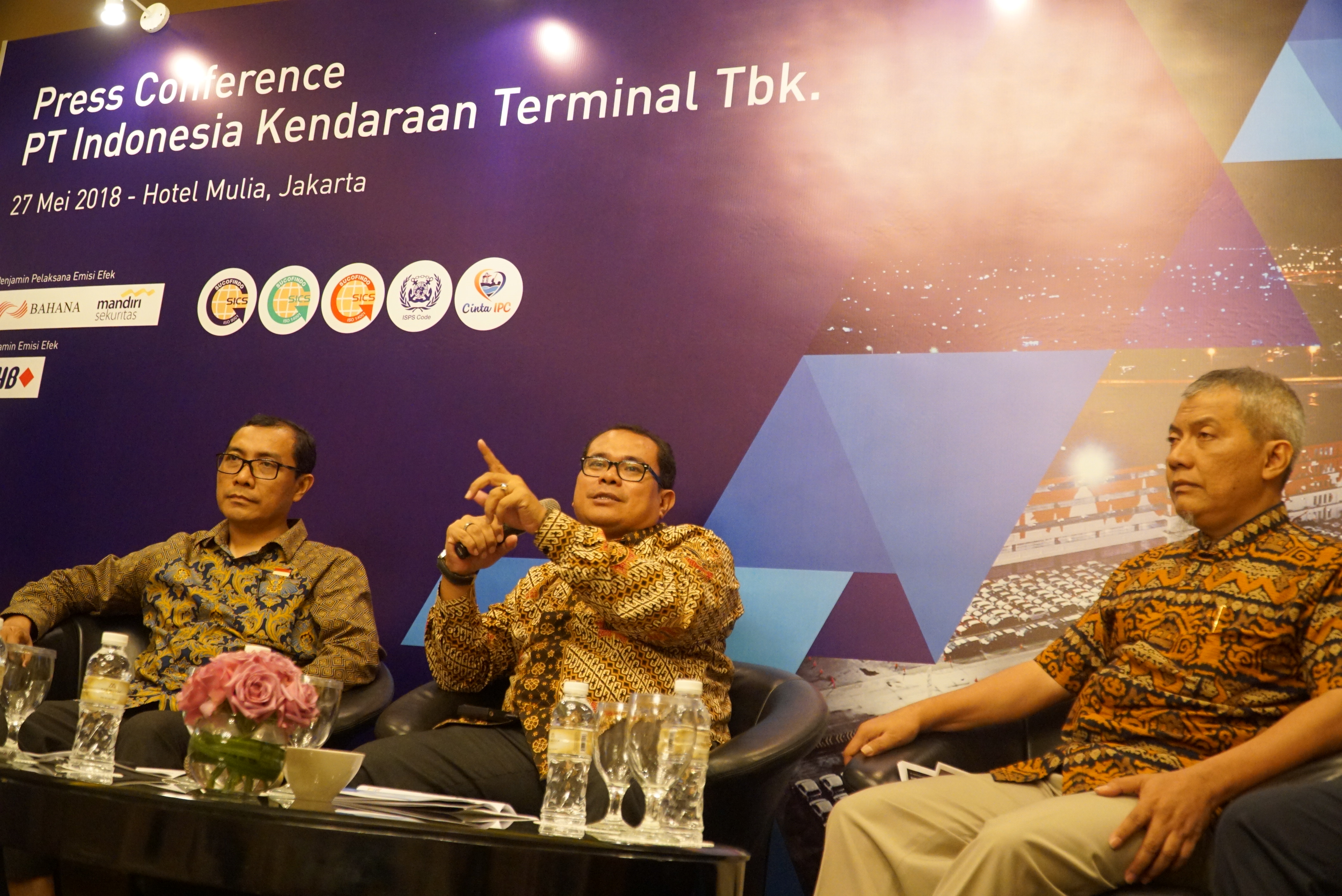 Dari kiri ke kanan, Direktur Keuangan dan SDM IKT Sugeng Mulyadi, Direktur Utama Chiefy Adi Kusmargono, Direktur Komersial dan Pengembangan Bisnis, Arif Isnawan berbincang sebelum jumpa pers di Jakarta, Minggu (27/5). IKT yang dikenal juga sebagai IPC Car Terminal menawarkan sebanyak banyaknya 561.101.600 saham atau sebesar 30% dari modal ditempatkan dan disetor penuh perseroan melalui IPO. Anak perusahaan Pelindo II atau IPC akan mengalokasikan 50% dana hasil IPO untuk pengembangan dan 50% untuk modal kerja. IKT menyediakan terminal yang disiapkan tak hanya untuk mobil melainkan alat berat, truk, bus dan suku cadang di atas lahan seluas 31 hektare dengan kapasitas 700.000 unit kendaraan per tahun. AKTUAL/Eko S Hilman