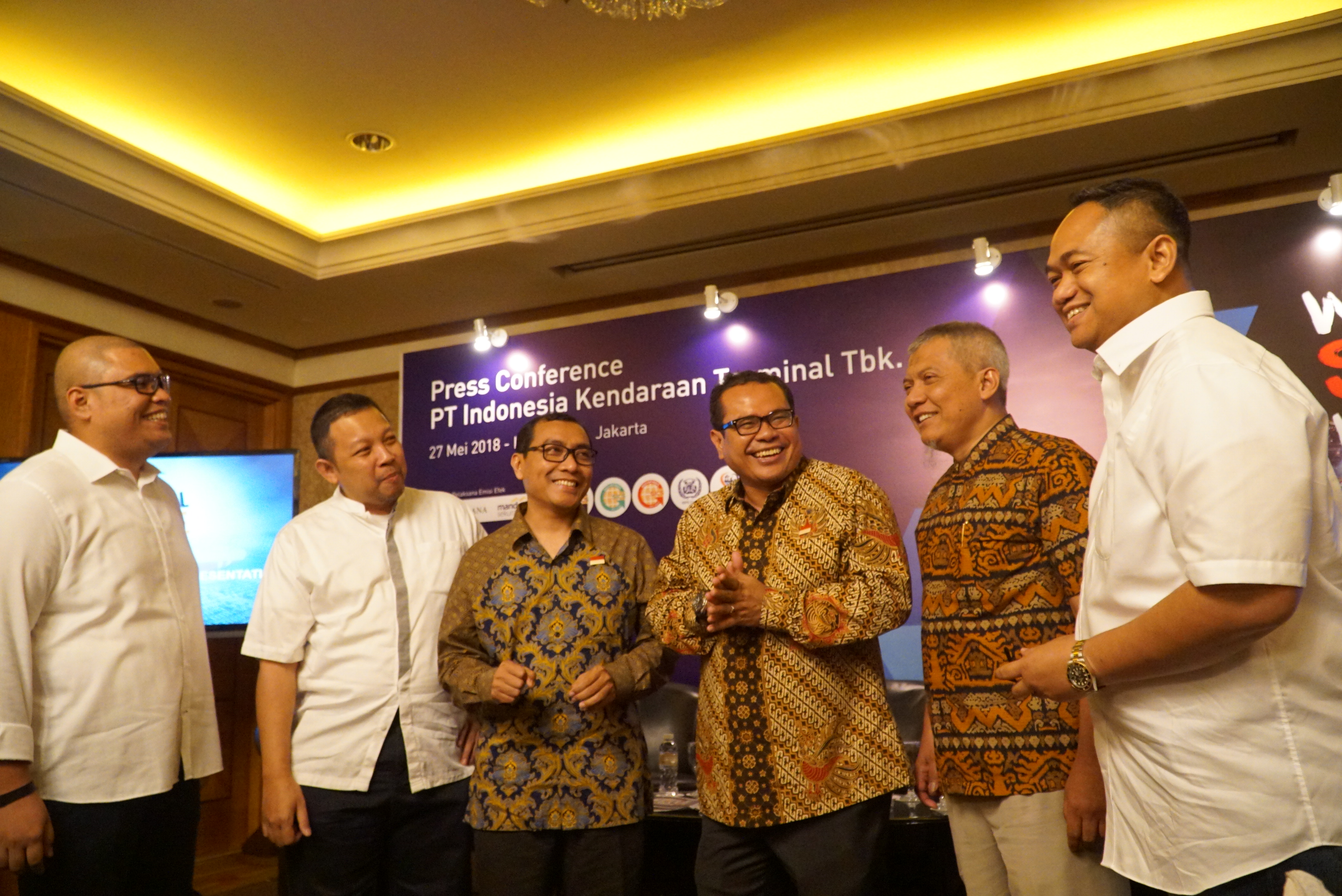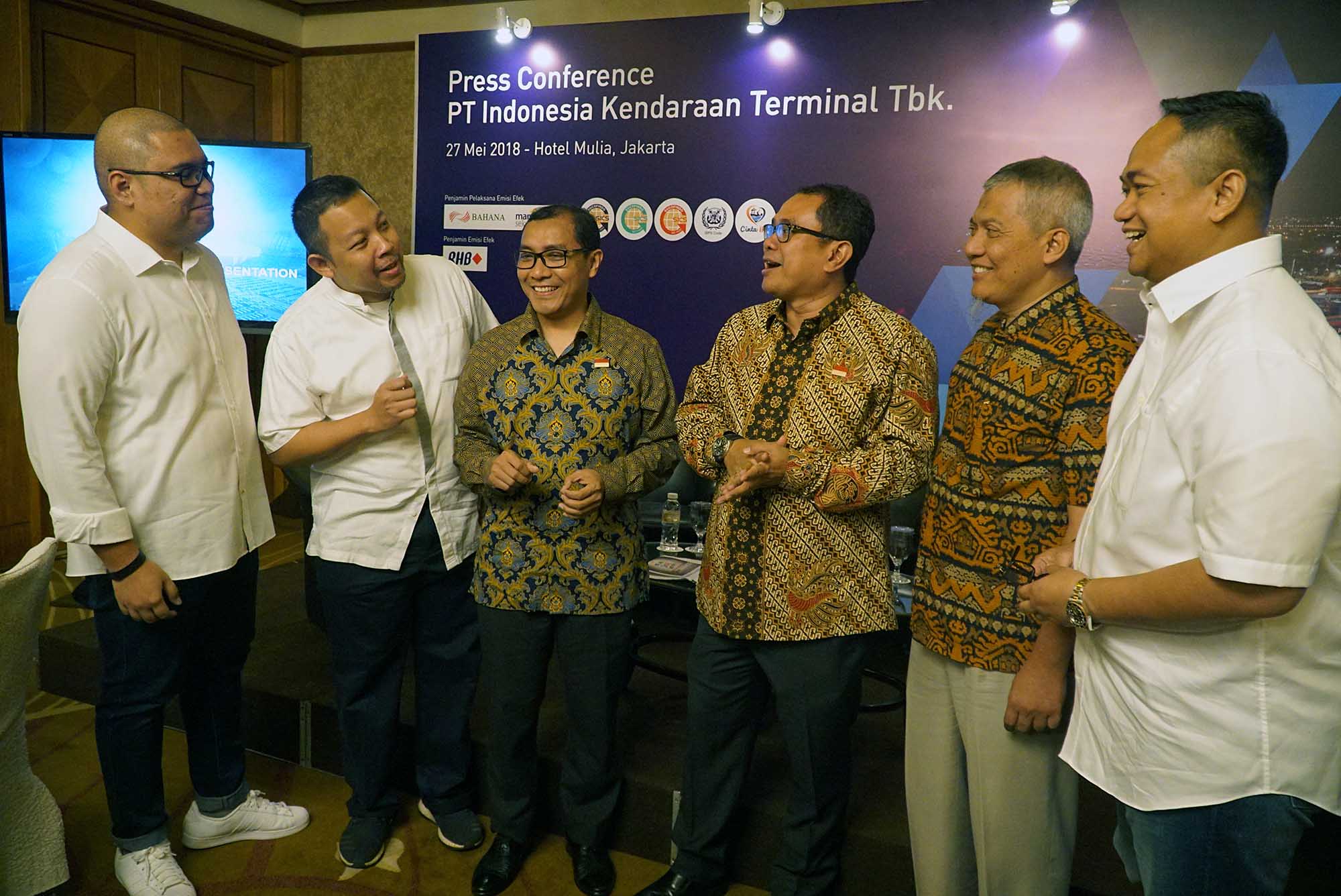 Dari kiri ke kanan, Associate Director-Corporate Financa PT RHB Sekuritas Indonesia Bernardus Sumargo, Director PT Mandiri Sekuritas Primonanto Budiatmojo, Direktur Keuangan dan SDM PT Indonesia Kendaraan Terminal Tbk (IKT) Sugeng Mulyadi, Direktur Utama IKT Chiefy Adi Kusmargono, Direktur Komersial dan Pengembangan Bisnis Arief Isnawan, Presiden Direktur PT Bahana Sekuritas Feb Sumandar berbincang sebelum jumpa pers di Jakarta, Minggu (27/5). IKT yang dikenal juga sebagai IPC Car Terminal menawarkan sebanyak banyaknya 561.101.600 saham atau sebesar 30% dari modal ditempatkan dan disetor penuh perseroan melalui IPO. Anak perusahaan Pelindo II atau IPC akan mengalokasikan 50% dana hasil IPO untuk pengembangan dan 50% untuk modal kerja. IKT menyediakan terminal yang disiapkan tak hanya untuk mobil melainkan alat berat, truk, bus dan suku cadang di atas lahan seluas 31 hektare dengan kapasitas 700.000 unit kendaraan per tahun. AKTUAL/Eko S Hilman