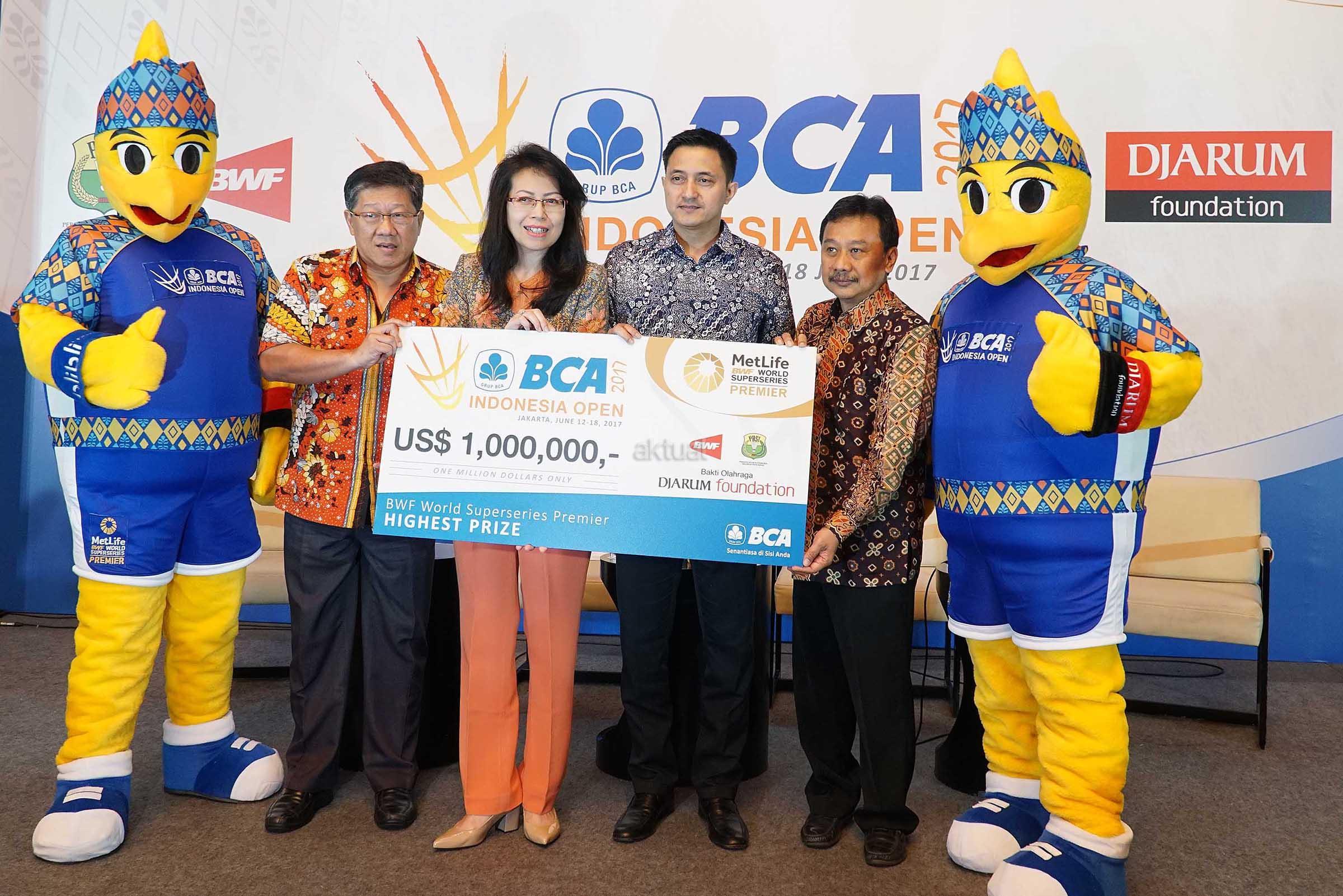 Panitia Pelaksana BCA Indonesia Open Superseries Premier (BIOSSP) 2017 Yoppy Rosimin (kiri), Executive VP CSR Bank BCA Inge Setiawati (kedua kiri), Kasubid Humas dan Media PP PBSI Ricky Soebagdja (kedua kanan) dan Manajer Komunikasi Bakti Olahraga Djarum Foundation Budi Darmawan (kanan) menunjukkan total hadiah satu juta dolar Amerika dari kejuaraan bulutangkis tersebut di Jakarta, Senin (22/5). BIOSSP 2017 bakal digelar pada 12-18 Juni 2017 di Jakarta Convention Center dengan diikuti 310 atlet dari 21 negara. AKTUAL/Eko S Hilman