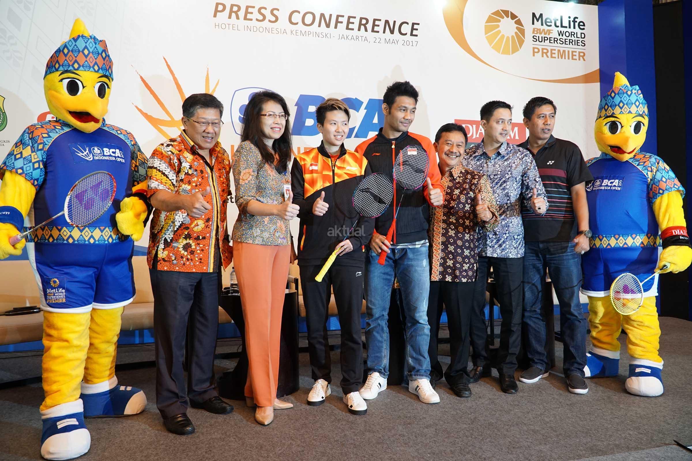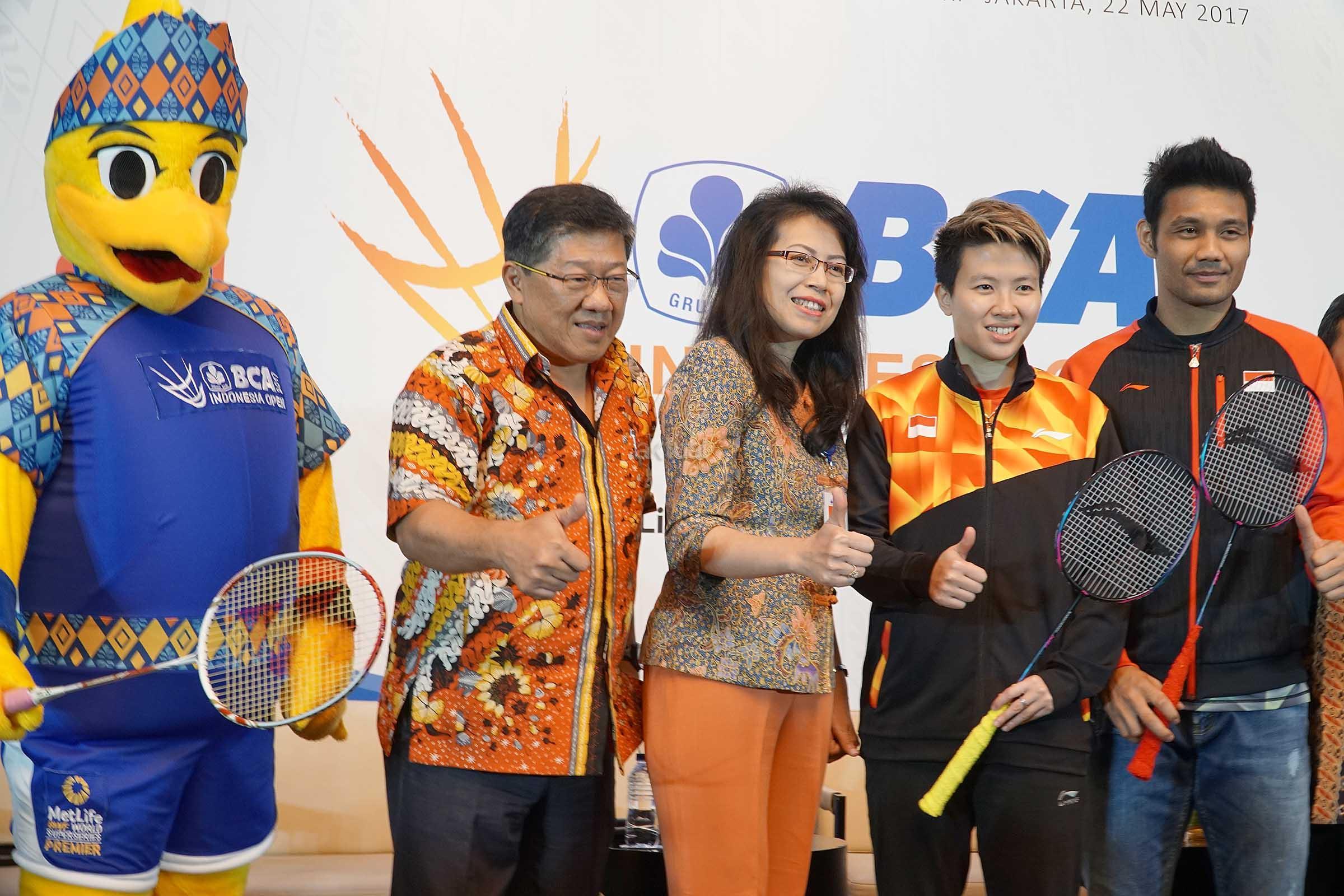 Panitia Pelaksana BCA Indonesia Open Superseries Premier (BIOSSP) 2017 Yoppy Rosimin (kiri), Executive VP CSR Bank BCA Inge Setiawati (kedua kiri),Pebulutangkis Liliyana Natsir (kiri) dan Barry Anggriawan (kanan) berfoto usai konferensi pers penyelenggaraan BCA Indonesia Open Superseries Premier (BIOSSP) 2017 di Jakarta, Senin (22/5). BIOSSP 2017 bakal digelar pada 12-18 Juni 2017 di Jakarta Convention Center dengan diikuti 310 atlet dari 21 negara. AKTUAL/Eko S Hilman