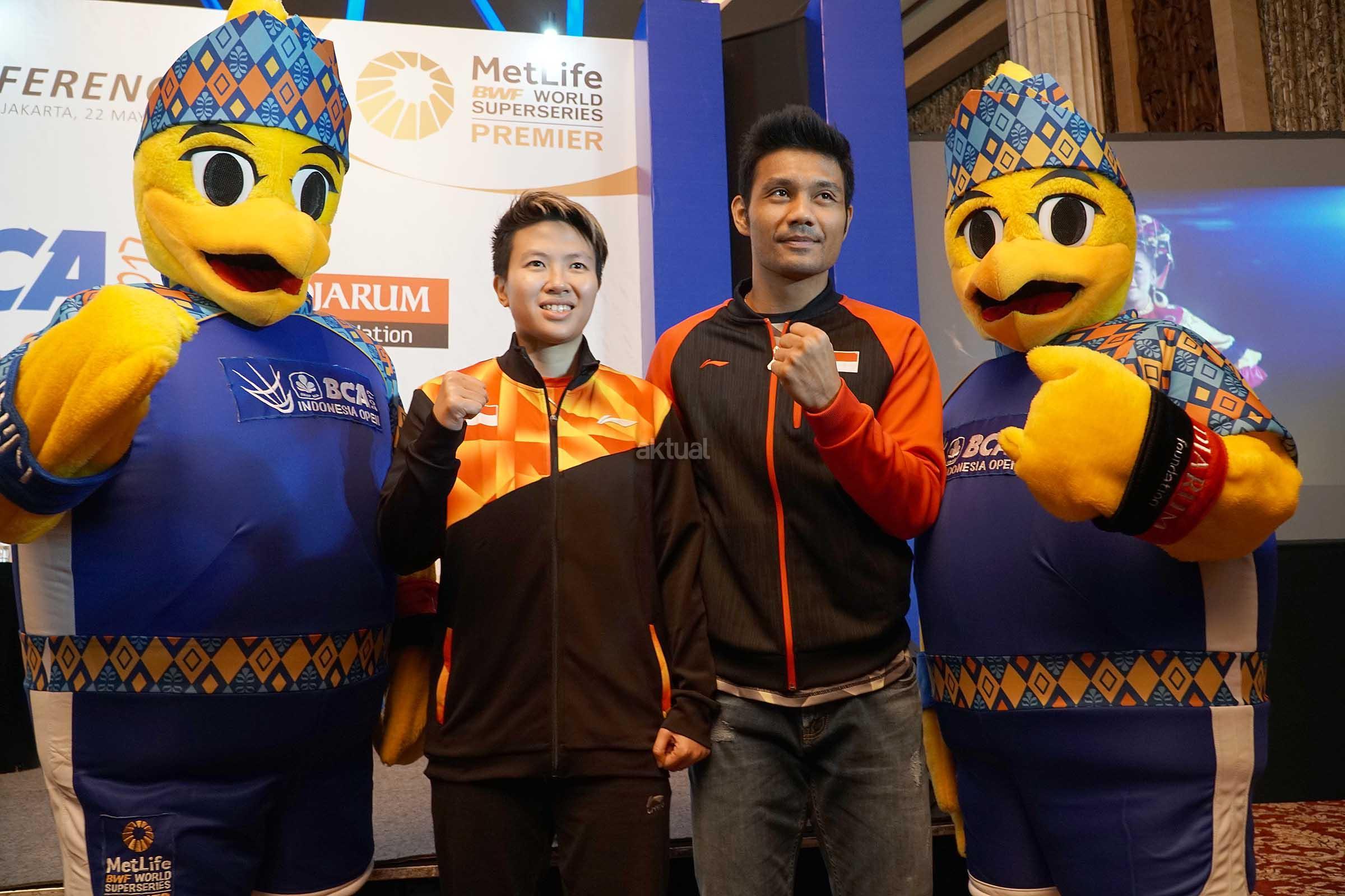 Pebulutangkis Liliyana Natsir (kiri) dan Barry Anggriawan (kanan) berfoto usai konferensi pers penyelenggaraan BCA Indonesia Open Superseries Premier (BIOSSP) 2017 di Jakarta, Senin (22/5). BIOSSP 2017 bakal digelar pada 12-18 Juni 2017 di Jakarta Convention Center dengan diikuti 310 atlet dari 21 negara. AKTUAL/Eko S Hilman