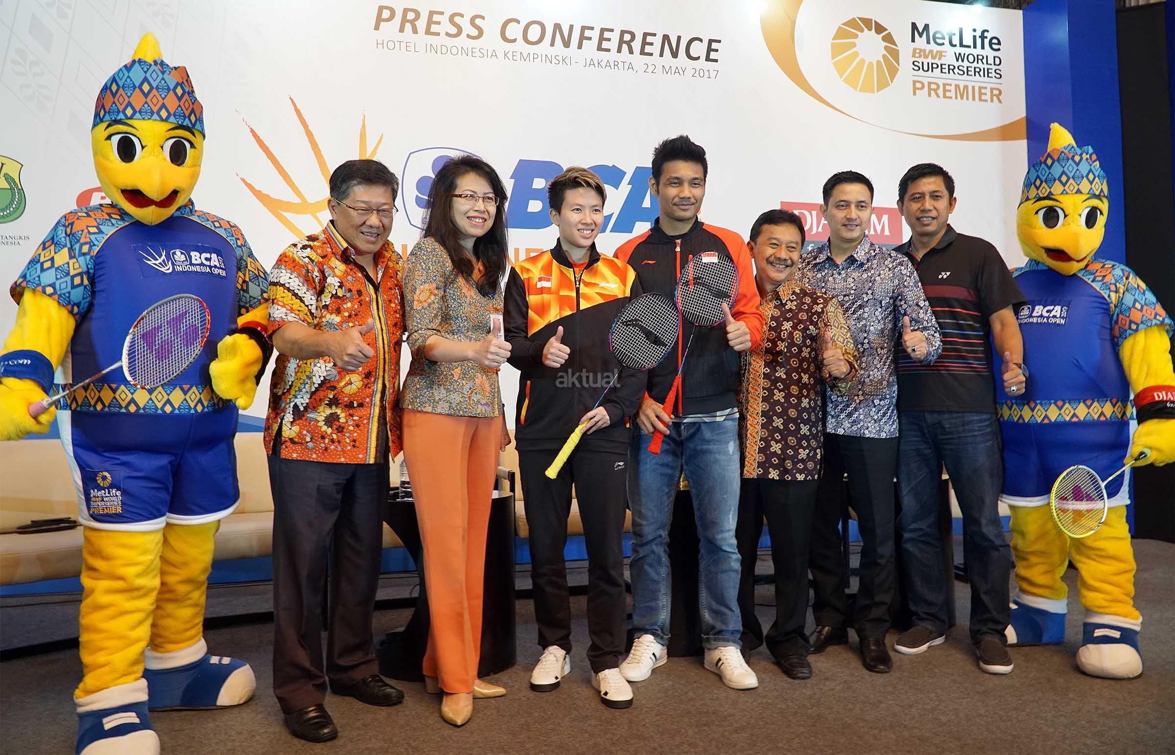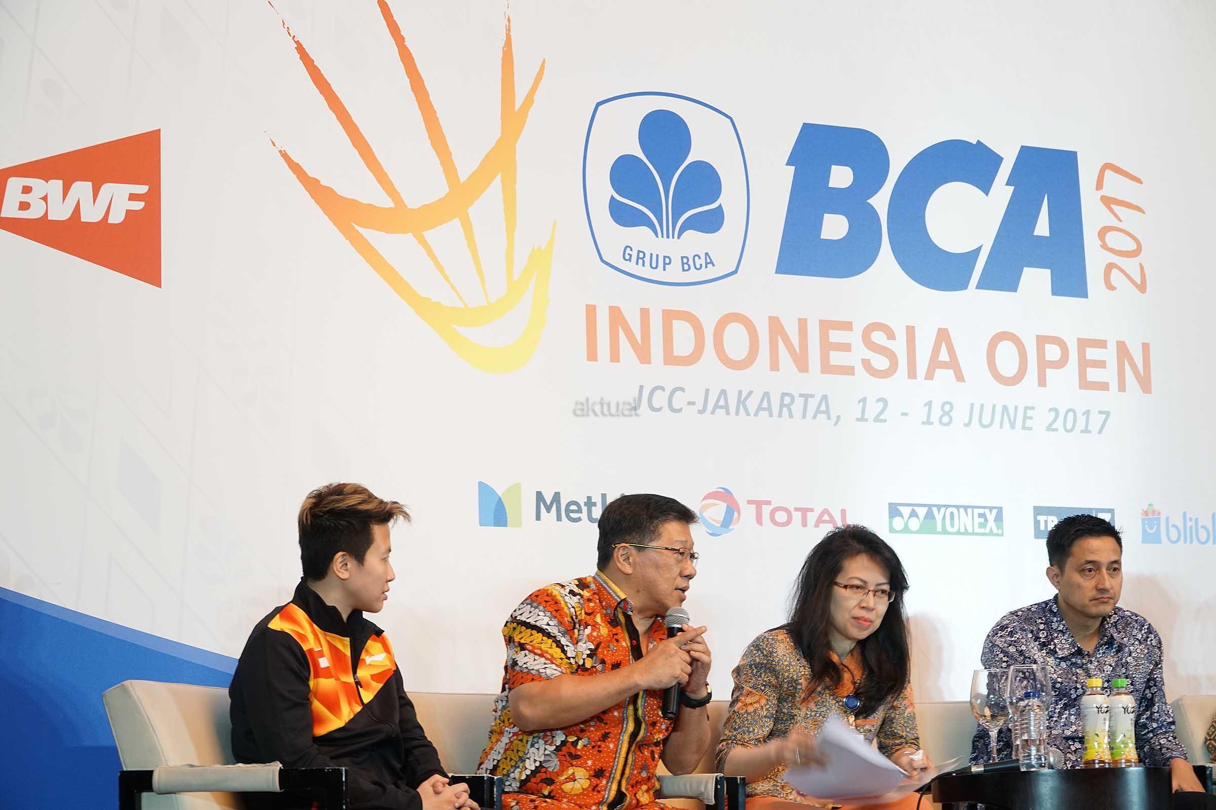 Panitia Pelaksana BCA Indonesia Open Superseries Premier (BIOSSP) 2017 Yoppy Rosimin (kedua kiri), Executive VP CSR Bank BCA Inge Setiawati (kedua kanan),Pebulutangkis Liliyana Natsir (kiri) dan Kasubid Humas dan Media PP PBSI Ricky Soebagdja saat konferensi pers penyelenggaraan BCA Indonesia Open Superseries Premier (BIOSSP) 2017 di Jakarta, Senin (22/5). BIOSSP 2017 bakal digelar pada 12-18 Juni 2017 di Jakarta Convention Center dengan diikuti 310 atlet dari 21 negara. AKTUAL/Eko S Hilman