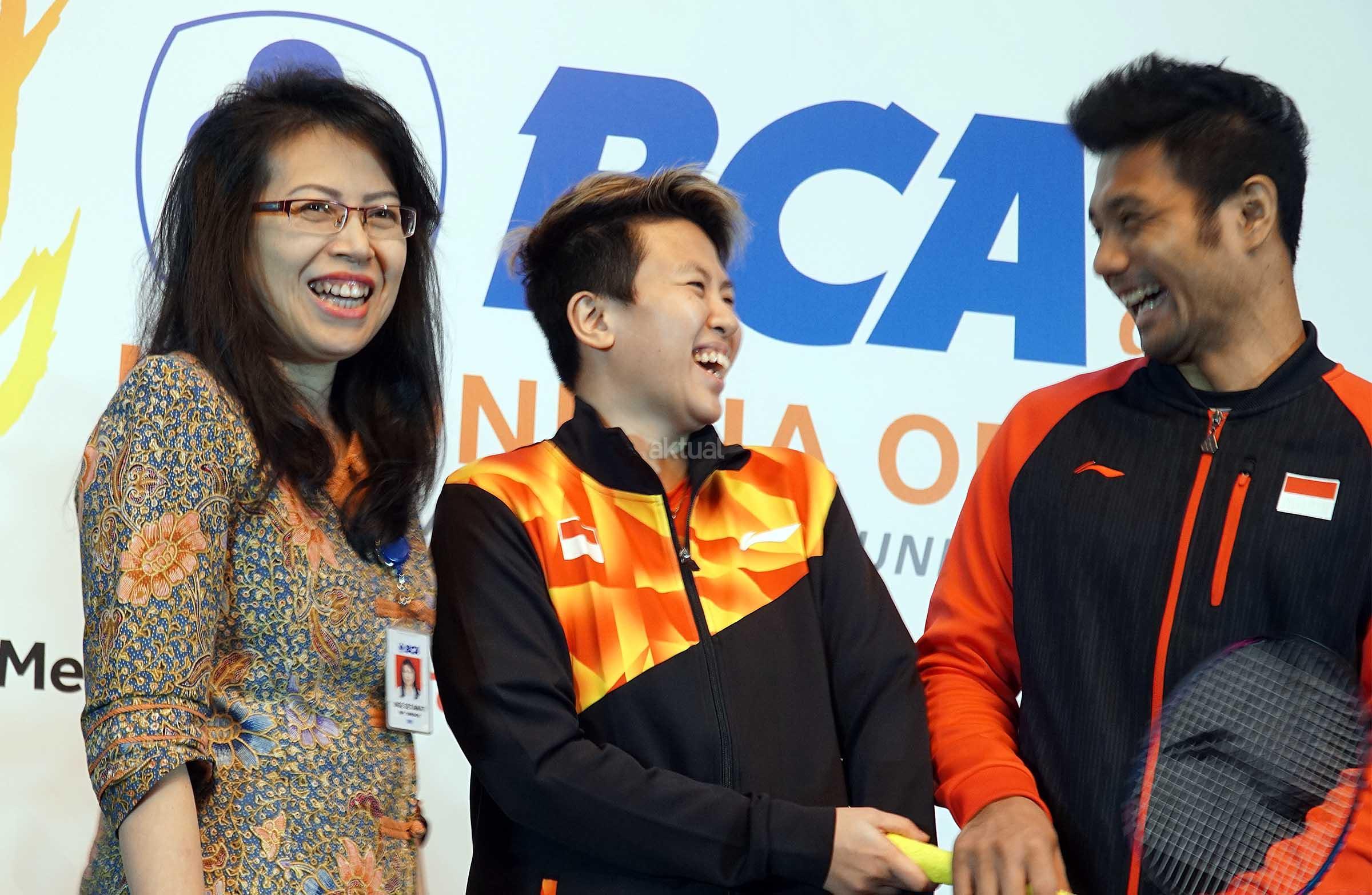 Executive VP CSR Bank BCA Inge Setiawati (kiri) bersama Pebulutangkis Liliyana Natsir (tengah) dan Barry Anggriawan (kanan) berfoto usai konferensi pers penyelenggaraan BCA Indonesia Open Superseries Premier (BIOSSP) 2017 di Jakarta, Senin (22/5). BIOSSP 2017 bakal digelar pada 12-18 Juni 2017 di Jakarta Convention Center dengan diikuti 310 atlet dari 21 negara. AKTUAL/Eko S Hilman