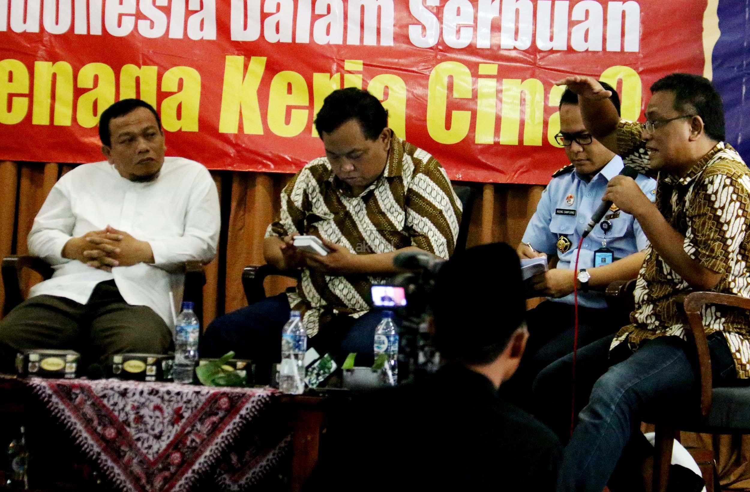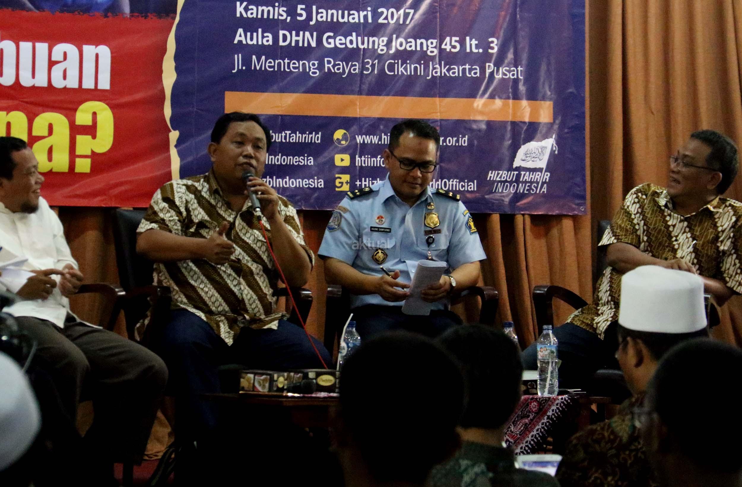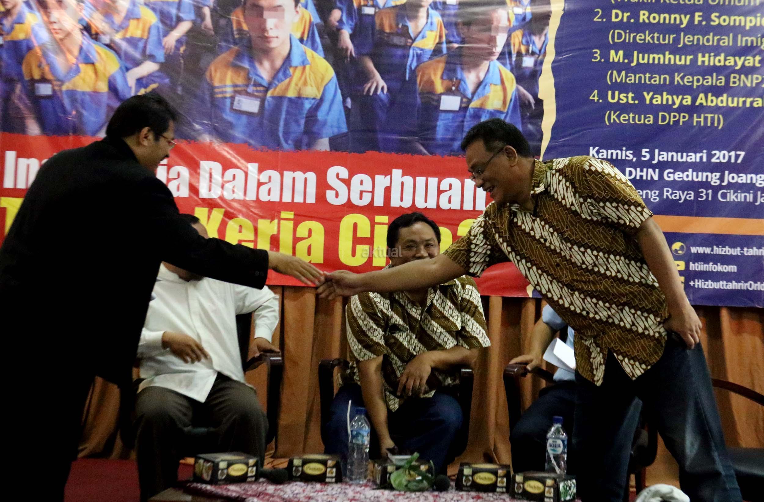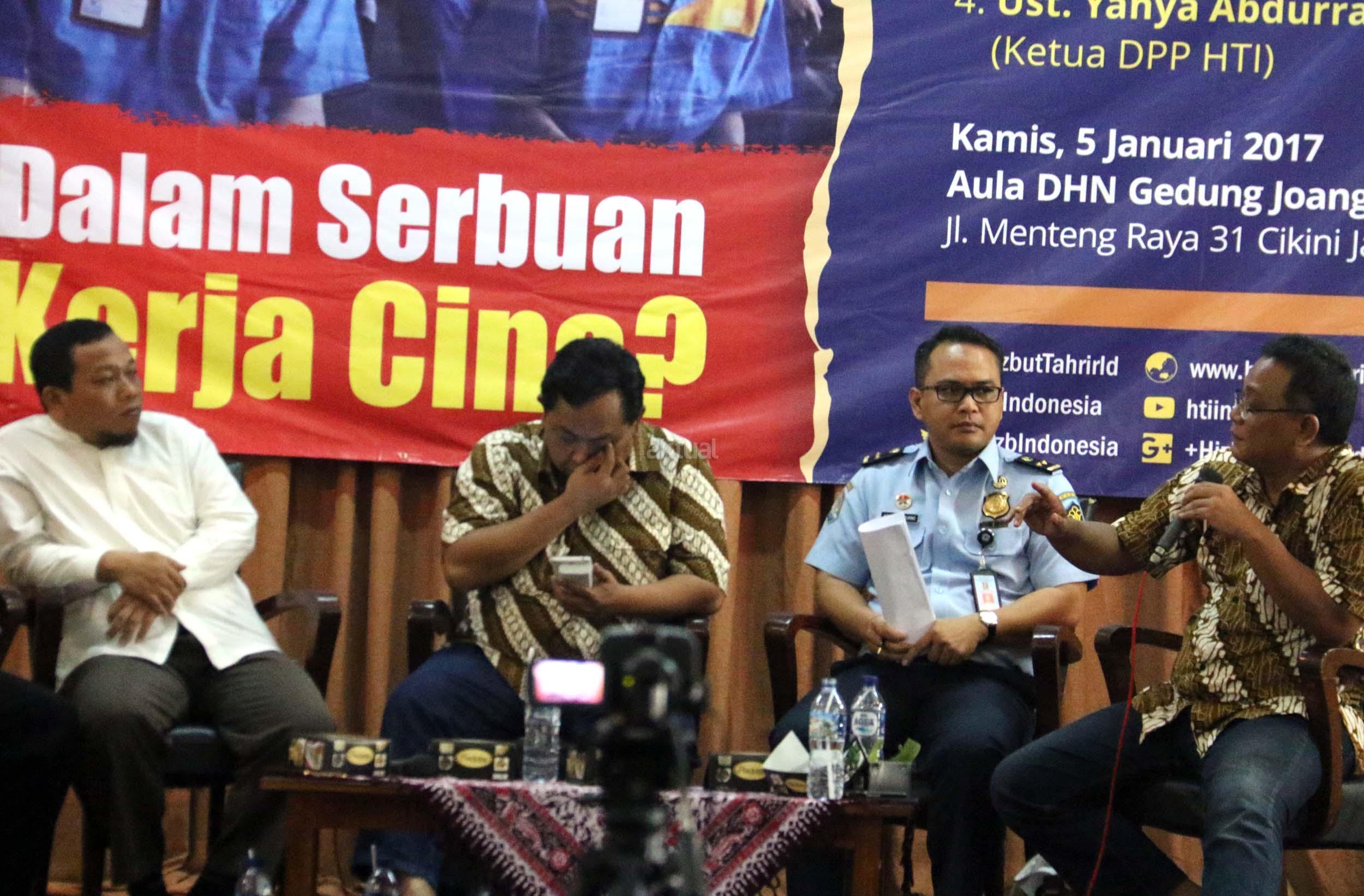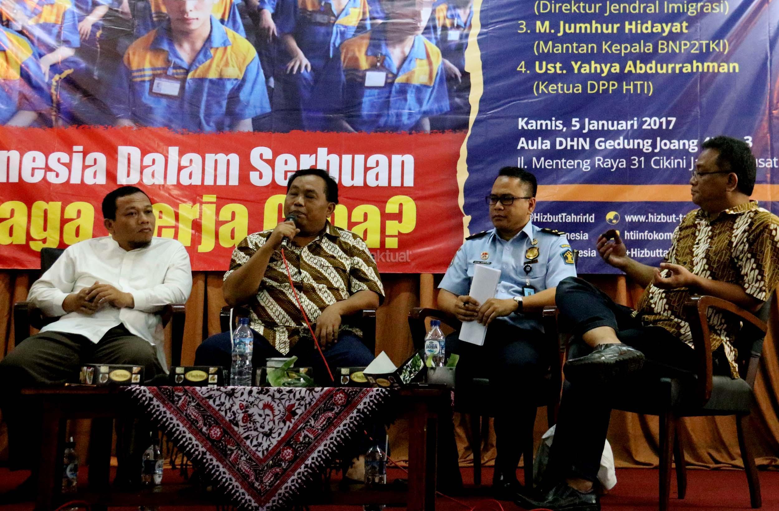 Kiri-kanan; Ketua DPP Hizbut Tahrir Indonesia (HTI) Ust. Yahya Abdurahman, Wakil Ketua Umum Partai Gerindra Fx. Arief Poyouno, Kabag Humas Direktorat Imigrasi Agung Sampurno, Mantan Kepala BNP2TKI M. Jumhur Hidayat, saat hadir dalam forum diskusi Hizbut Tahrir Indonesia, di Jakarta, Kamis (5/1/2017). Forum diskusi publik Hizbut Tahrir Indonesia mengambil tema " Indonesia Dalam Serbuan Tenaga Kerja China. AKTUAL/Munzir