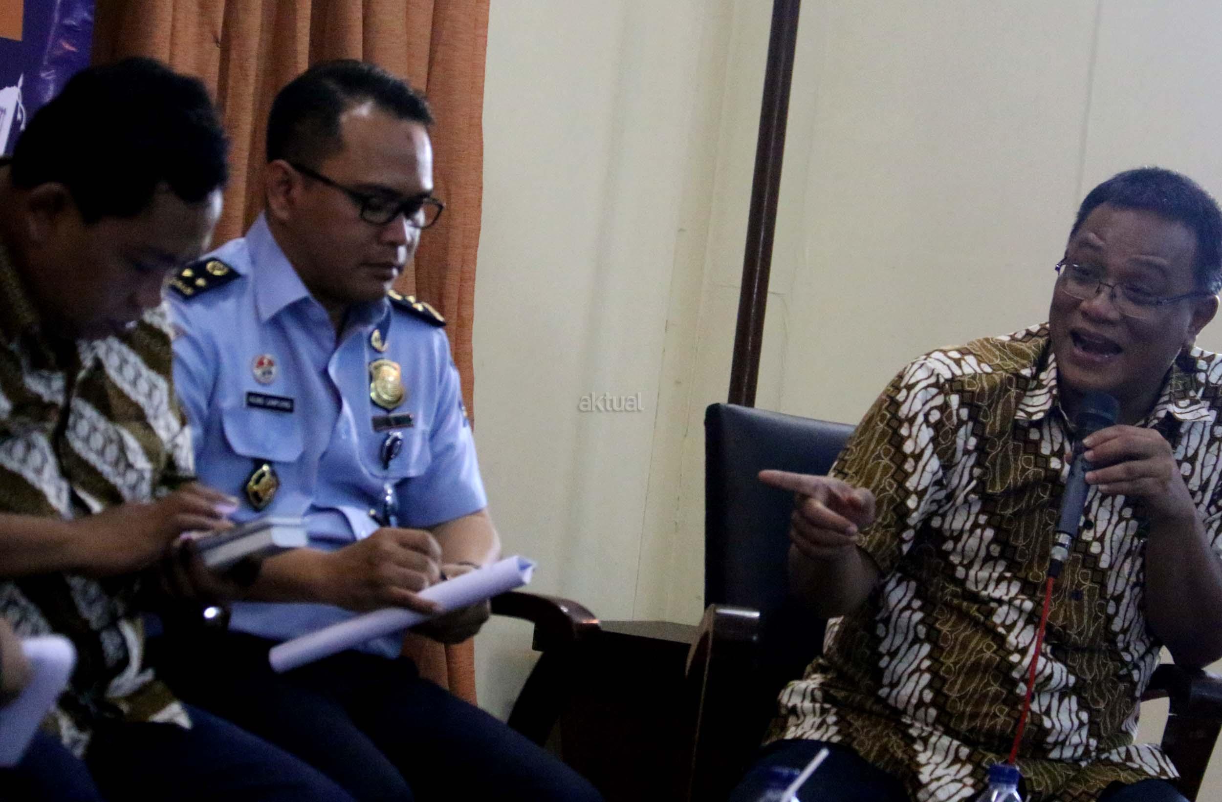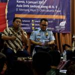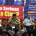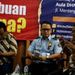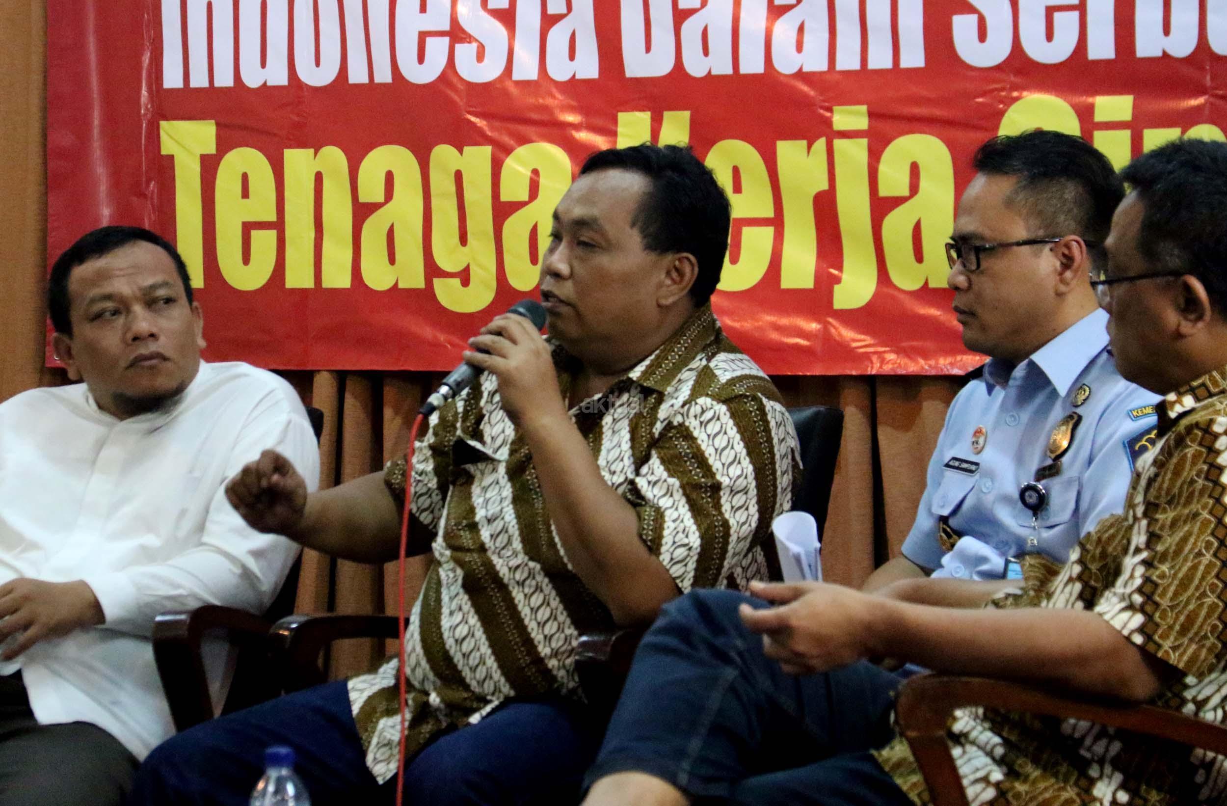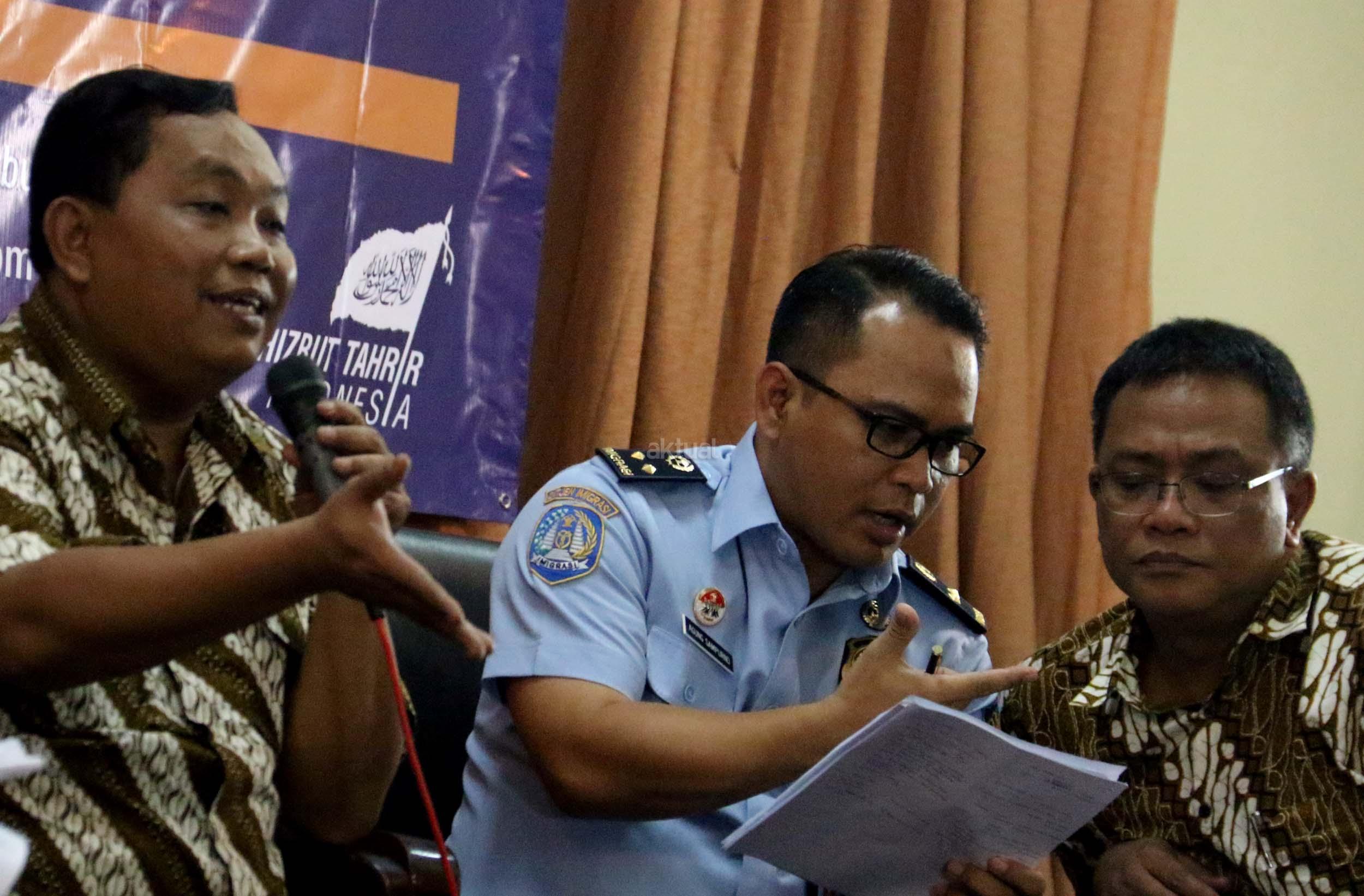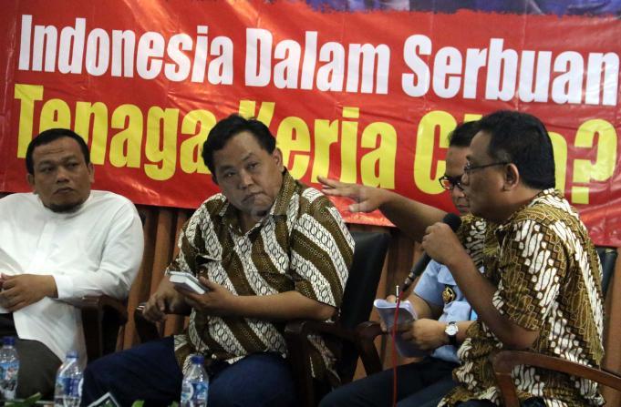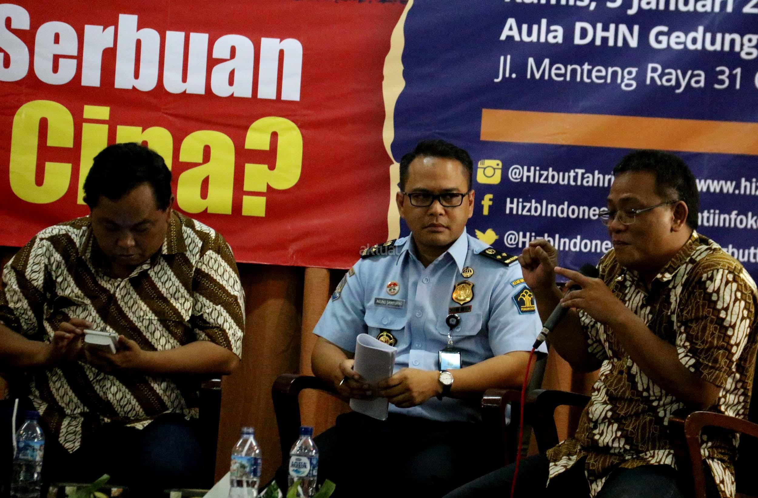 Kiri-kanan; Ketua DPP Hizbut Tahrir Indonesia (HTI) Ust. Yahya Abdurahman, Wakil Ketua Umum Partai Gerindra Fx. Arief Poyouno, Kabag Humas Direktorat Imigrasi Agung Sampurno, Mantan Kepala BNP2TKI M. Jumhur Hidayat, saat hadir dalam forum diskusi Hizbut Tahrir Indonesia, di Jakarta, Kamis (5/1/2017). Forum diskusi publik Hizbut Tahrir Indonesia mengambil tema " Indonesia Dalam Serbuan Tenaga Kerja China. AKTUAL/Munzir