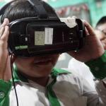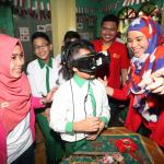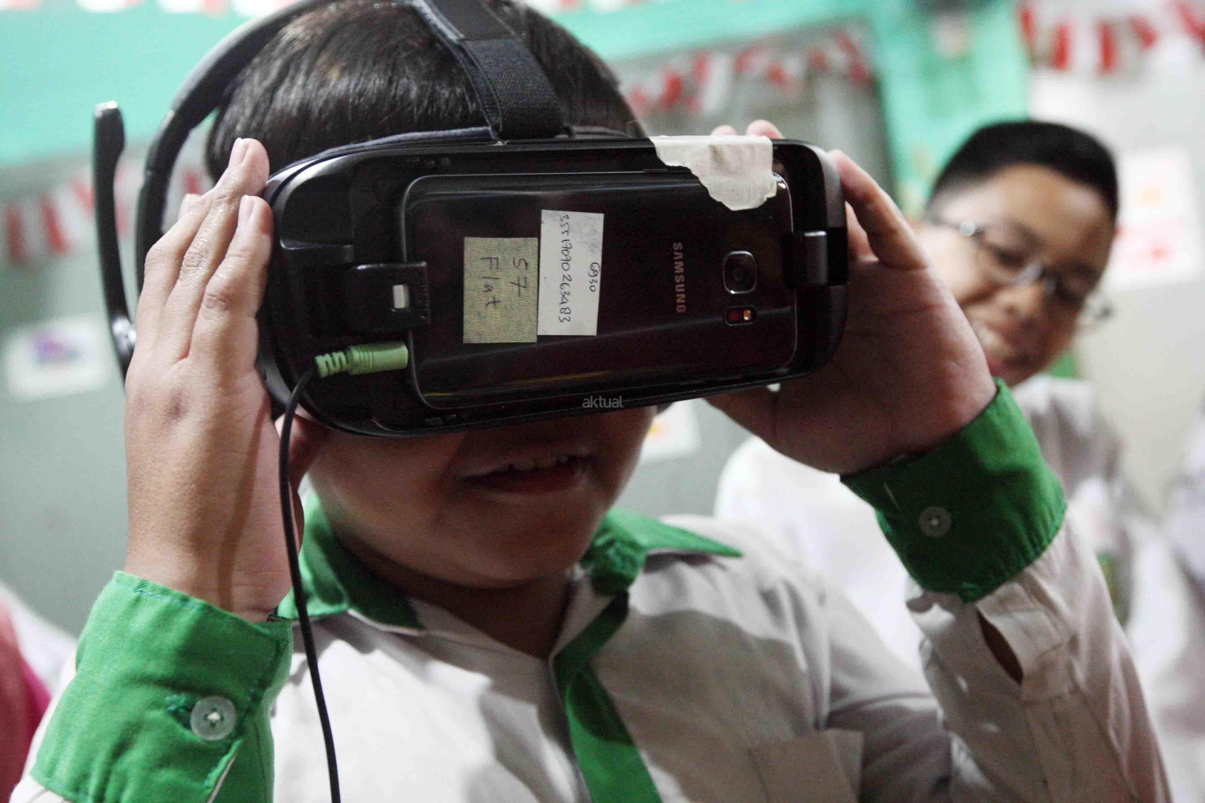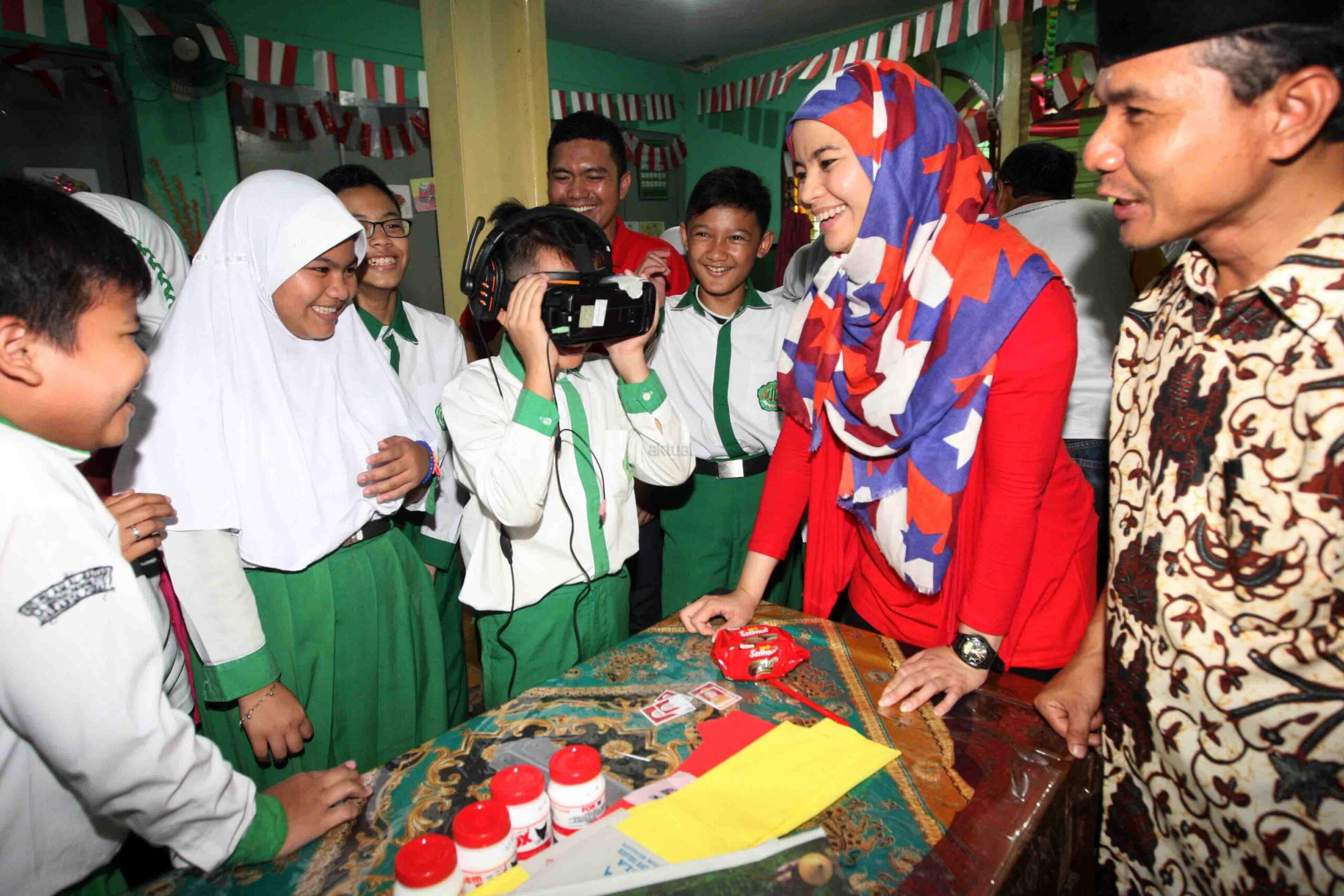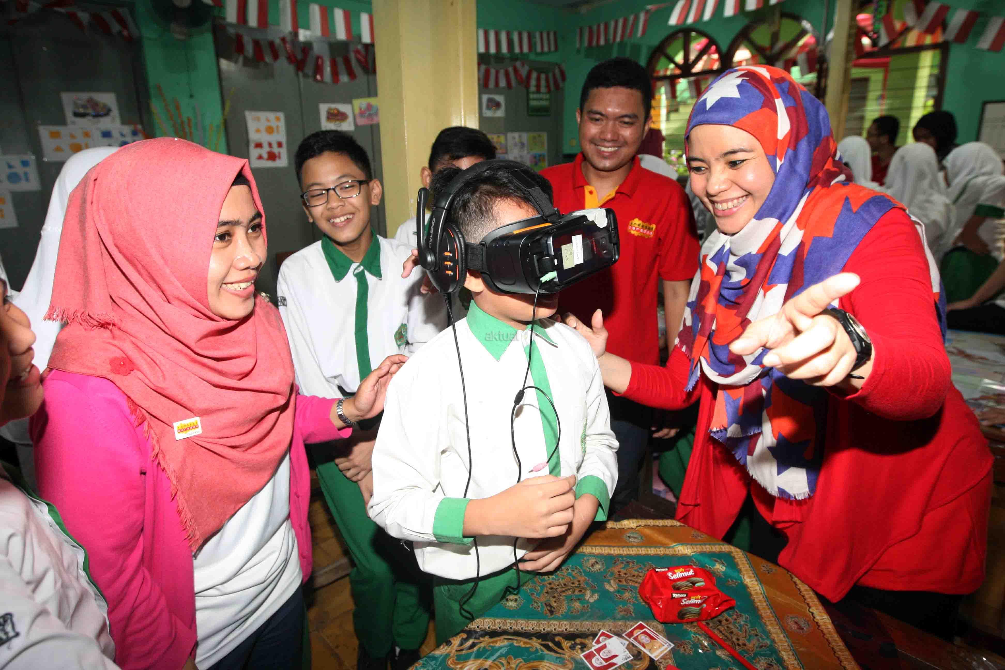 Group Head Corporate Communications Indosat Ooredoo Deva Rachman (kanan) didampingi Kepala Sekolah SD Islam Al-Badar Abdul Rojak (kanan) melihat seorang siswa memainkan game virtual di Sekolah Dasar Islam Al-Bandar, Jakarta, Kamis (22/12/2016). Indosat melalui program charity-nya bekerja sama dengan Lembaga Kemanusiaan Nasional PKPU membuat sebuah program yang berisi rangkaian kegiatan di sekolah. Rangkaian kegiatan meliputi dua kegiatan utama, yaitu benah fisik sekolah dan kelas inspirasi. AKTUAL/Eko S Hilman