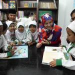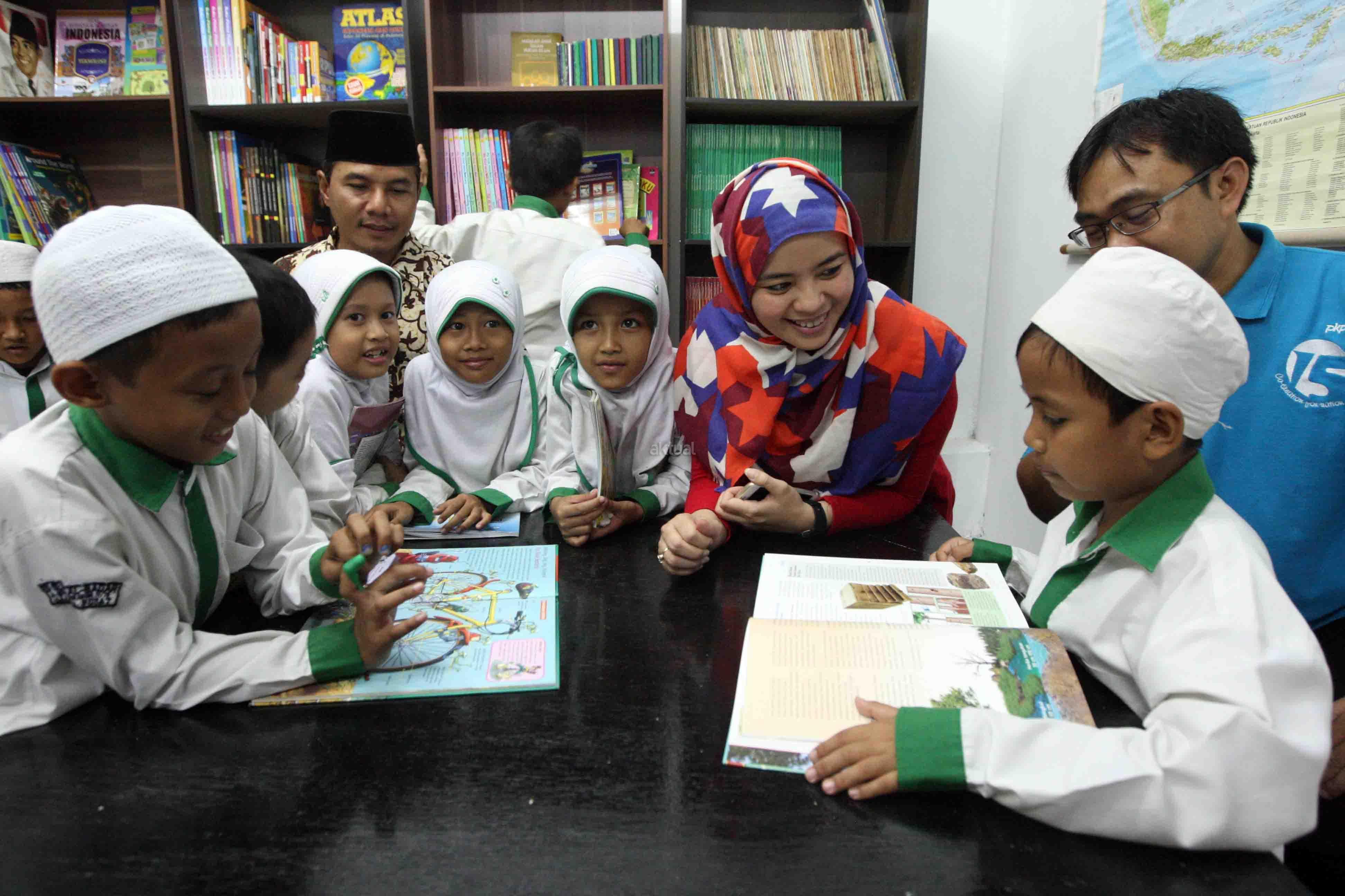 Group Head Corporate Communications Indosat Ooredoo Deva Rachman (kedua kanan) didampingi Kepala Sekolah SD Islam Al-Badar Abdul Rojak (kanan) melihat seorang siswa memainkan game virtual di Sekolah Dasar Islam Al-Bandar, Jakarta, Kamis (22/12/2016). Indosat melalui program charity-nya bekerja sama dengan Lembaga Kemanusiaan Nasional PKPU membuat sebuah program yang berisi rangkaian kegiatan di sekolah. Rangkaian kegiatan meliputi dua kegiatan utama, yaitu benah fisik sekolah dan kelas inspirasi. AKTUAL/Eko S Hilman