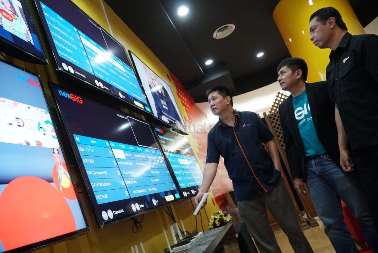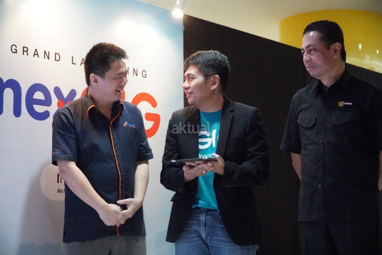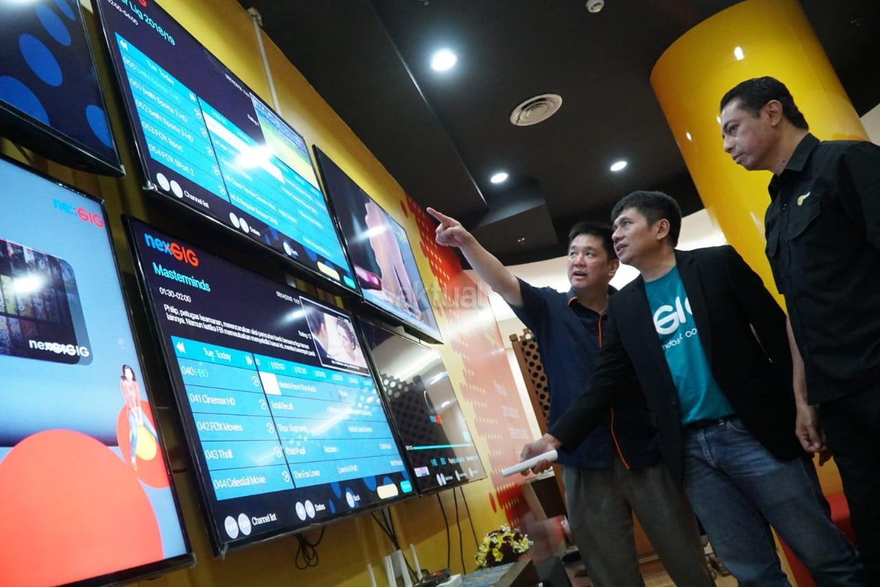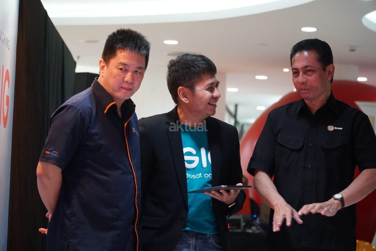 Technology Director IM2 Yune Marketatmo (tengah) berbincang dengan Presiden Direktur PT Mediatama Anugrah Citra (NexMedia) Junus Koswara (kiri) dan Direktur PT Mediatama Televisi Rachmat Akbari berbincang saat peluncuran layanan home IPTV “nexGIG” di Jakarta, Selasa (14/8). nexGIG memberikan fasilitas kecepatan bandwidth yang terpisah antara bandwidth IPTV dan bandwidth internet sehingga network IPTV tidak mempengaruhi kecepatan internet pelanggan, serta menyiarkan pertandingan sepakbola internasional. AKTUAL/Eko S Hilman