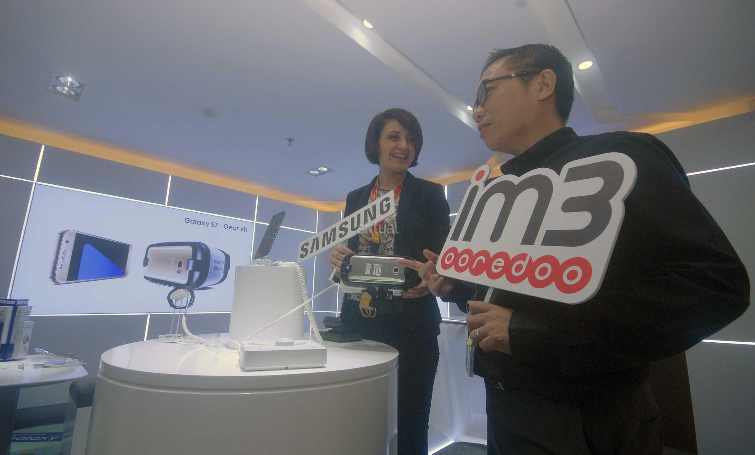 Direktur Ritel Channel Samsung,Bingar Egidius Situmorang (kanan) berbincang dengan Group Head Retail & Device Management Indosat ooredoo, Radhia Bendhifi saat meninjau Samsung Galaxy Studio Experience Center pertama dan terlengkap di operator channel di indonesia pada gerai Indosat Ooredoo sarinah,Jakarta, usai pembukaaannya Rabu (5/10). Samsung Galaxy Studio Experience Center yang desain dan tata ruangnya dilengkapi beragam fasilitas bernuansa digital lifestyle experience tersebut, dapat dinikmati pelanggan, seperti layar besar dengan tampilan hiburan video streaming dari iflix serta music streaming melalui spotify pada smartphone samsung dengan stream On.Hal lainnya, layanan yang mengusung konsep one stop service ini menyediakan pula samsung terbaru yang dibundling dengan paket data yang transparan di jaringan tercepat di Indonesia, serta berbagai aplikasi konten digital yang semakin memudahkan pelanggan mengakses dunia digital. Aktual/Eko S Hilman
