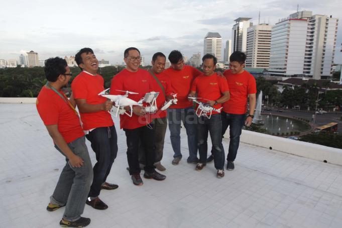 President Director & CEO Indosat Ooredoo, Alexander Rusli (tengah) saat mencoba drone, Jakarta, Jumat (13/1). Indosat bersama Multirotor Pilots Community berbagi pengetahuan dan berdiskusi seputar teknologi drone, kerjasama tersebut diharapkan memunculkan inovasi- inovasi yang bisa dirasakan oleh pelanggan melalui pemanfaatan drone dan berkontribusi maksimal di peta bisnis digital. Pemanfaatan teknologi drone bagi perusahaan telekomunikasi dan digital seperti Indosat Ooredoo dapat difokuskan kepada pengembangan digital services. Sebagai contoh pengaplikasiannya yaitu pengiriman barang secara airborne, pembuatan virtual reality video sebagai alat pendidikan, bahkan untuk memproduksi 3D digital imaging yang dapat membantu proses inventori menara, jalur fiber optic serta infrastruktur. AKTUAL/Eko S Hilman