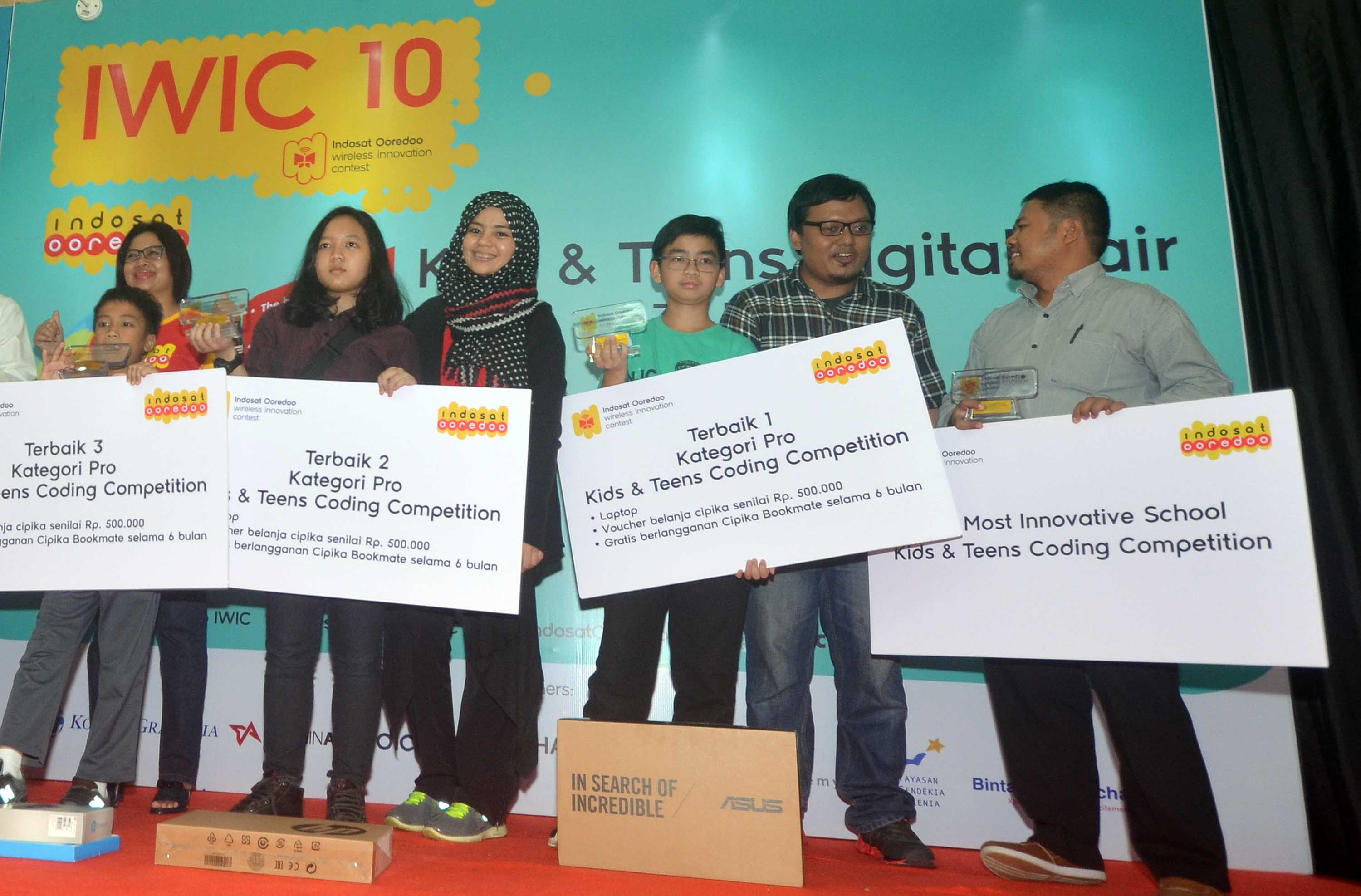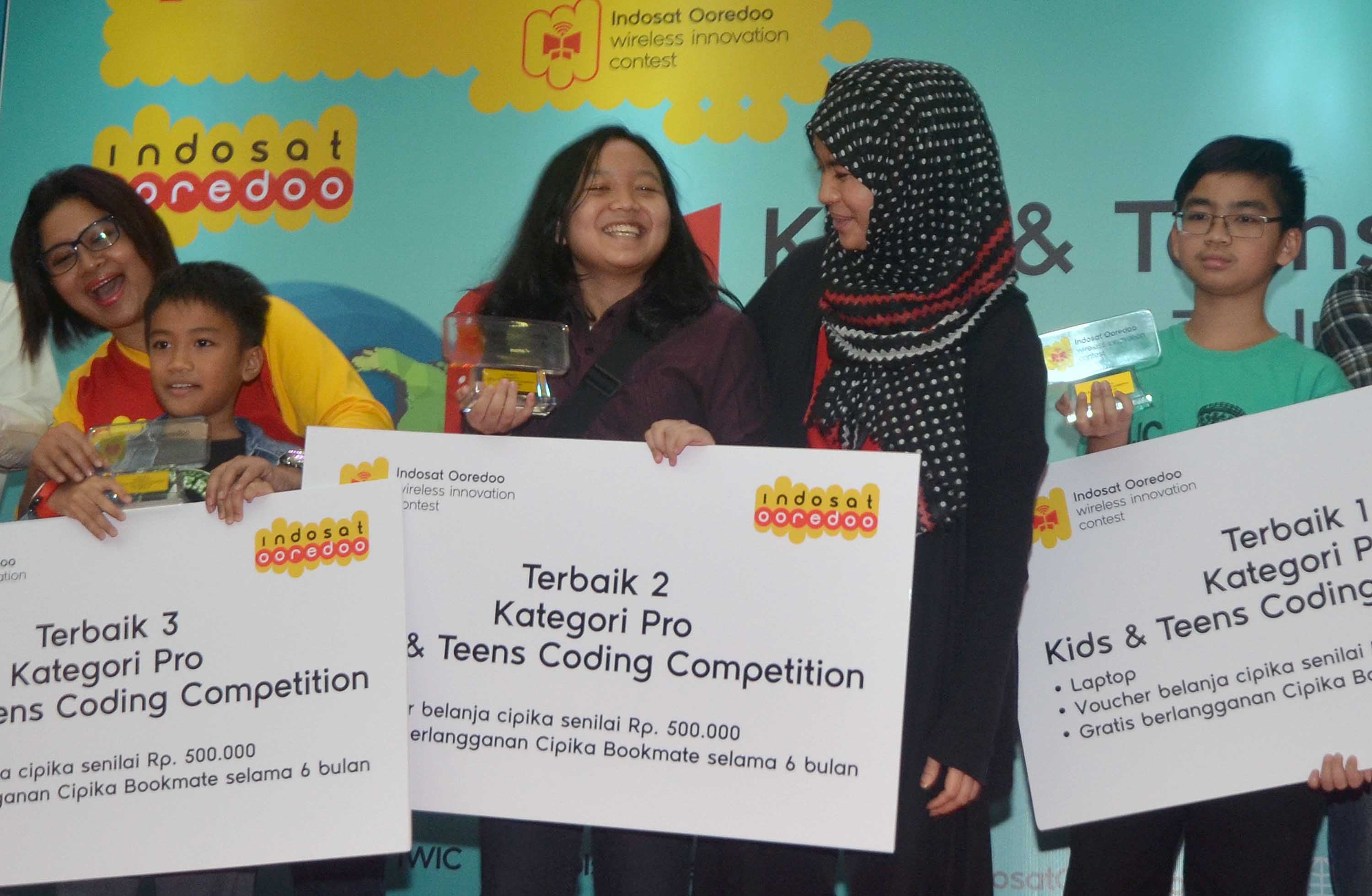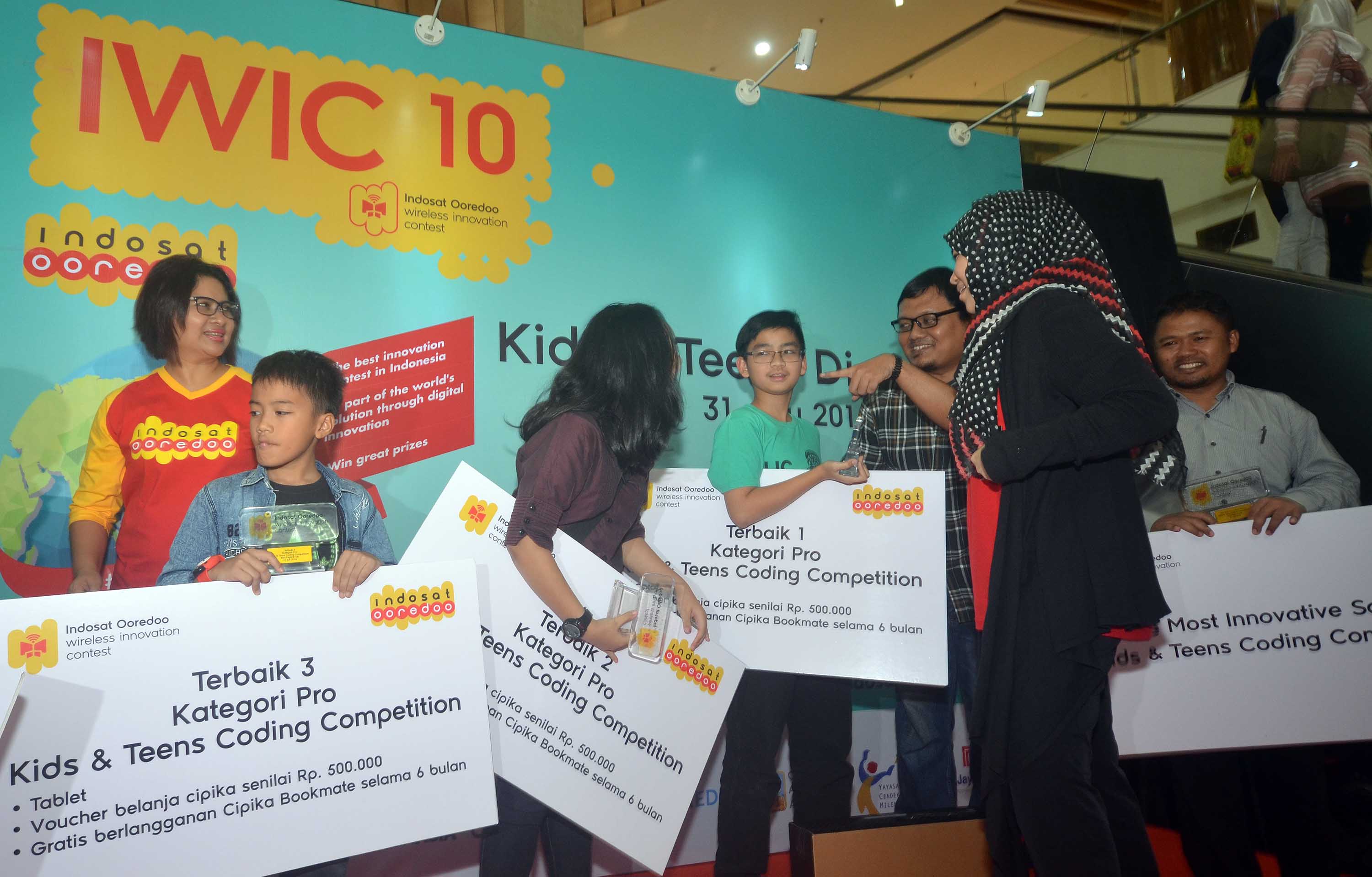 Chief Human Resources Officer Indosat Ooredoo, Ripy Mangkoessoebroto (kiri) bersama Group Head Corporate Communication Indosat Ooredoo, Deva Rachman (keempat dari kiri) berfoto bersama dengan para pemenang kompetisi aplikasi mobile Kids & Teens Digital Fair 2016 di Bintaro Xchange , Minggu (31/7). Indosat Ooredoo mewadahi Kreatiftas dunia digital melalui kegitan Kids & Teens Digital Fair 2016 yang merupakan bagian dari rangkaian Indosat Ooredoo Wireless Innovation Contest (IWIC) ke – 10. Saat ini, sekitar 80% anak anak Indonesia mengakses internet setiap harinya.Jika diliat dari arah perkembangan generasi ,sekitar 30 juta anak anak dan remaja sudah familiar dengan internet dan dunia digital.