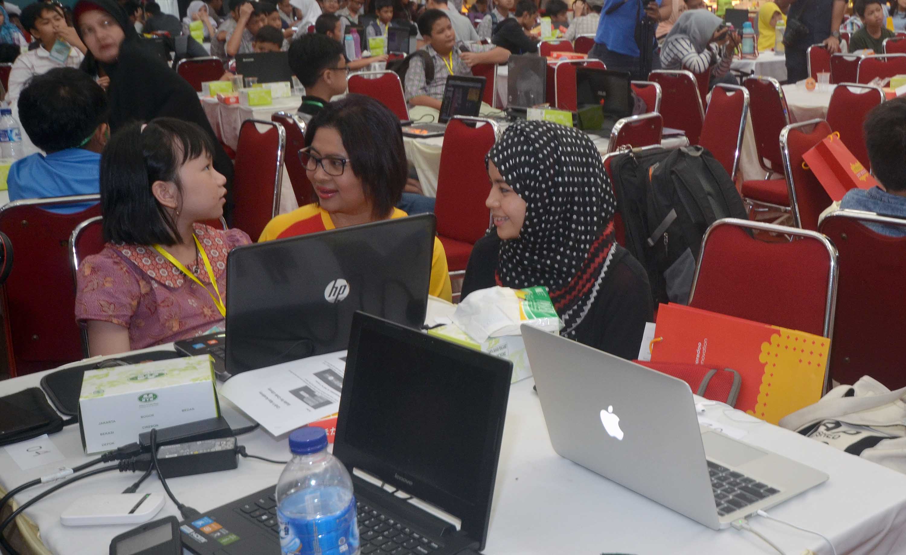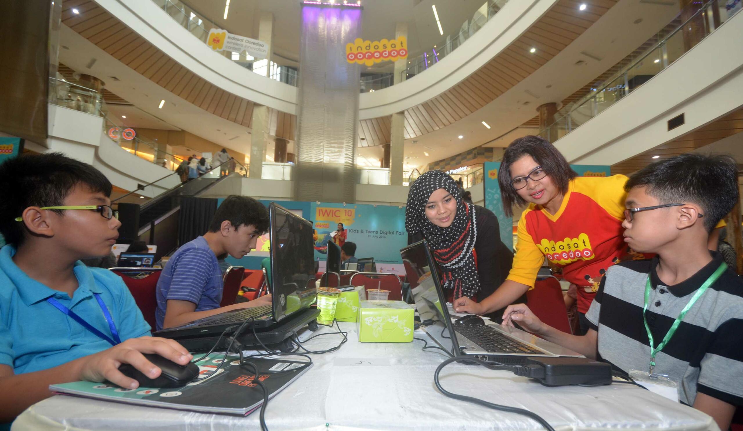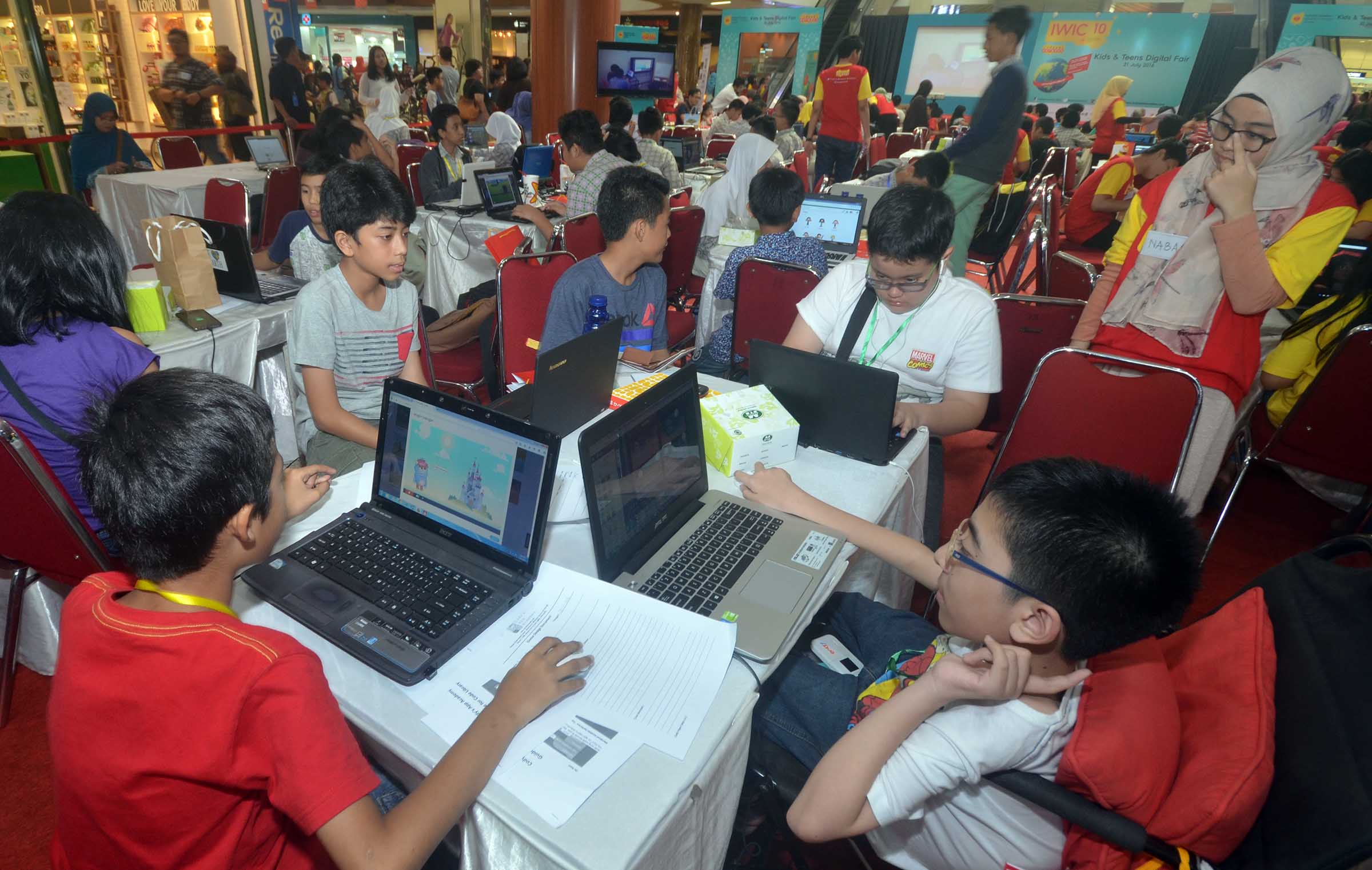 Suasana anak anak yang mengikuti kompetisi aplikasi mobile Kids & Teens Digital Fair 2016 di Bintaro Xchange , Minggu (31/7). Indosat Ooredoo mewadahi Kreatiftas dunia digital melalui kegitan Kids & Teens Digital Fair 2016 yang merupakan bagian dari rangkaian Indosat Ooredoo Wireless Innovation Contest (IWIC) ke – 10.