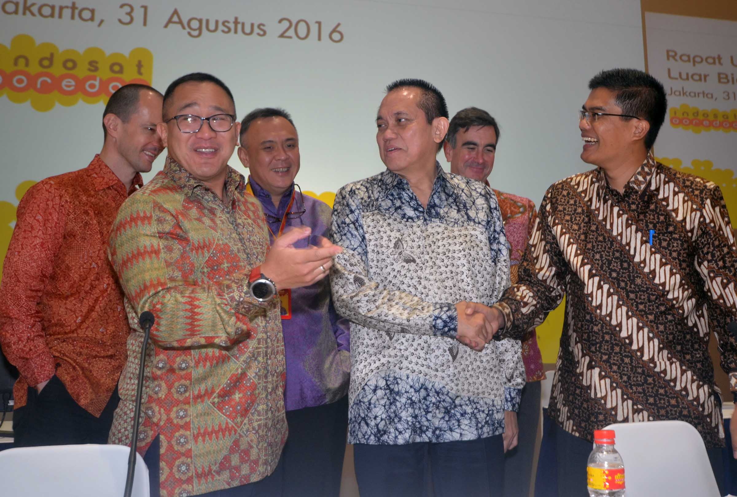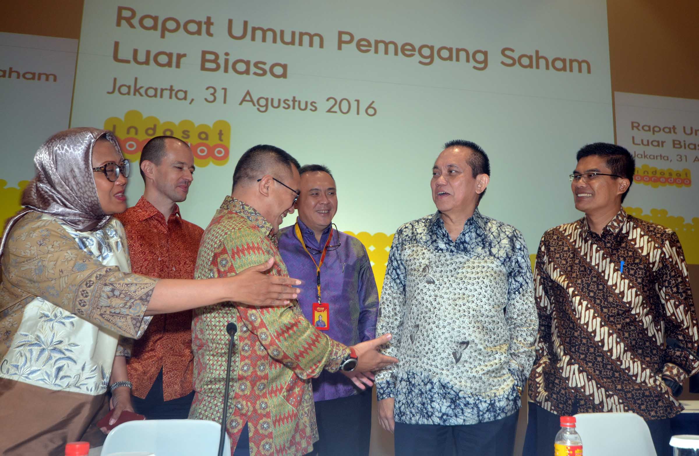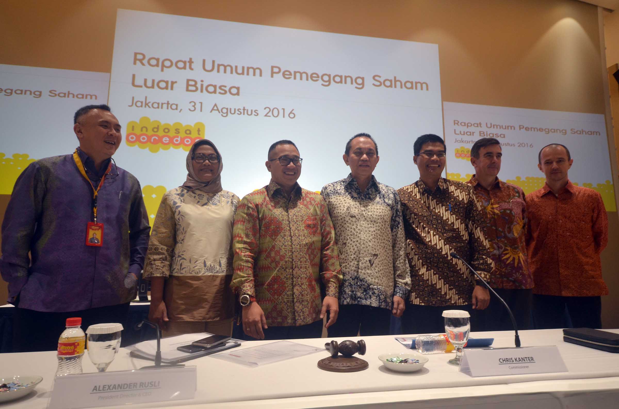 dari kiri ke kanan Direktur and Chief Sales and distribution officer PT Indosat Tbk,Joy wahyudi, Direkturand chief Wholesale and Enterprise Officer,Herfini Haryono,President Director,Alexander Rusli, Komisaris,Chris Kanter, Komisaris Independent, Wijayanto Samirin, Director and Chief Technology Officer,John M Thompson, serta Director and Chief Financial Officer, Caba Pinter berfoto bersama usai menutup Rapat Umum Pemegang Saham Luar Biasa (RUPSLB) Indosat Ooredoo di Jakarta, Rabu (31/8). RUPSLB PT Indosat Tbk (Indosat Ooredoo) memutuskan mengangkat Syed Maqbul Quader sebagai Komisaris Indipenden Perseroan menggantikan Richard Farnsworth Seney.