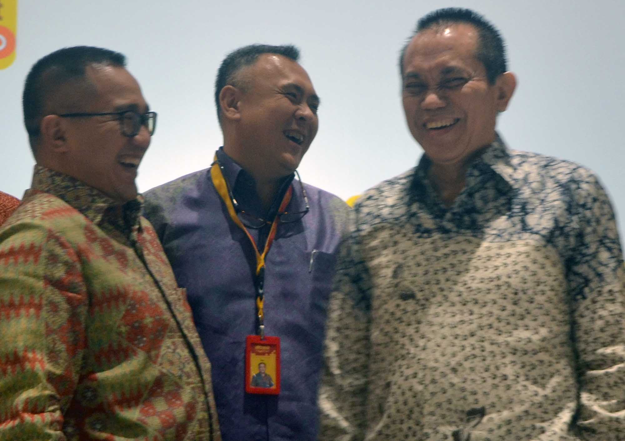 President Director & CEO Indosat Ooredoo Alexander Rusli ( kiri) berbincang dengan Komisaris Indosat Ooredoo Chris Kanter (kanan), dan Director&Chief Sales & Distribution Officer Joy Wahyudi (tengah)usai menutup Rapat Umum Pemegang Saham Luar Biasa (RUPSLB) Indosat Ooredoo di Jakarta, Rabu (31/8). RUPSLB PT Indosat Tbk (Indosat Ooredoo) memutuskan mengangkat Syed Maqbul Quader sebagai Komisaris Indipenden Perseroan menggantikan Richard Farnsworth Seney