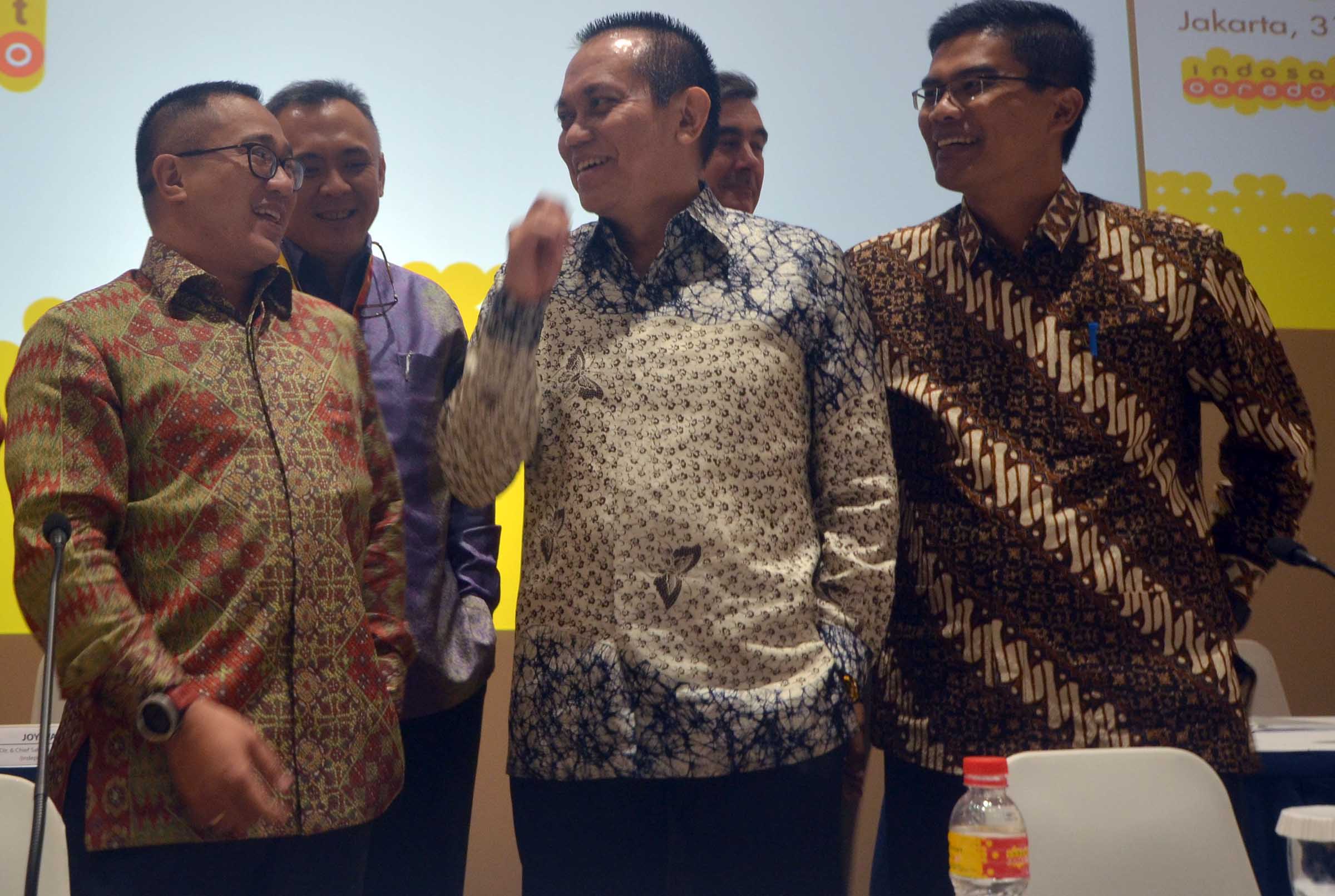 dari kiri ke kanan, Chief Financial Officer, Caba Pinter, President Director,Alexander Rusli, Direktur and Chief Sales and distribution officer PT Indosat Tbk,Joy wahyudi, Komisaris,Chris Kanter, Chief Technology Officer,John M Thompson, Komisaris Independent, Wijayanto Samirin, berbincang bersama seusai menutup Rapat Umum Pemegang Saham Luar Biasa (RUPSLB) Indosat Ooredoo di Jakarta, Rabu (31/8). RUPSLB PT Indosat Tbk (Indosat Ooredoo) memutuskan mengangkat Syed Maqbul Quader sebagai Komisaris Indipenden Perseroan menggantikan Richard Farnsworth Seney.