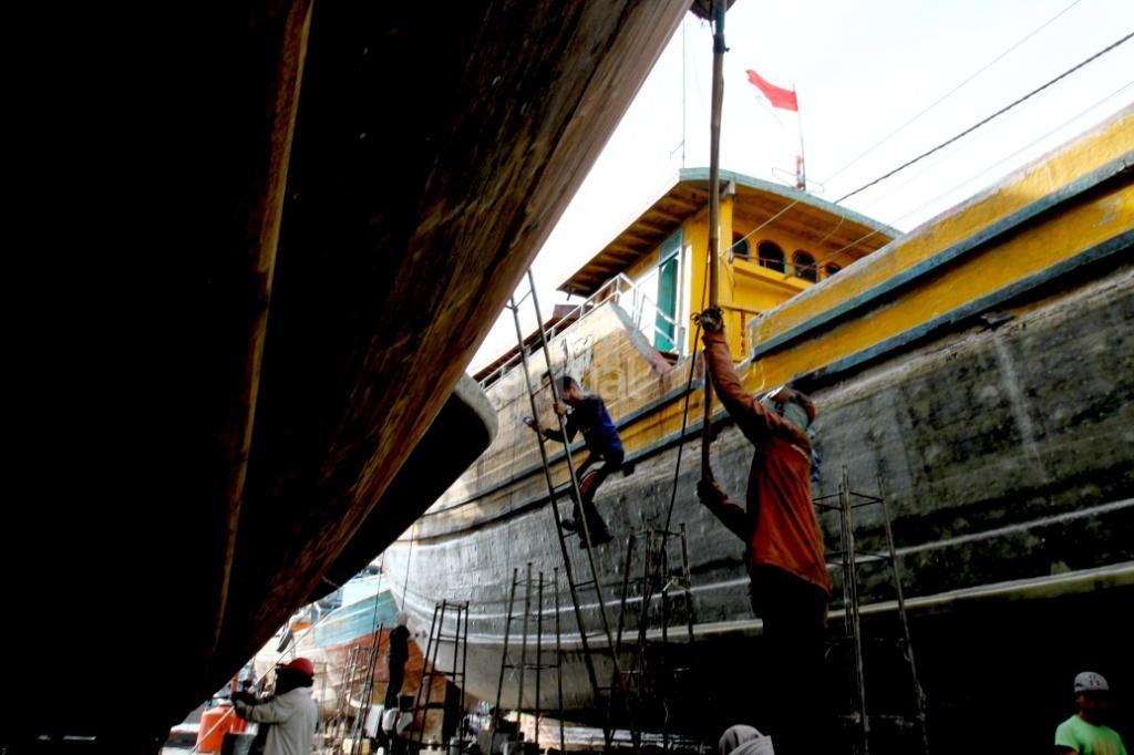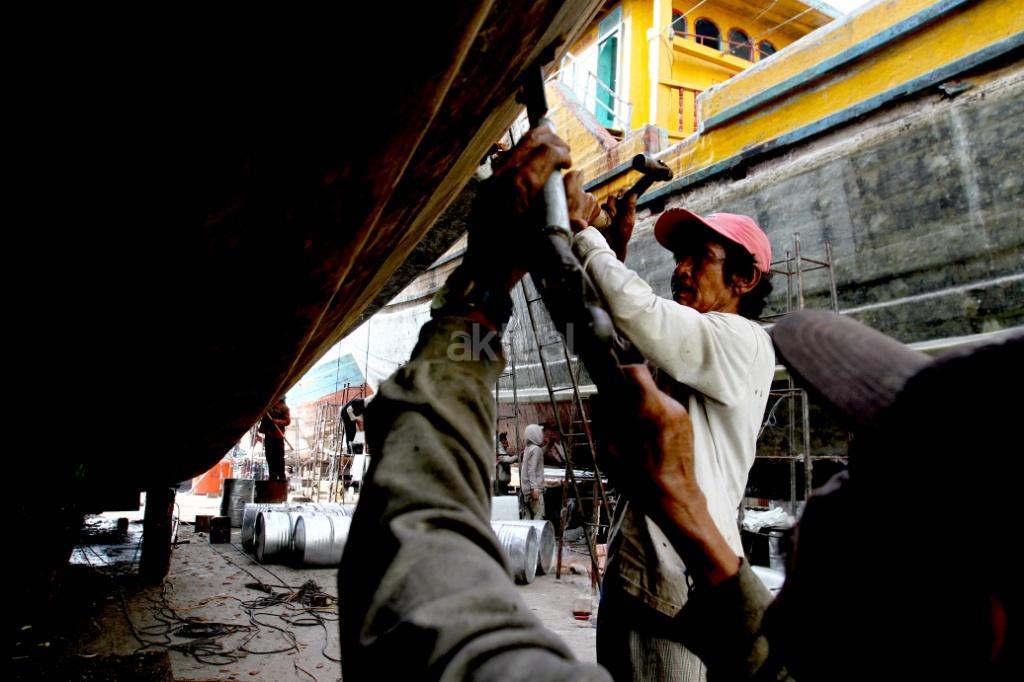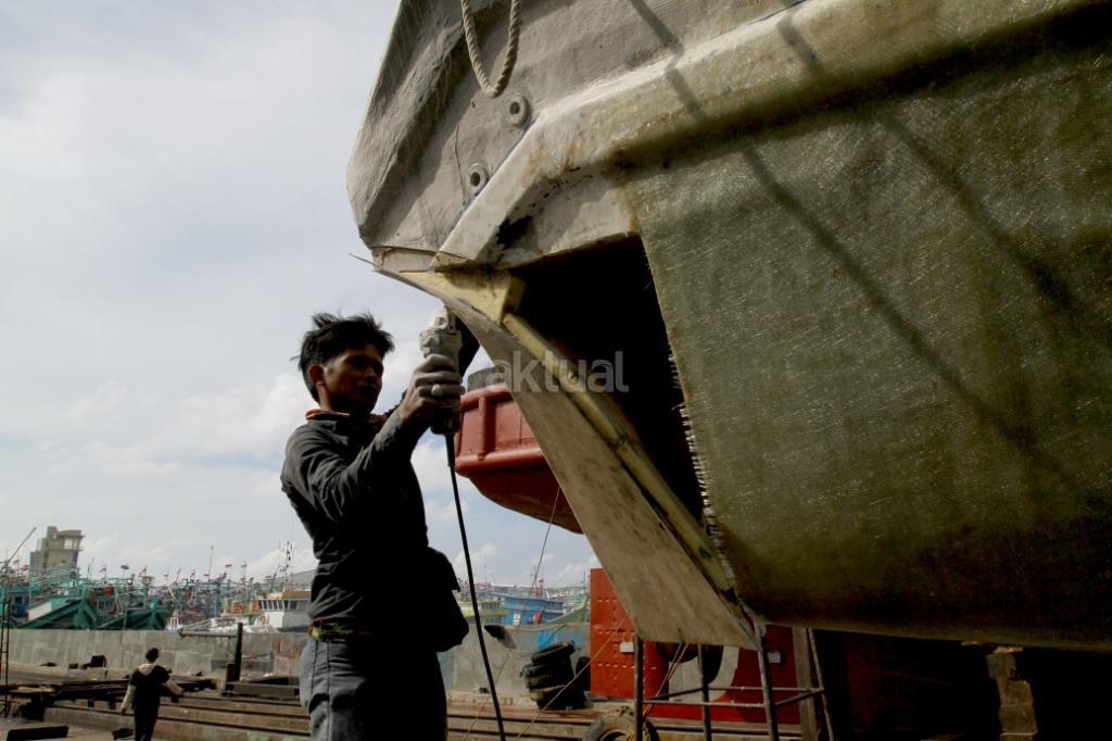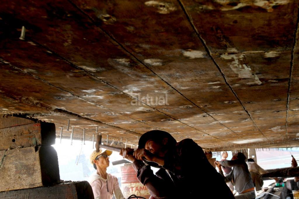 Pekerja menyelesaikan perbaikan kapal pengangkut barang di sebuah galangan kapal di Muara Angke, Jakarta, Rabu (8/11). Industri galangan kapal yang sangat diharapkan dapat menunjang kemajuan maritim di Indonesia ternyata sulit melaju. Kebanyakan pengusaha galangan kapal di kawasan tersebut hanya mempekerjakan proyek pembaruan, dikarenakan industri komponen kapal yang lesu. AKTUAL/Tino Oktaviano