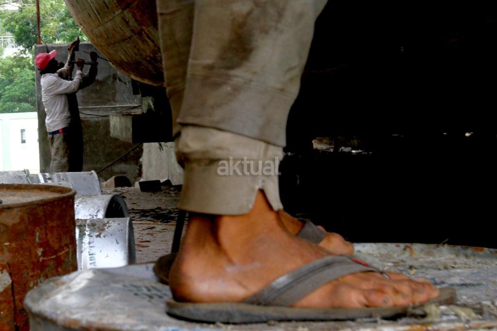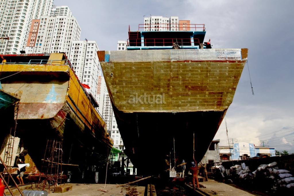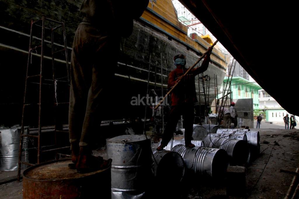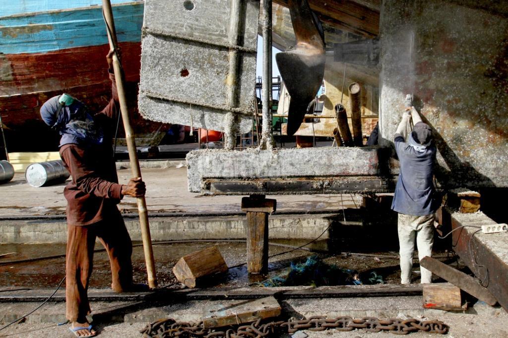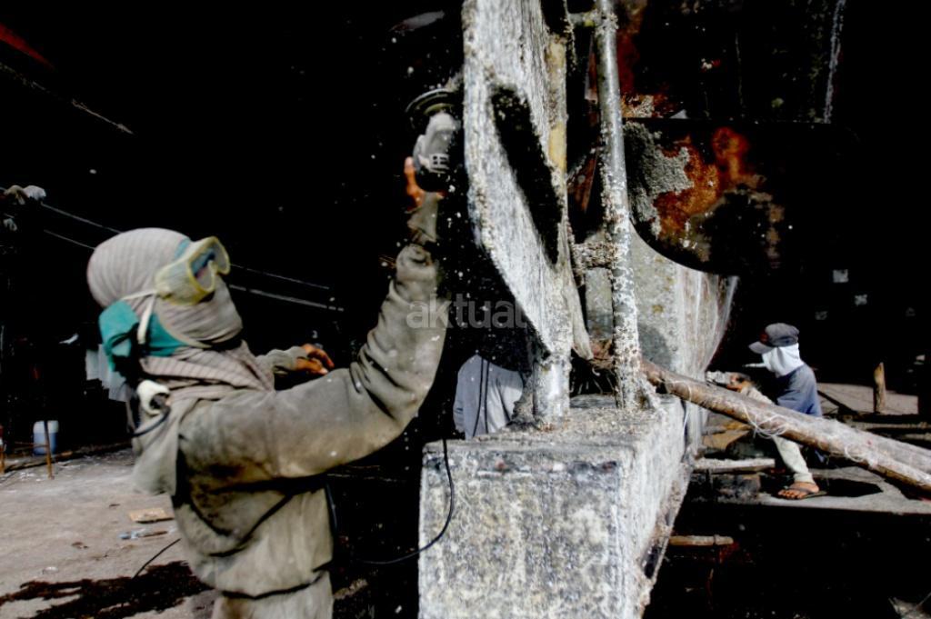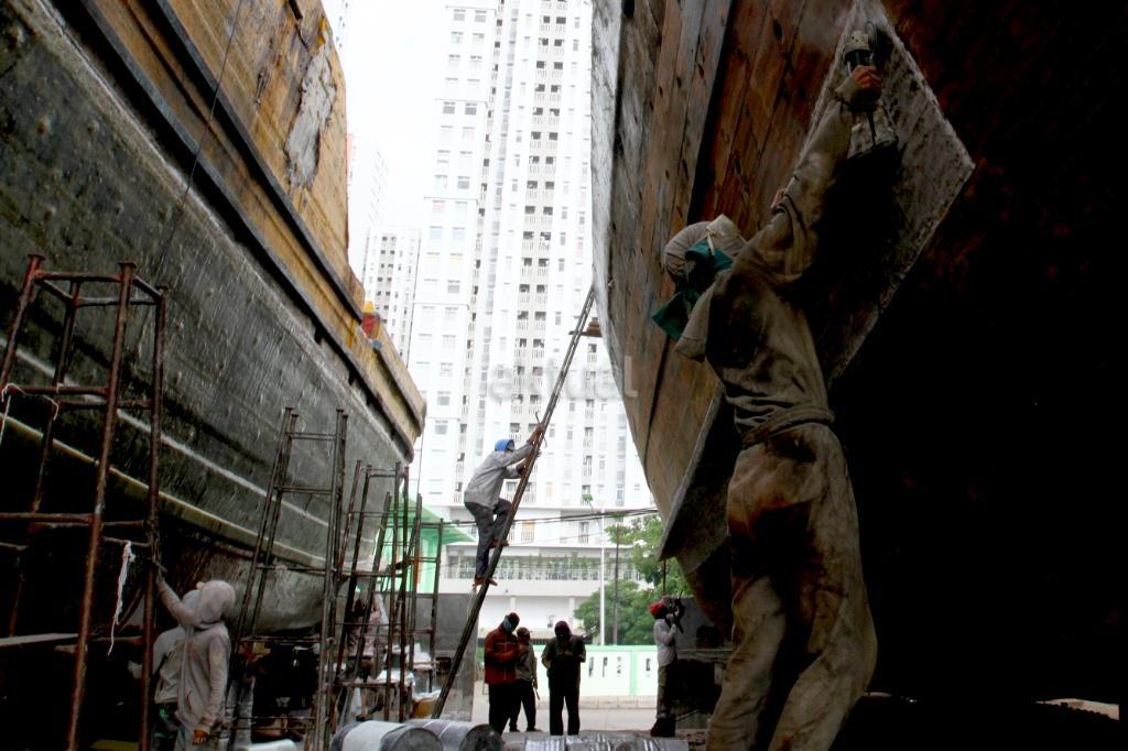 Pekerja menyelesaikan perbaikan kapal pengangkut barang di sebuah galangan kapal di Muara Angke, Jakarta, Rabu (8/11). Berdasarkan data Kementerian Perindustrian, industri perkapalan nasional memiliki galangan kapal sebanyak 250 perusahaan, dengan kapasitas produksi mencapai sekitar 1 juta deadweight tonnage (DWT) per tahun untuk pembangunan kapal baru dan 12 juta DWT per tahun untuk reparasi atau perbaikan kapal. AKTUAL/Tino Oktaviano