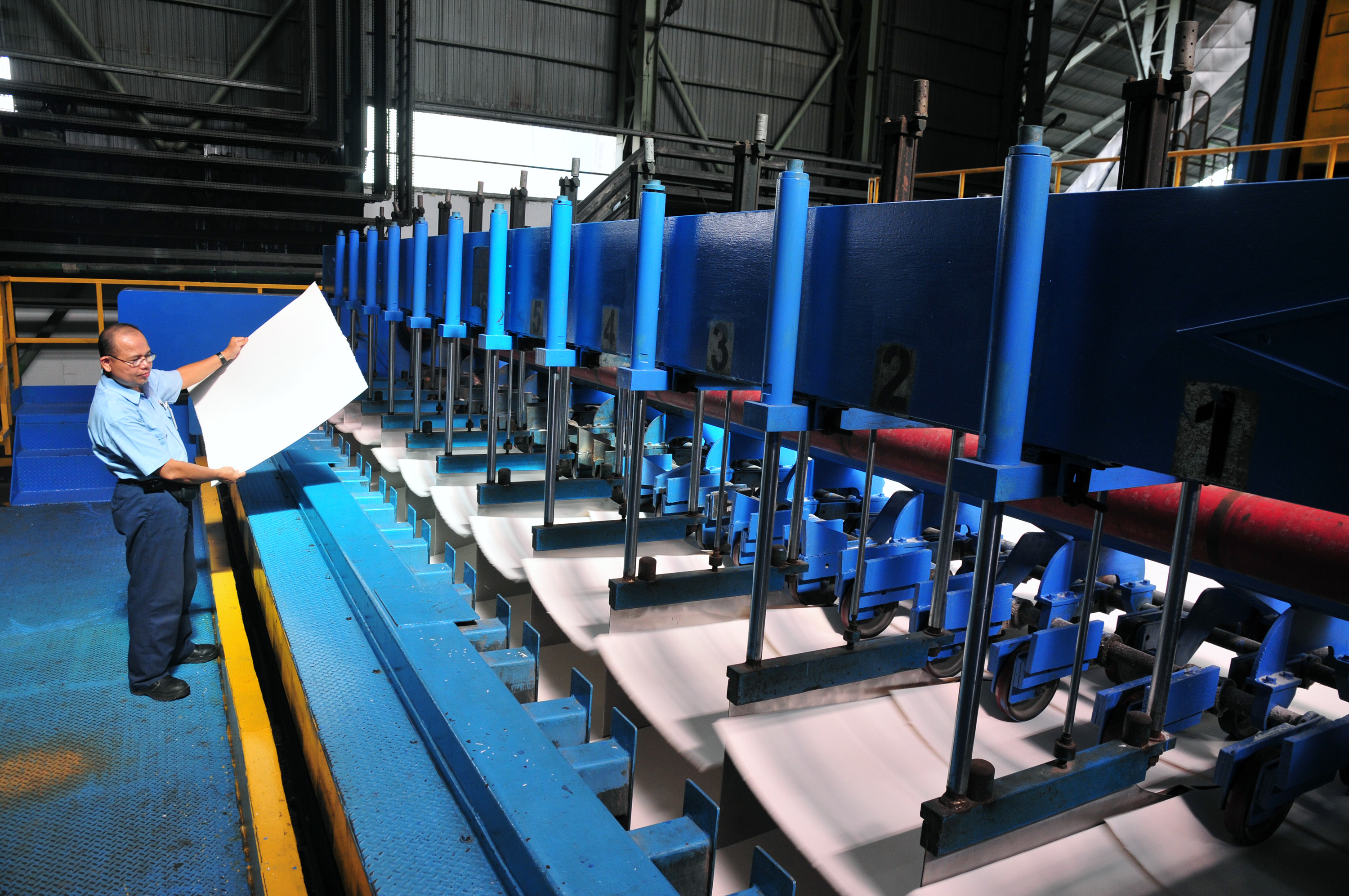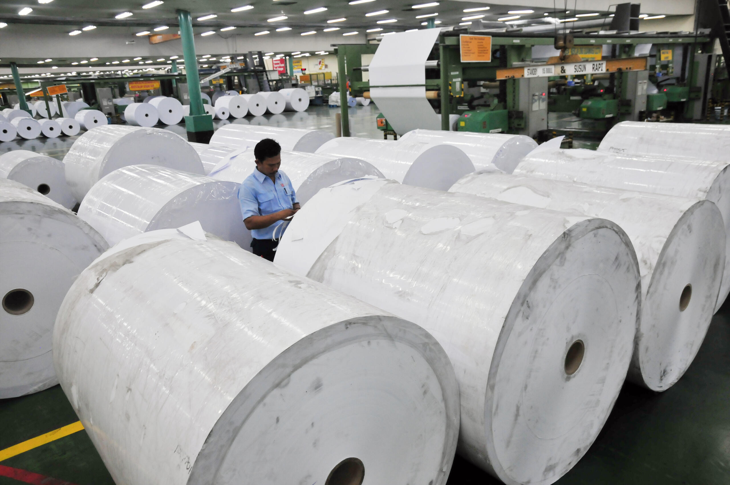 Sejumlah pekerja memeriksa kualitas kertas di pabrik APP-Sinar Mas di Provinsi Riau, Senin (18/7). Berdasarkan data Kementerian Perindustrian, realisasi produksi pulp dan kertas Indonesia masing-masing mencapai 6,4 juta ton dan 10,4 ton per tahun yang menempatkan industri pulp nasional pada peringkat ke-9 dan industri kertas peringkat ke-6 di dunia, sedangkan di Asia menempati peringkat ke-3 untuk industri pulp maupun kertas. ANTARA FOTO/FB Anggoro/ama/16.