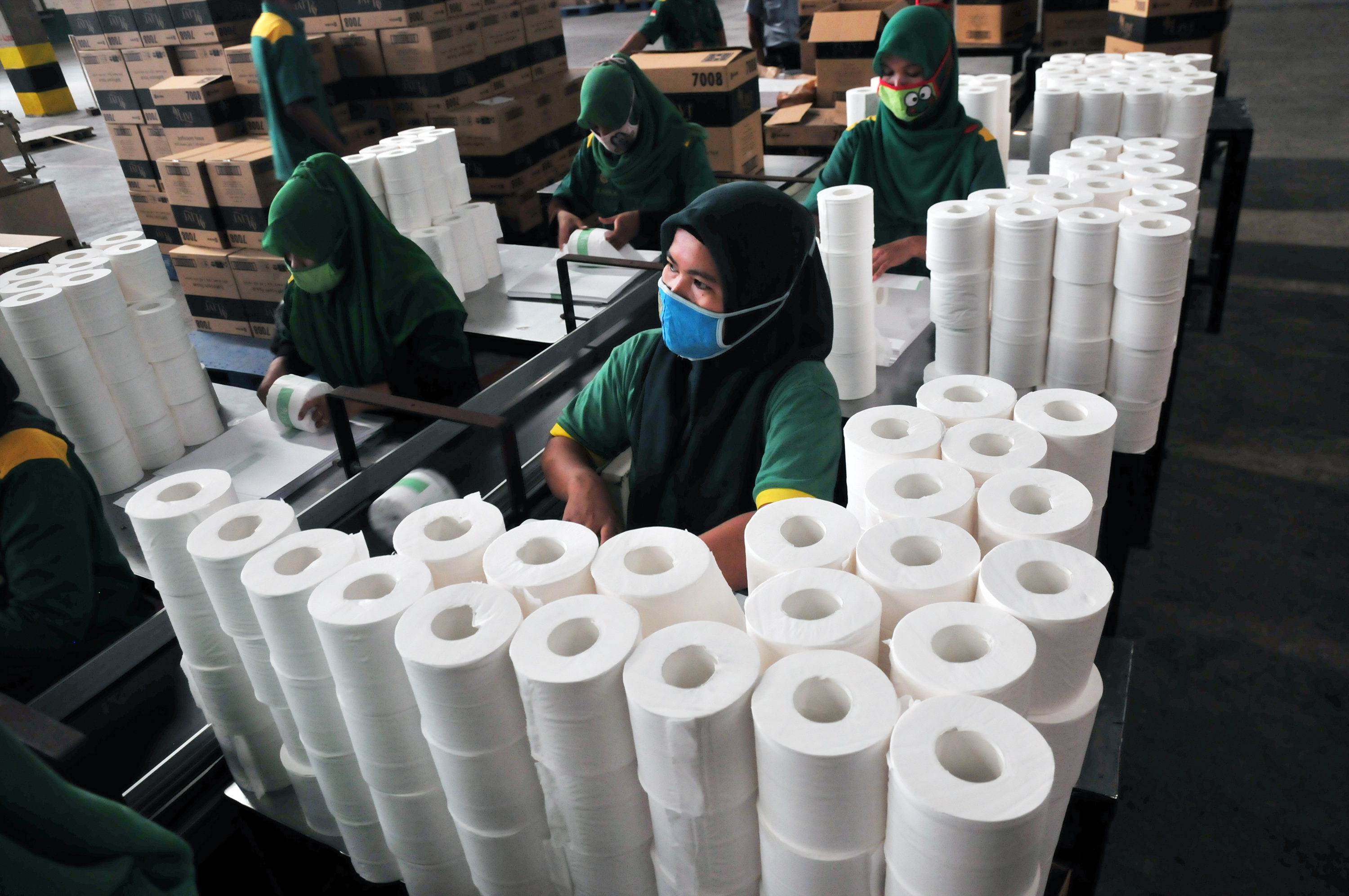 Sejumlah pekerja menyusun tisu hasil produksi bubur kertas (pulp) di pabrik APP-Sinar Mas di Provinsi Riau, Senin (18/7). Berdasarkan data Kementerian Perindustrian, realisasi produksi pulp dan kertas Indonesia masing-masing mencapai 6,4 juta ton dan 10,4 ton per tahun yang menempatkan industri pulp nasional pada peringkat ke-9 dan industri kertas peringkat ke-6 di dunia, sedangkan di Asia menempati peringkat ke-3 untuk industri pulp maupun kertas. ANTARA FOTO/FB Anggoro/ama/16.