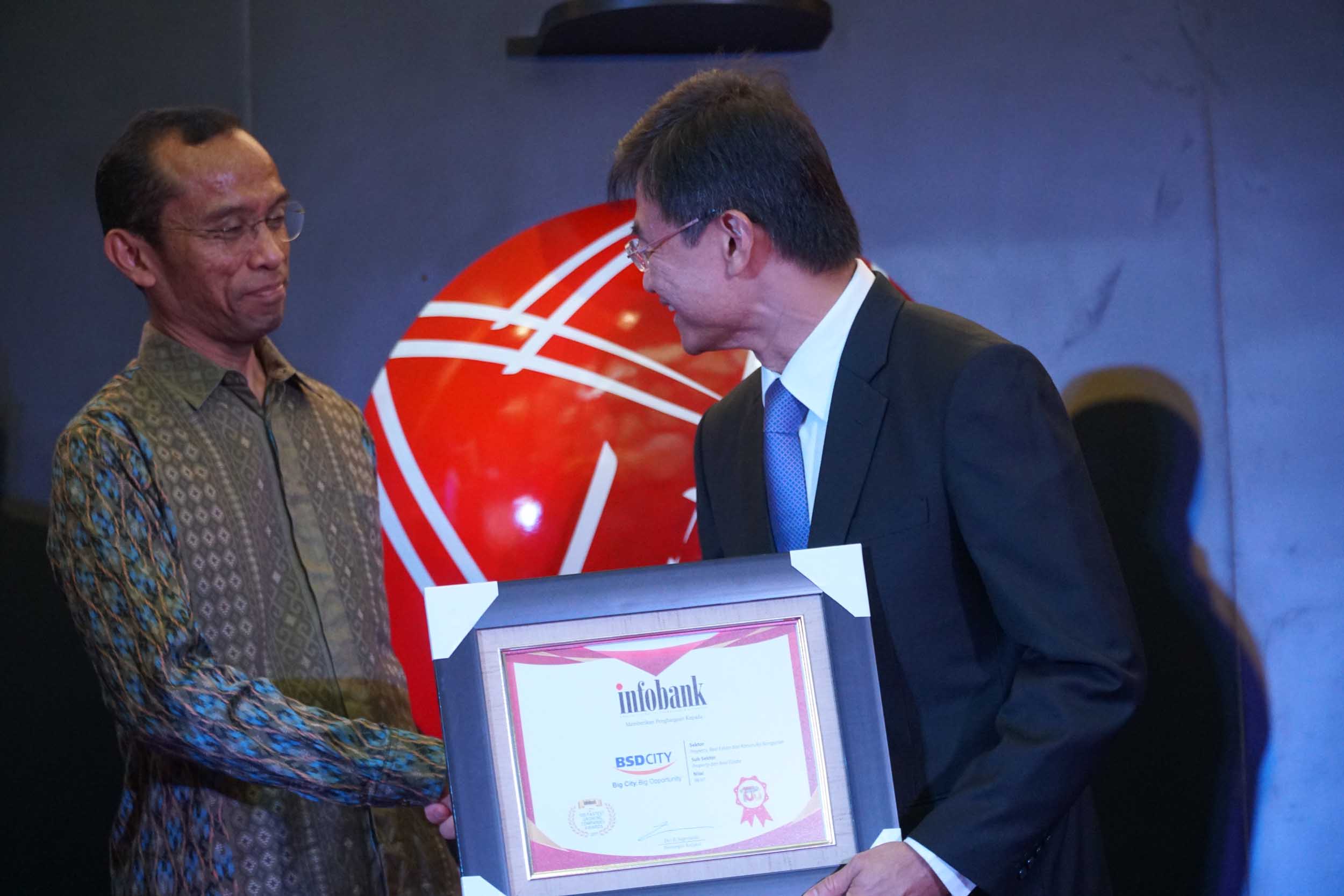PT Bumi Serpong Damai Tbk memperoleh penghargaan sebagai perusahaan properti dengan kapitalisasi pasar terbesar di Indonesia dalam ajang 100 Fastest Growing Companies 2018 yang diselenggarakan oleh Infobank. Trofi Penghargaan diterima oleh Wakil Presiden Komisaris PT Bumi Serpong Damai, Teky Mailoa (kanan) yang diserahkan Direktur BEI, Hamdy Hassyarbaini (kiri) disela – sela acara Seminar dan Penganugrahan 100 Fastest Growing Companies pada Kamis (25/1), di Gedung Bursa Efek Indonesia, Jakarta. AKTUAL/Eko S Hilman