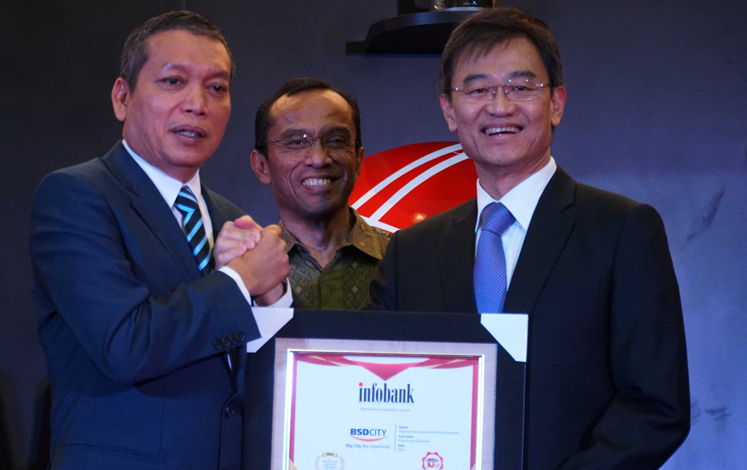 PT Bumi Serpong Damai Tbk memperoleh penghargaan sebagai perusahaan properti dengan kapitalisasi pasar terbesar di Indonesia dalam ajang 100 Fastest Growing Companies 2018 yang diselenggarakan oleh Infobank. Trofi Penghargaan diterima oleh Wakil Presiden Komisaris PT Bumi Serpong Damai, Teky Mailoa (kanan) yang diserahkan oleh Eko B. Supriyanto (kiri) selaku Pemimpin Redaksi Infobank dan Direktur BEI, Hamdy Hassyarbaini ( tengah) disela – sela acara Seminar dan Penganugrahan 100 Fastest Growing Companies pada Kamis (25/1), di Gedung Bursa Efek Indonesia, Jakarta. AKTUAL/Eko S Hilman
