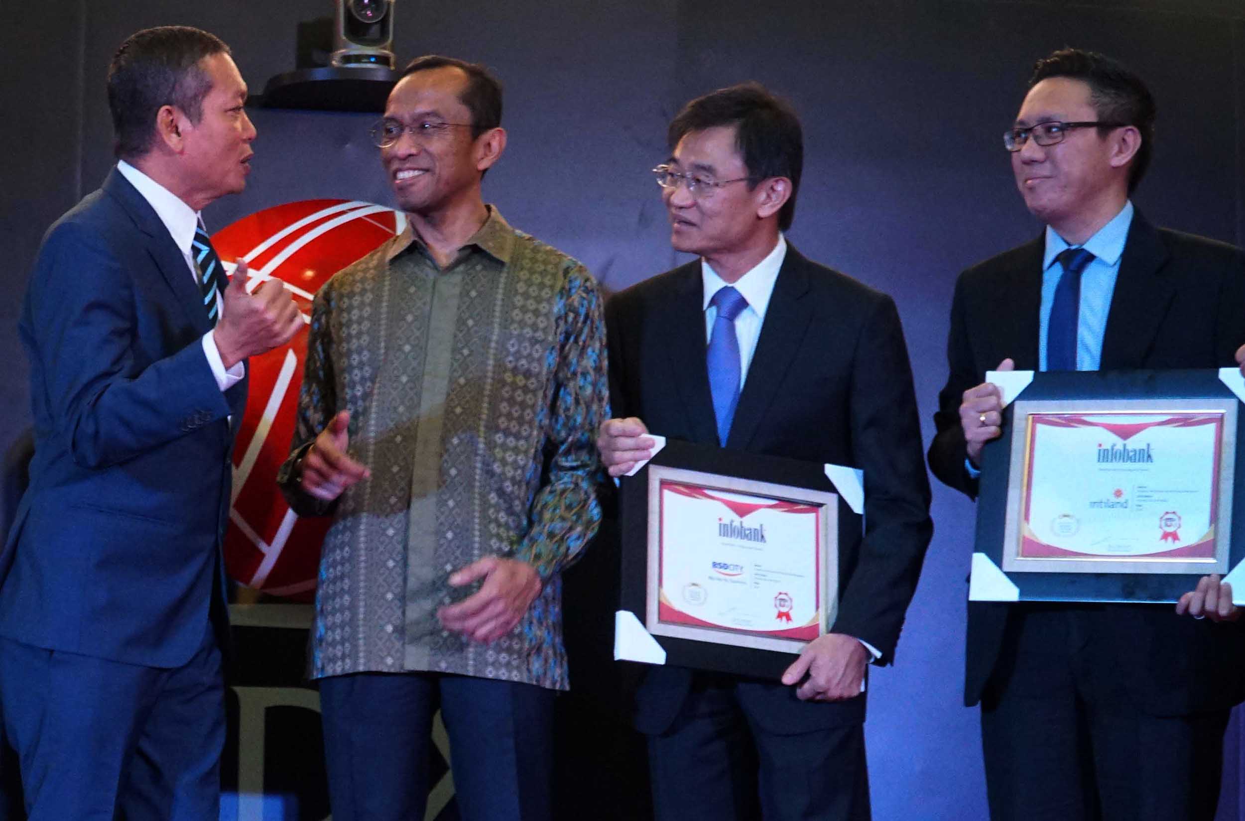 (dari kiri ke kanan) Pemimpin Redaksi Infobank, Eko B Supriyanto, Direktur Bursa Efek Indonesia, Hamdy Hassyarbaini, Wakil Presiden Komisaris PT Bumi Serpong Damai, Teky Mailoa, VP Capital & Investment Management PT Intiland Development Tbk, Nathan Tanugraha berbincang disela penghargaan ajang 100 Fastest Growing Companies 2018 yang diselenggarakan oleh Infobank di Main Hall, Gedung Bursa Efek Indonesia, Jakarta, Kamis (25/1).Intiland Development memperoleh predikat Sangat Bagus dalam kategori “Properti, Real Estate, dan Konstruksi Bangunan” sementara PT Bumi Serpong Damai Tbk (BSDE), meraih penghargaan sebagai perusahaan properti dengan kapitalisasi pasar terbesar di Indonesia. AKTUAL/Eko S Hilman