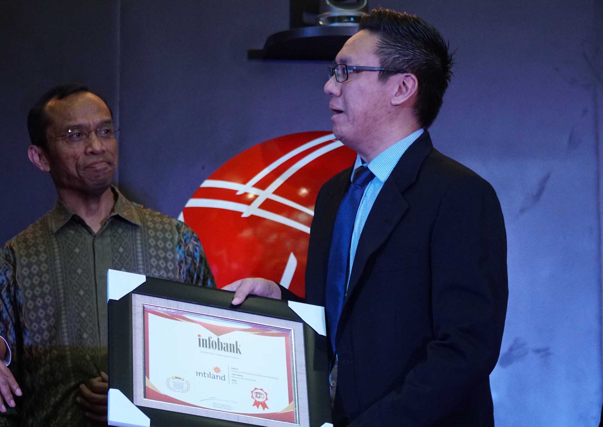 Intiland Development memperoleh predikat Sangat Bagus dalam kategori “Properti, Real Estate, dan Konstruksi Bangunan” dalam ajang 100 Fastest Growing Companies 2018 yang diselenggarakan oleh Infobank. Trofi Penghargaan diterima oleh Bapak Nathan Tanugraha VP Capital & Investment Management (kanan) yang diserahkan oleh Direktur BEI, Hamdy Hasyarbaini (kiri) disela – sela acara Seminar dan Penganugrahan 100 Fastest Growing Companies tanggal 25 Januari 2018, di Gedung Bursa Efek Indonesia, Jakarta. AKTUAL/Eko S Hilman