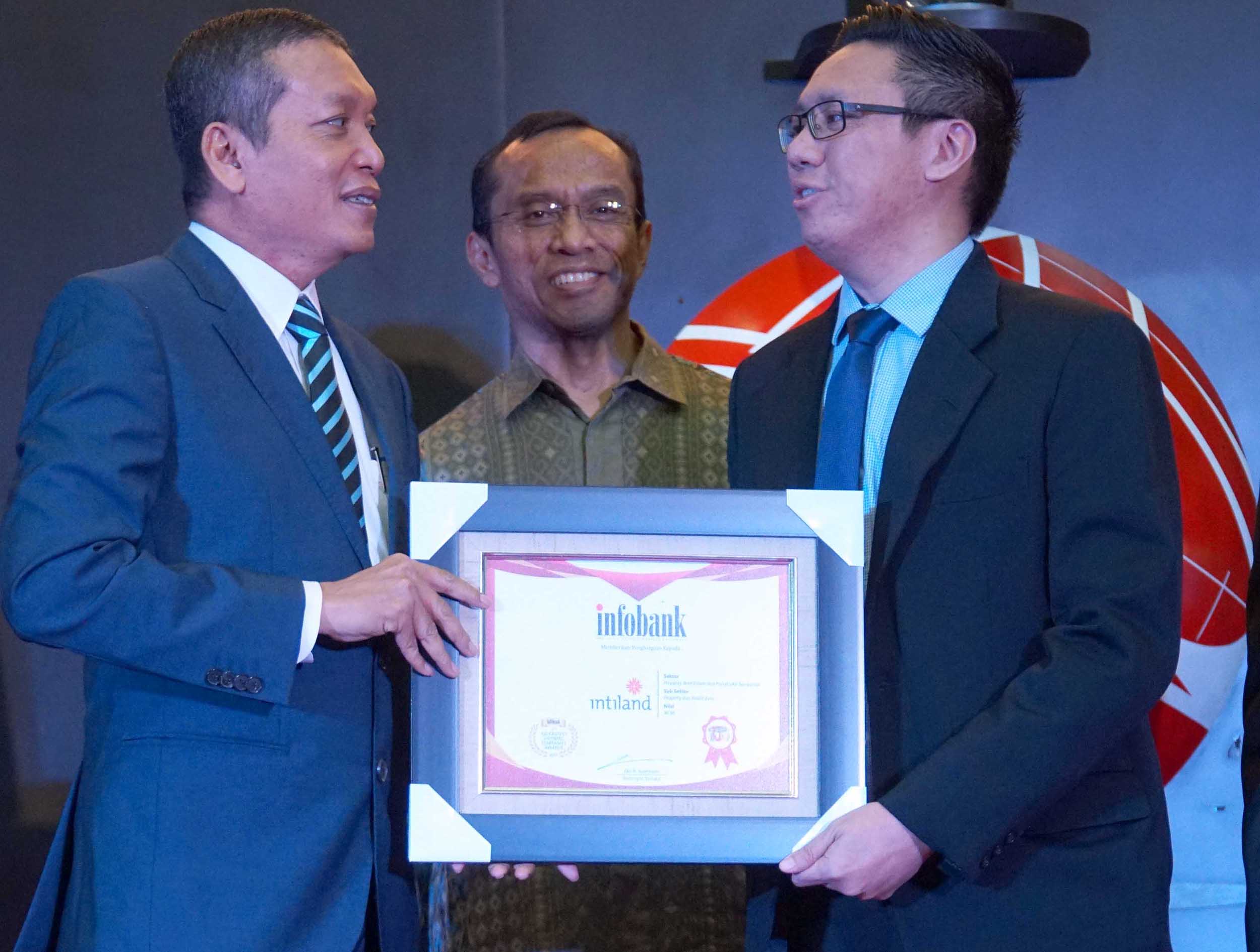 Intiland Development memperoleh predikat Sangat Bagus dalam kategori “Properti, Real Estate, dan Konstruksi Bangunan” dalam ajang 100 Fastest Growing Companies 2018 yang diselenggarakan oleh Infobank. Trofi Penghargaan diterima oleh Bapak Nathan Tanugraha VP Capital & Investment Management (kanan) yang diserahkan oleh Eko B. Supriyanto (kiri) selaku Pemimpin Redaksi Infobank dan Direktur BEI, Hamdy Hasyarbaini ( tengah) disela – sela acara Seminar dan Penganugrahan 100 Fastest Growing Companies tanggal 25 Januari 2018, di Gedung Bursa Efek Indonesia, Jakarta. AKTUAL/Eko S Hilman