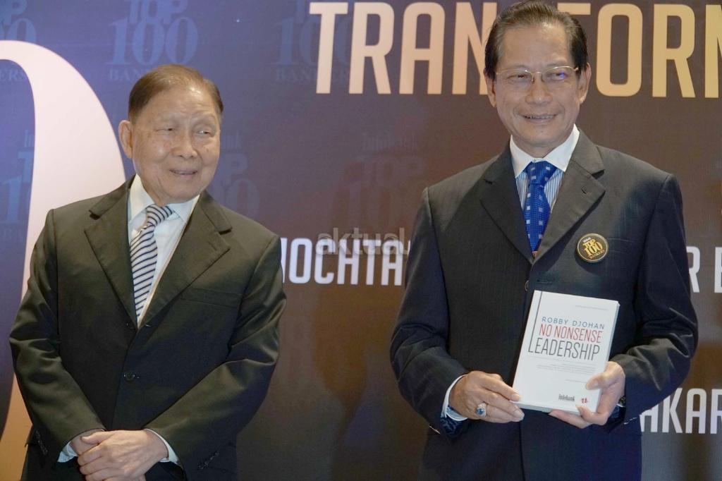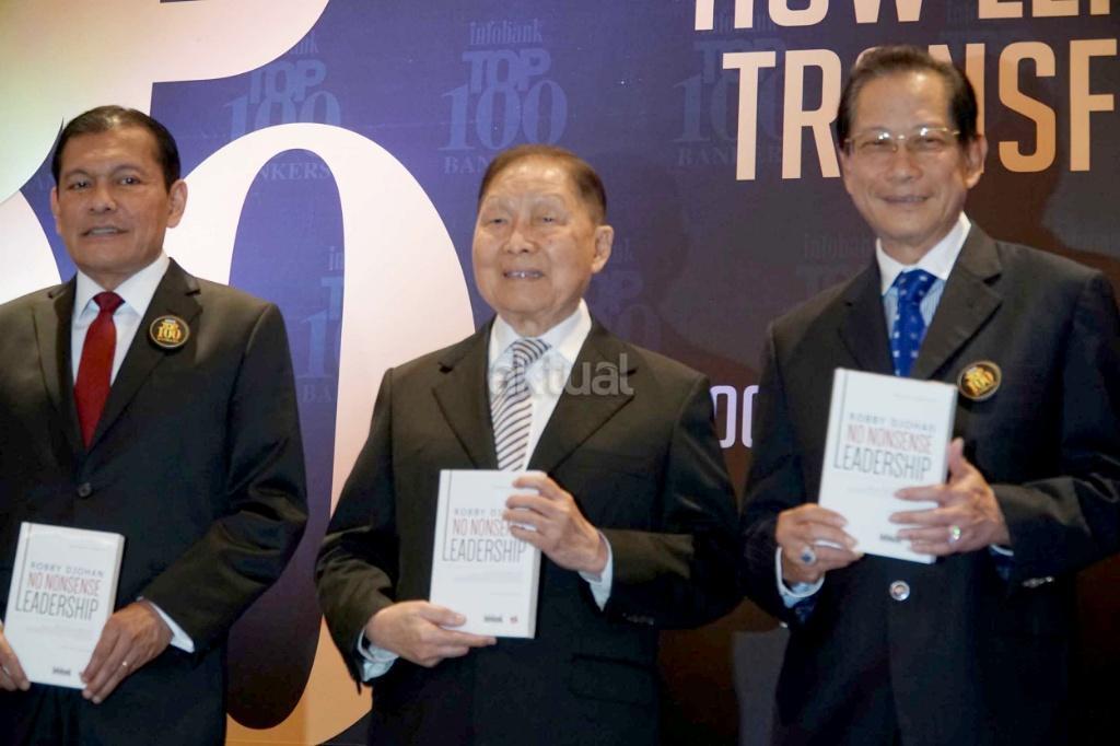 Presiden Direktur PT Bank Central Asia Tbk (BCA) Jahja Setiaatmadja (ketiga kanan) menerima buku “No Nonsense Leadership” karya Robby Djohan yang diserahkan secara langsung oleh Putri Robby Djohan - Wita Djohan (kedua kanan) disaksikan oleh Senior Banker sekaligus Pendiri Lippo Group Mochtar Riady (ketiga kiri), CEO Citibank Indonesia Batara Sianturi (kedua kiri), Chairman of Executive Board Indonesian Institute for Corporate Directorship (IICD) Sigit Pramono (kiri) pada acara Peluncuran Buku Top 100 Bankers di Jakarta, Selasa (28/11). AKTUAL/Eko S Hilman