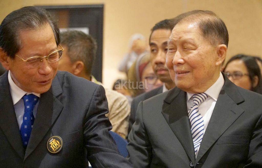Pendiri Lippo Group Mochtar Riady (kiri) dan Presiden Direktur PT Bank Central Asia Tbk (BCA) Jahja Setiaatmadja (kanan) berbincang sesaat sebelum menjadi narasumber dalam diskusi “How Leadership Accelerates Transformation in Banking ” di jakarta selasa (28/11). Majalah Infobank menggelar diskusi tantangan dunia perbankan di era ekonomi digital. AKTUAL/Eko S Hilman