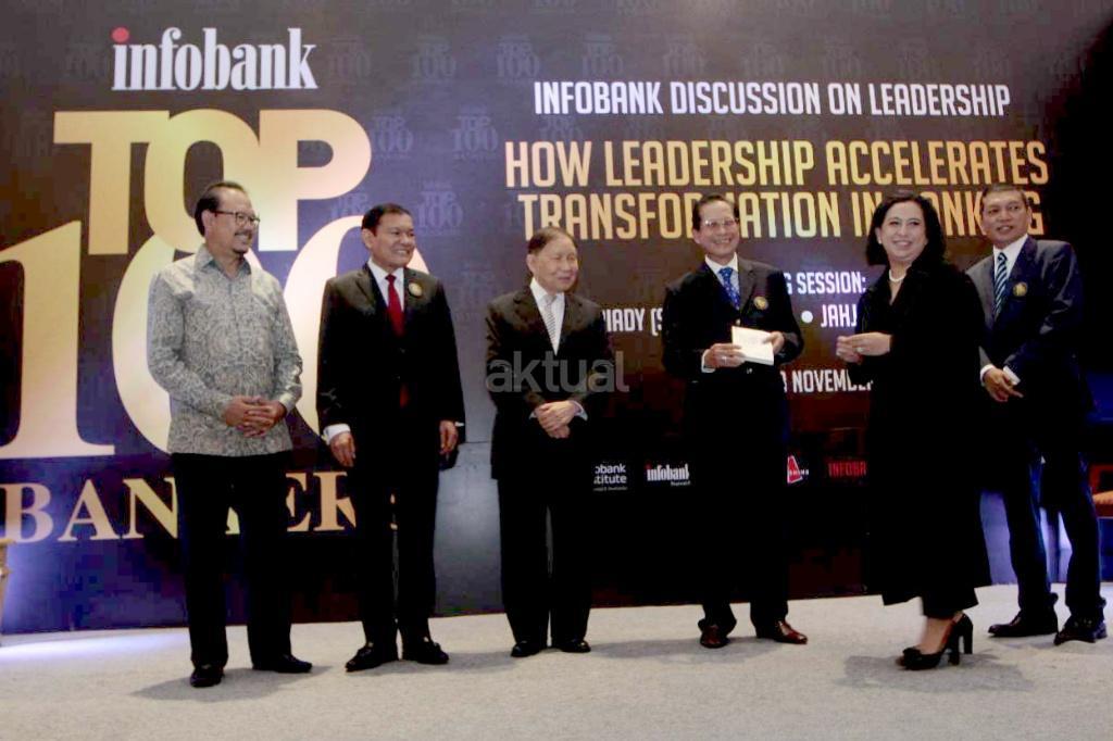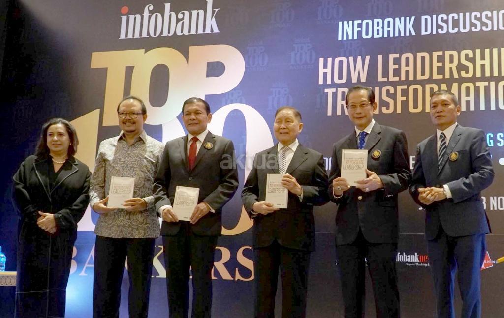 Presiden Direktur PT Bank Central Asia Tbk (BCA) Jahja Setiaatmadja (ketiga kanan) menerima buku “No Nonsense Leadership” karya Robby Djohan yang diserahkan secara langsung oleh Putri Robby Djohan – Wita Djohan (kedua kanan) disaksikan oleh Senior Banker sekaligus Pendiri Lippo Group Mochtar Riady (ketiga kiri), CEO Citibank Indonesia Batara Sianturi (kedua kiri), Chairman of Executive Board Indonesian Institute for Corporate Directorship (IICD) Sigit Pramono (kiri) pada acara Peluncuran Buku Top 100 Bankers di Jakarta, Selasa (28/11). AKTUAL/Eko S Hilman