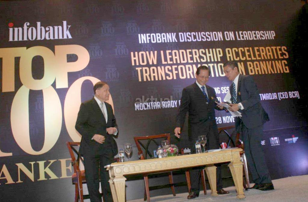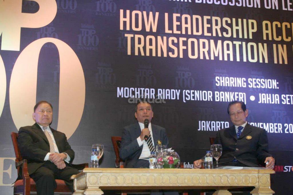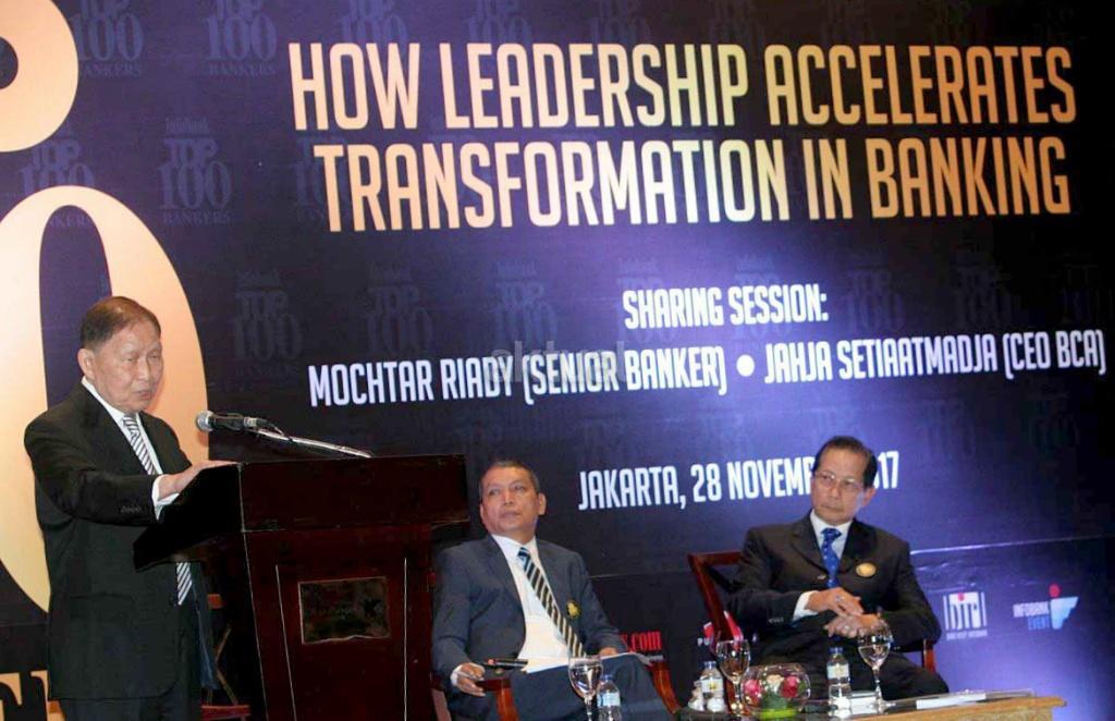 Pendiri Lippo Group Mochtar Riady (kiri) dan Presiden Direktur PT Bank Central Asia Tbk (BCA) Jahja Setiaatmadja (tengah) bersama Pemimpin Redaksi Majalah Infobank Eko B Supriyanto saat menjadi narasumber dalam diskusi “How Leadership Accelerates Transformation in Banking ” di jakarta selasa (28/11). Majalah Infobank menggelar diskusi tantangan dunia perbankan di era ekonomi digital. AKTUAL/Eko S Hilman