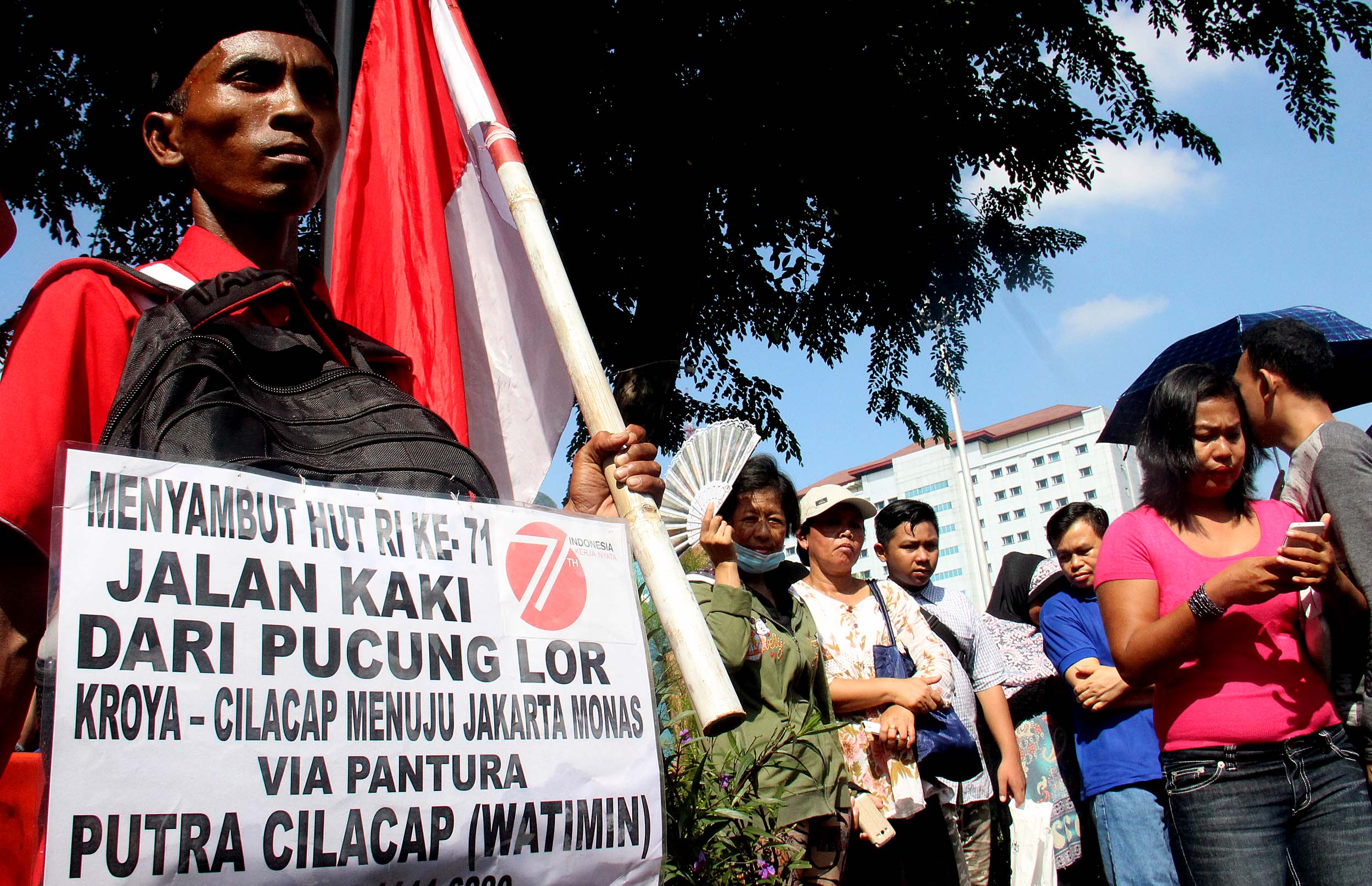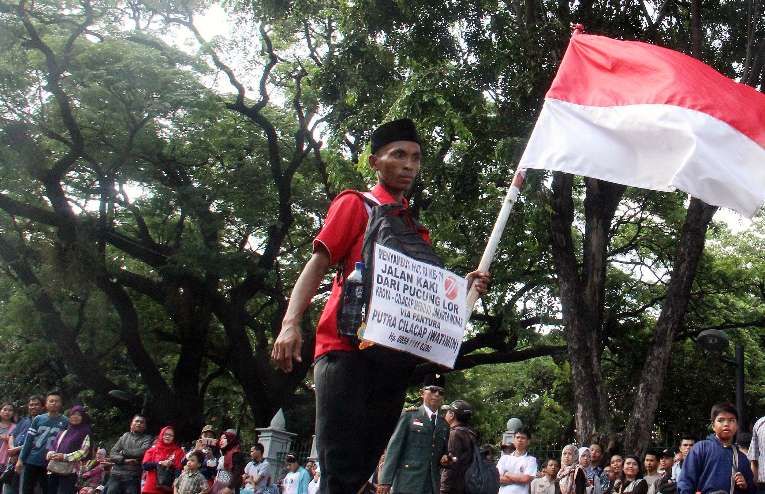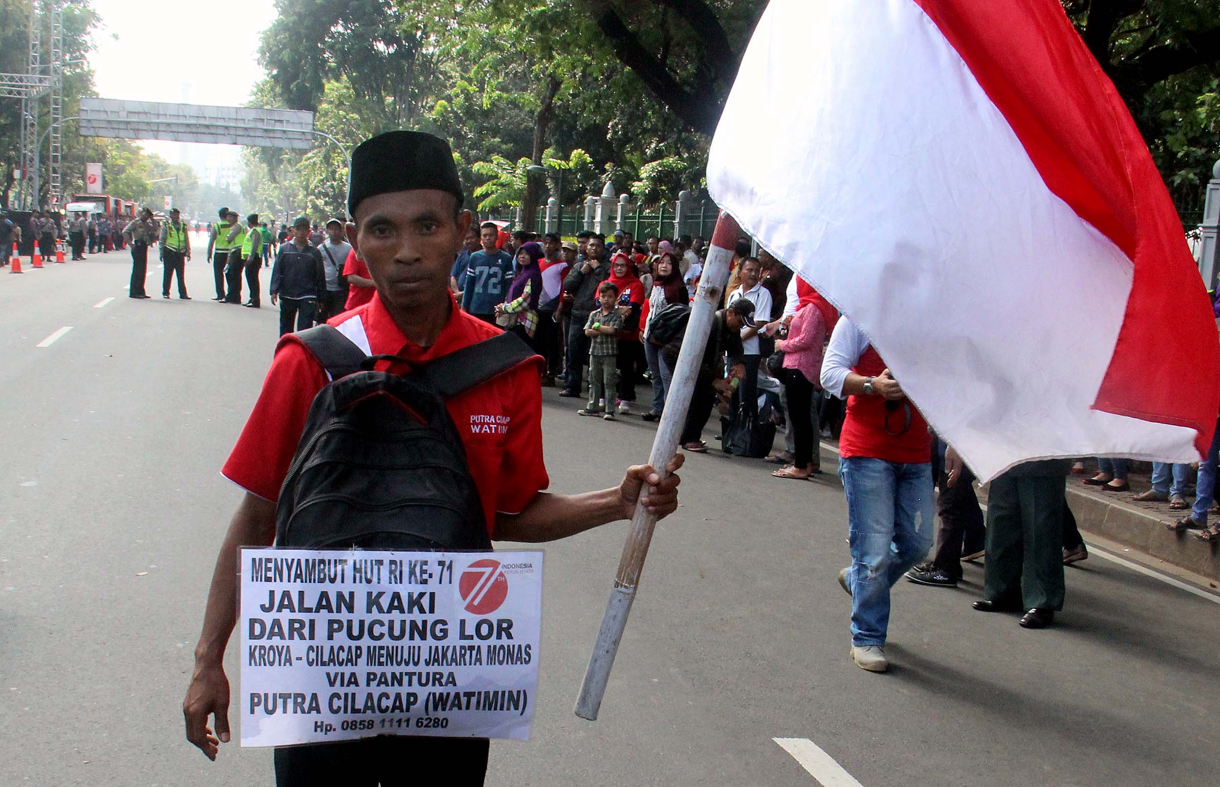 Demi mewujudkan niatnya bertemu Presiden Joko Widodo saat upacara peringatan hari kemerdekaan 17 Agustus, Watimin, 34 tahun, berjalan kaki dari Cilacap hingga Jakarta. Tangan kanannya memegang bambu diikat bendera merah-putih. Menggunakan ikat kepala yang juga berwarna merah-putih, serta menenteng ransel yang berisi pakaian dan perbekalan, dia menyusuri jalan menuju Ibu Kota. Watimin menempelkan kertas yang sudah dilaminating di rangselnya bertuliskan, “Menyambut HUT RI ke-71 Jalan Kaki dari Pucung Lor-Kroya-Cilacap menuju Jakarta."