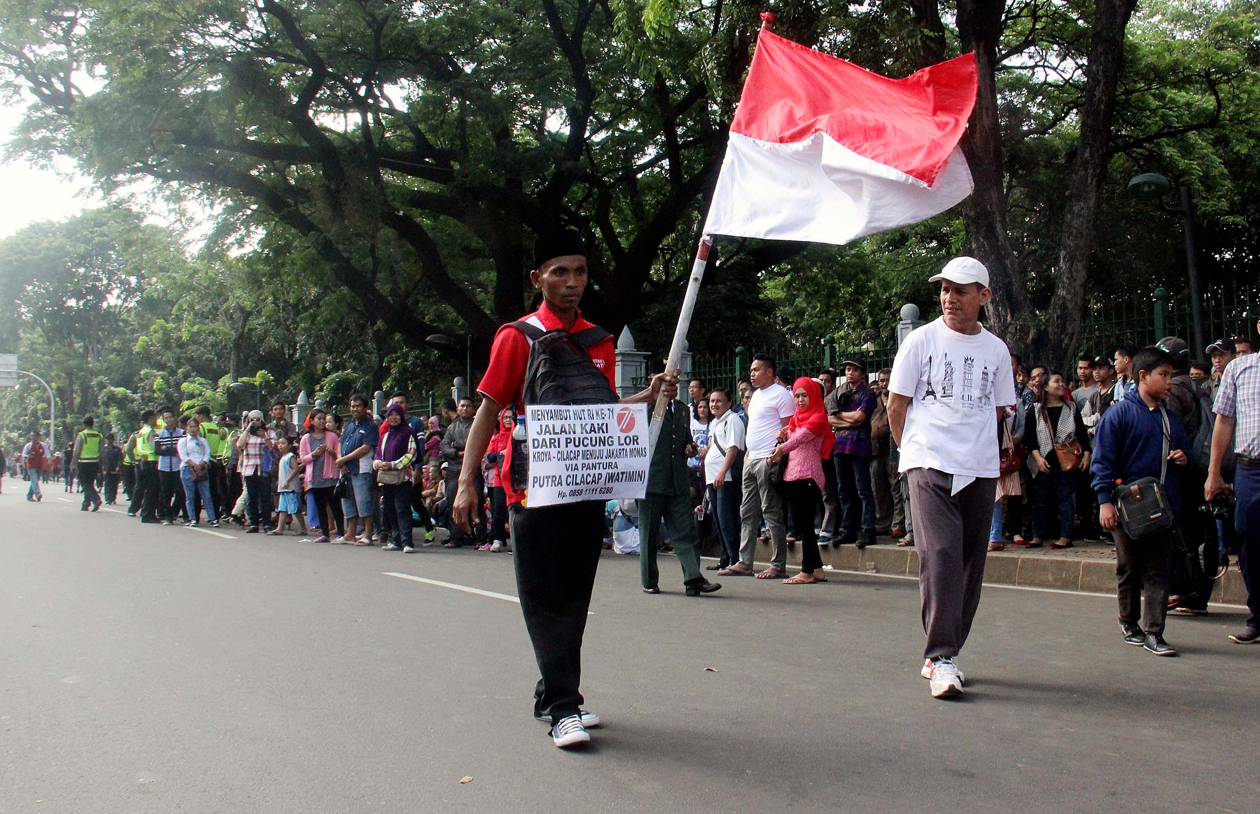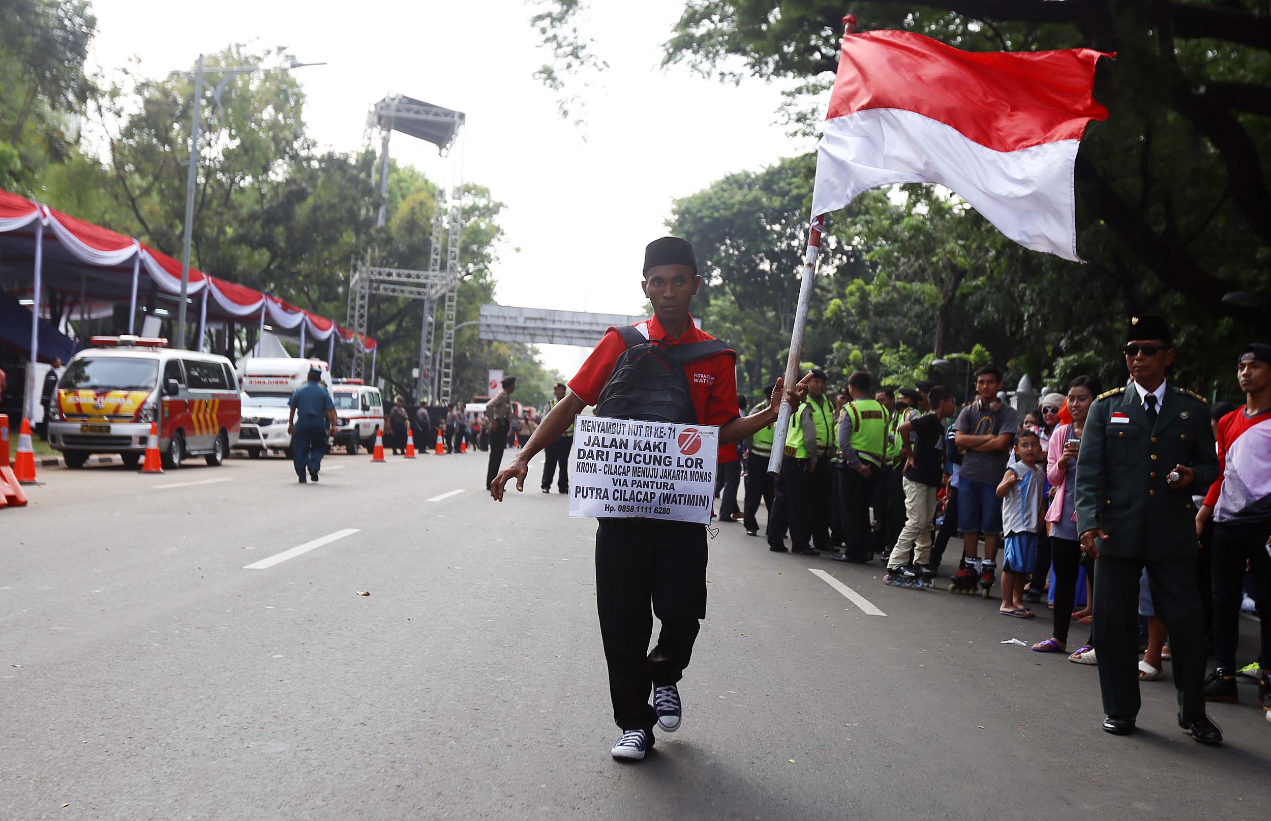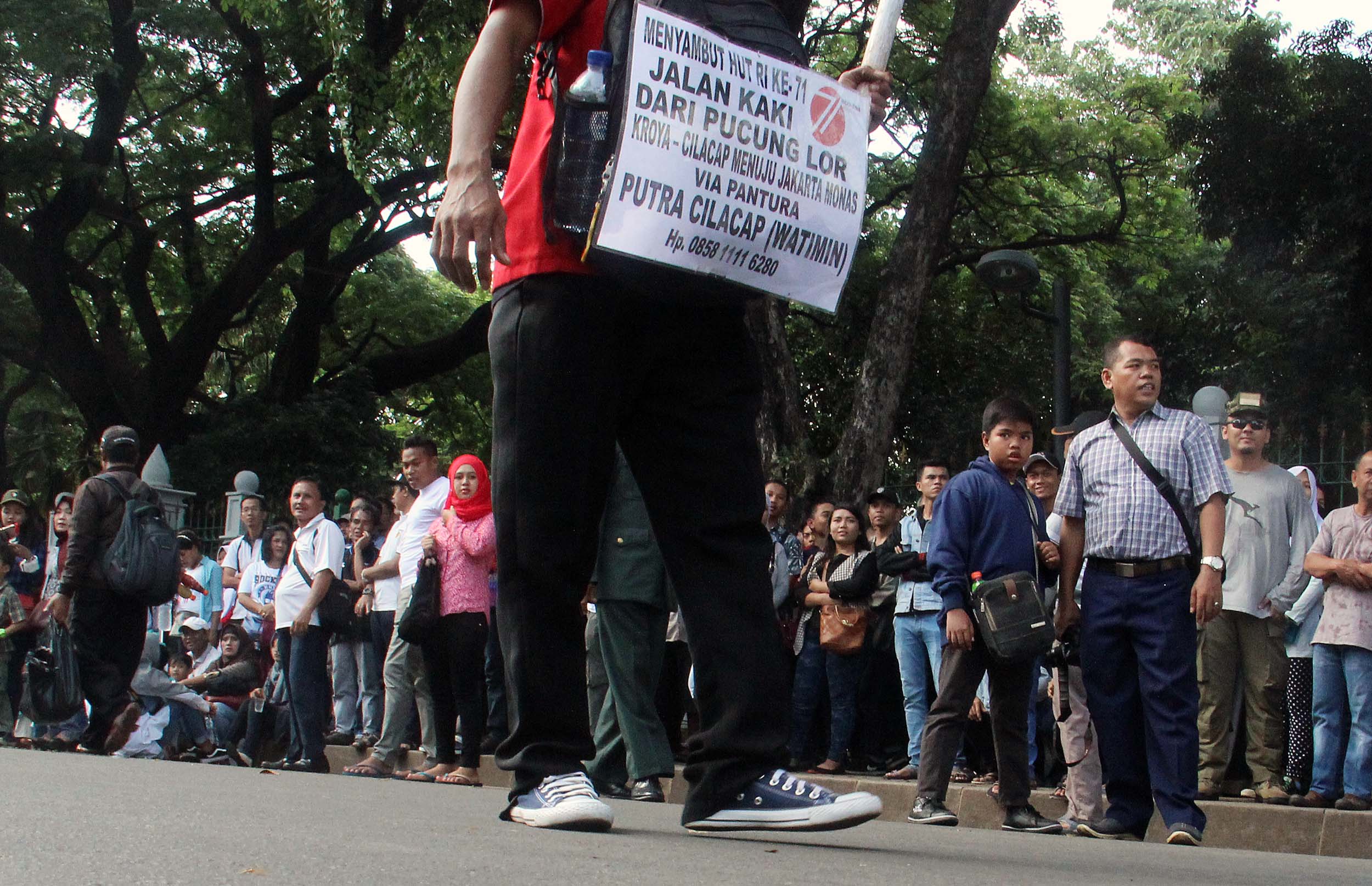 Demi mewujudkan niatnya bertemu Presiden Joko Widodo saat upacara peringatan hari kemerdekaan 17 Agustus, Watimin, 34 tahun, berjalan kaki dari Cilacap hingga Jakarta. Tangan kanannya memegang bambu diikat bendera merah-putih. Menggunakan ikat kepala yang juga berwarna merah-putih, serta menenteng ransel yang berisi pakaian dan perbekalan, dia menyusuri jalan menuju Ibu Kota. Watimin menempelkan kertas yang sudah dilaminating di rangselnya bertuliskan, “Menyambut HUT RI ke-71 Jalan Kaki dari Pucung Lor-Kroya-Cilacap menuju Jakarta."