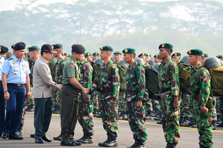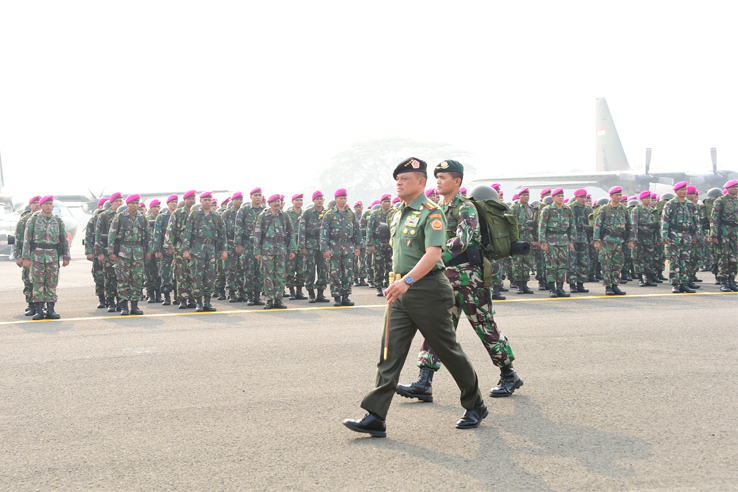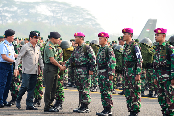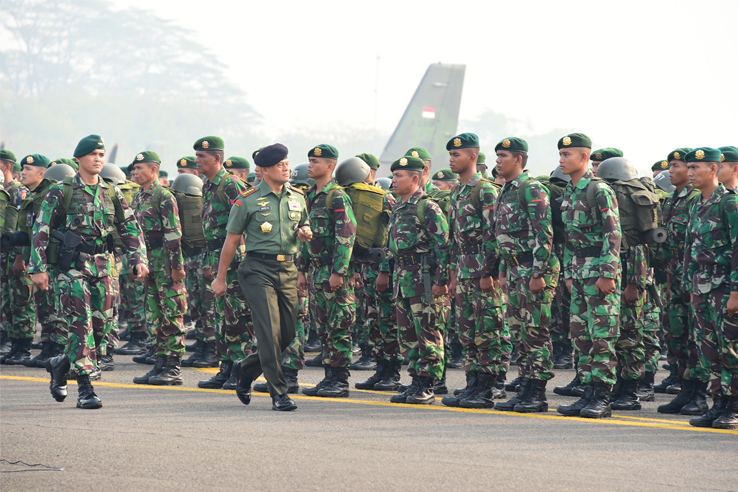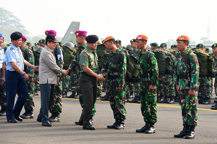 Jakarta, Aktual.com — Panglima TNI Jenderal TNI Gatot Nurmantyo menegarahkan 1.059 Prajurit TNI yang tergabung dalam Satgas Operasi Penanggulangan Kebakaran Hutan di wilayah Pekanbaru-Riau dalam suatu upacara militer di Taxi Way Halim Perdanakusuma, Jakarta Timur, Selasa (15/9).