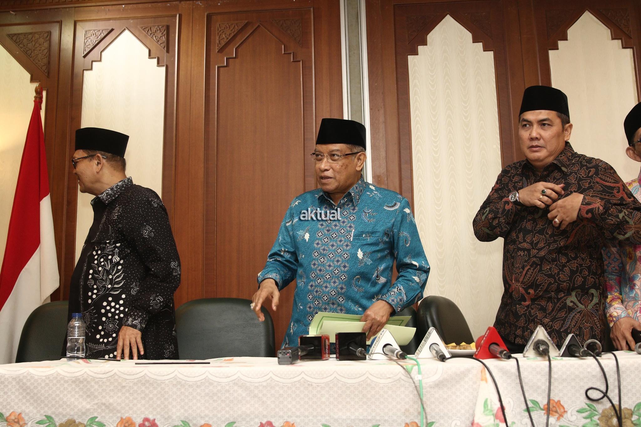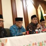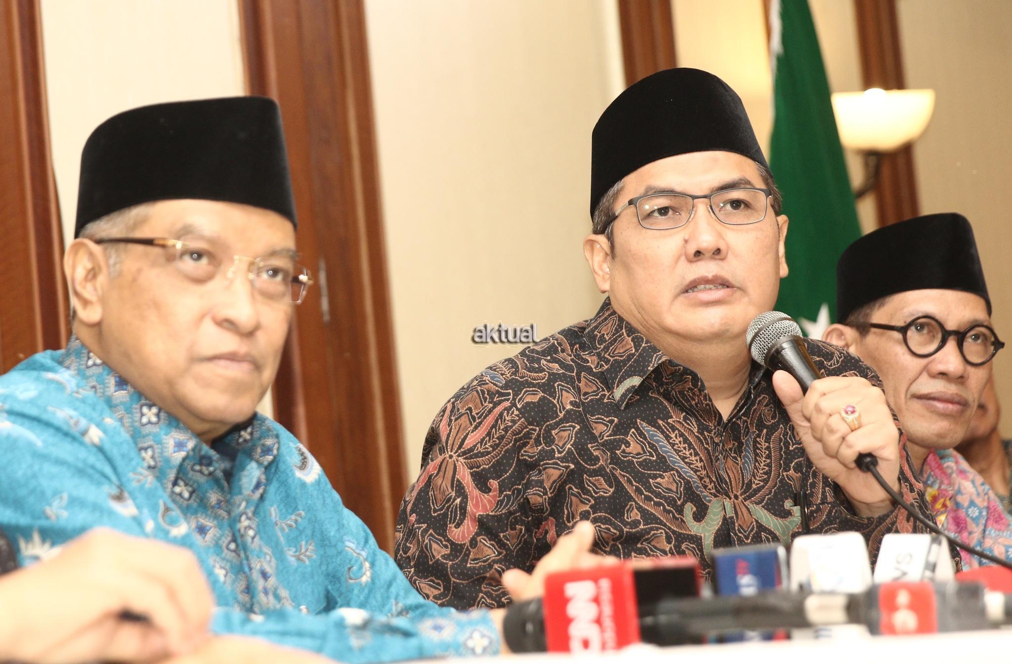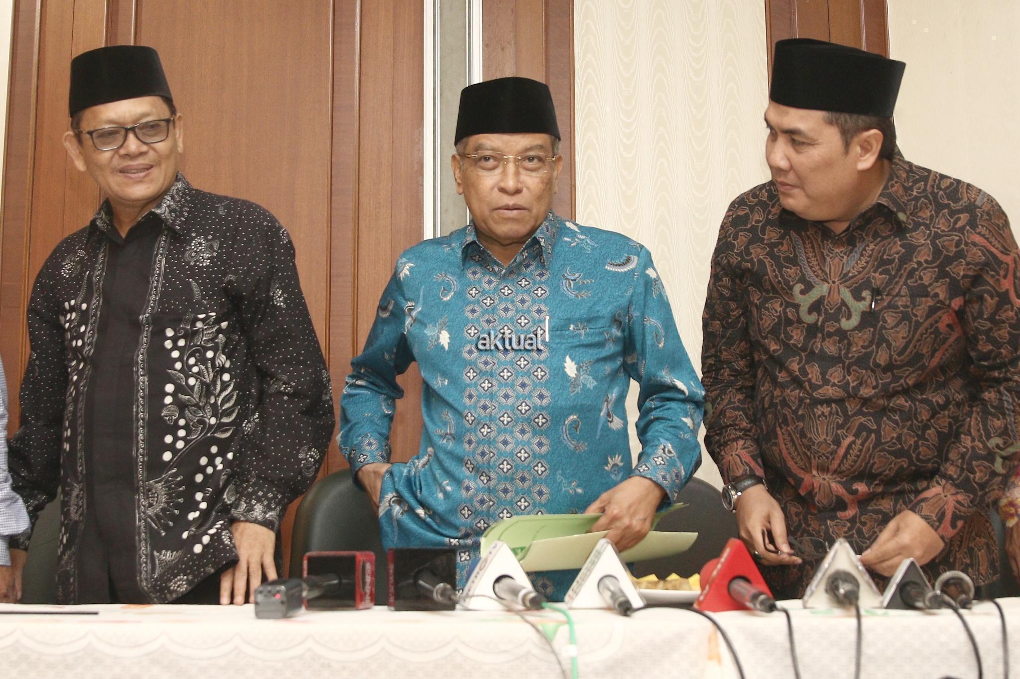 Ketua Umum PBNU KH. Said Aqil Siraj didampingi Waketum PBNU Maksum Mahfudl, Sekjen PBNU Helmy Faisal Zaini saat konferensi pers seputar pembakaran bendera Tauhid di kantor PBNU, Jakarta, Rabu (24/10/2018). PBNU menyatakan sebagai bentuk jaminan atas tegaknya Negara Kesatuan Republik Indonesia (NKRI) maka segala bentuk upaya menuju makar harus ditindak tegas. Menurutnya, berdasarkan temuan tim pencari fakta yang dibentuk PBNU, pengibaran HTI tak cuma terjadi di Garut. AKTUAL/Tino Oktaviano