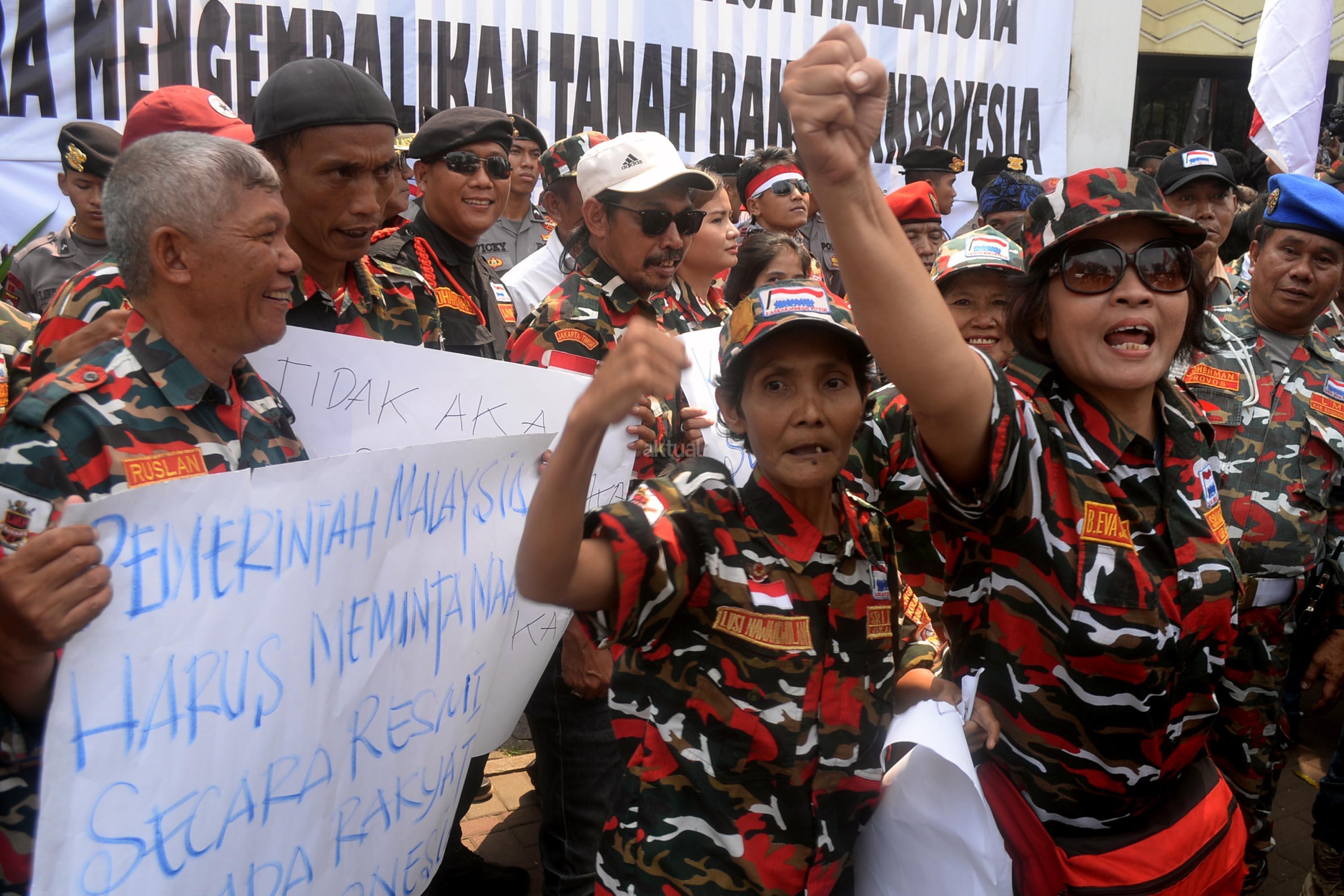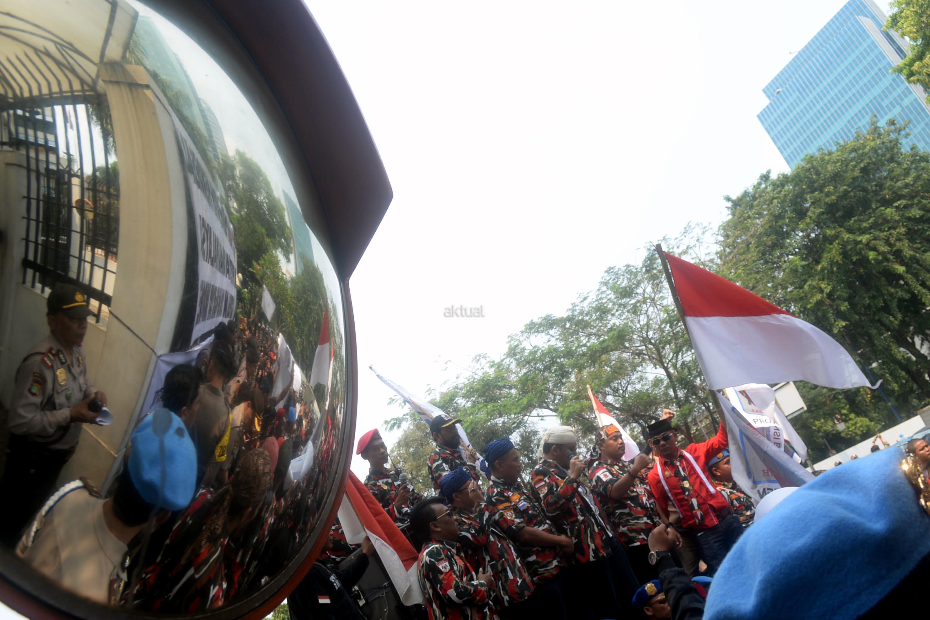 Massa yang tergabung dalam Laskar Merah Putih (LMP) melakukan aksi unjuk rasa di depan Kedutaan Besar Malaysia, Kuningan, Jakarta Selatan, Senin (21/8/2017). Aksi Laskar Merah Putih ini kasus terbaliknya bendera Merah Putih pada buku panduan pelaksanaan SEA Games 2017.