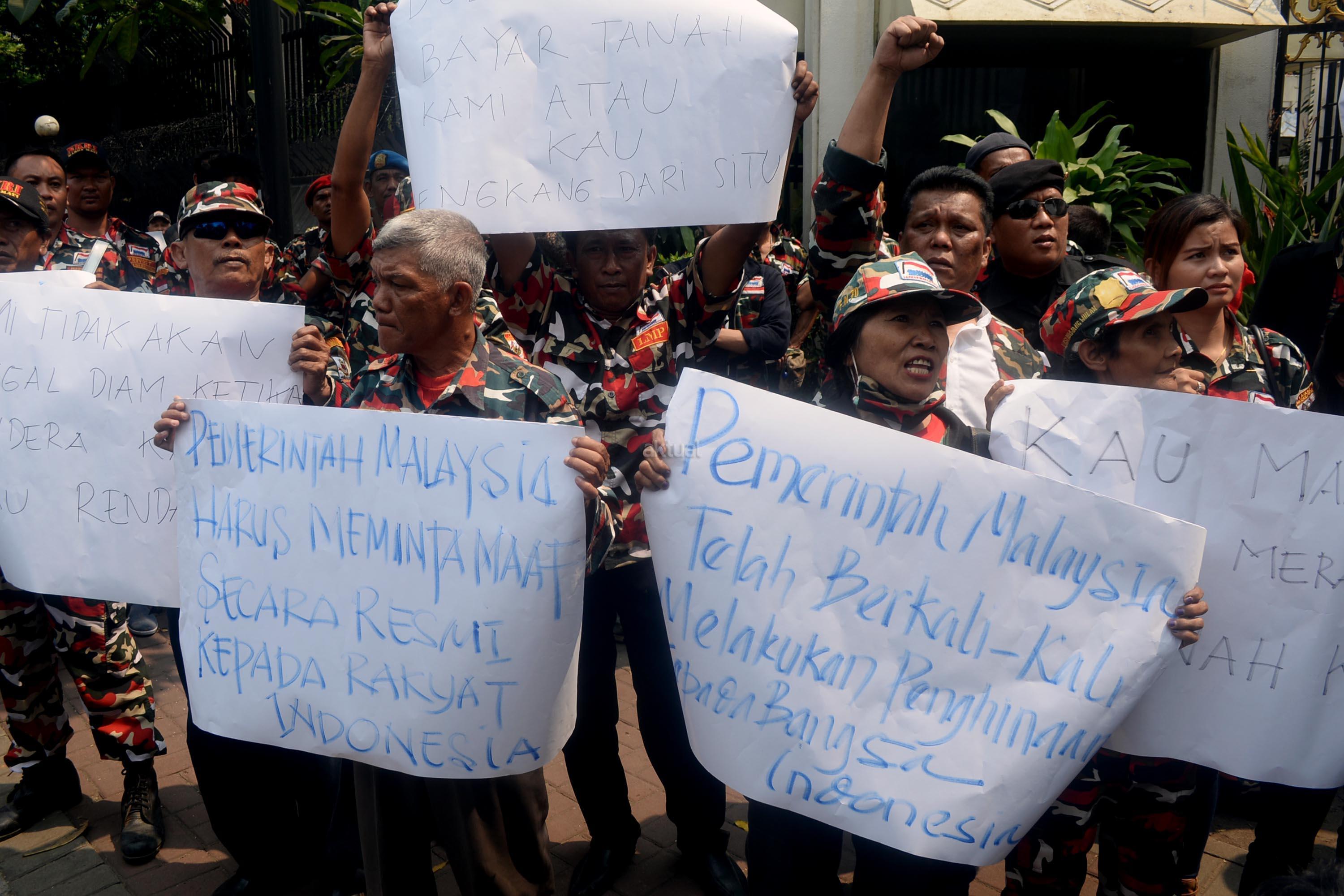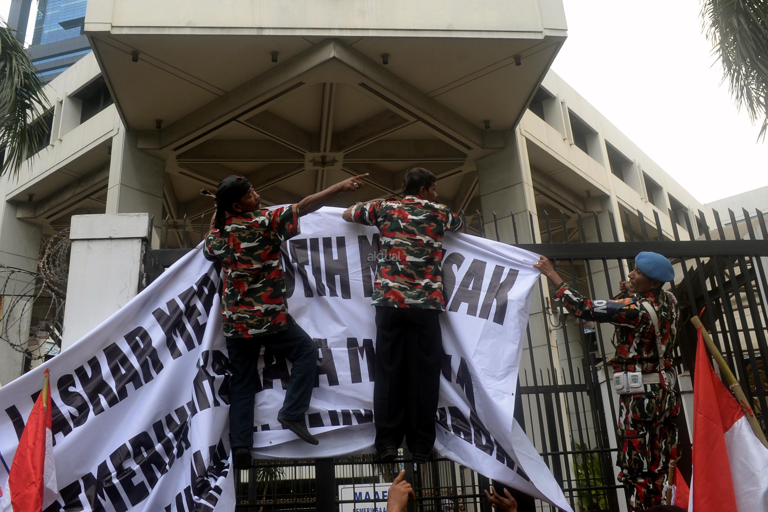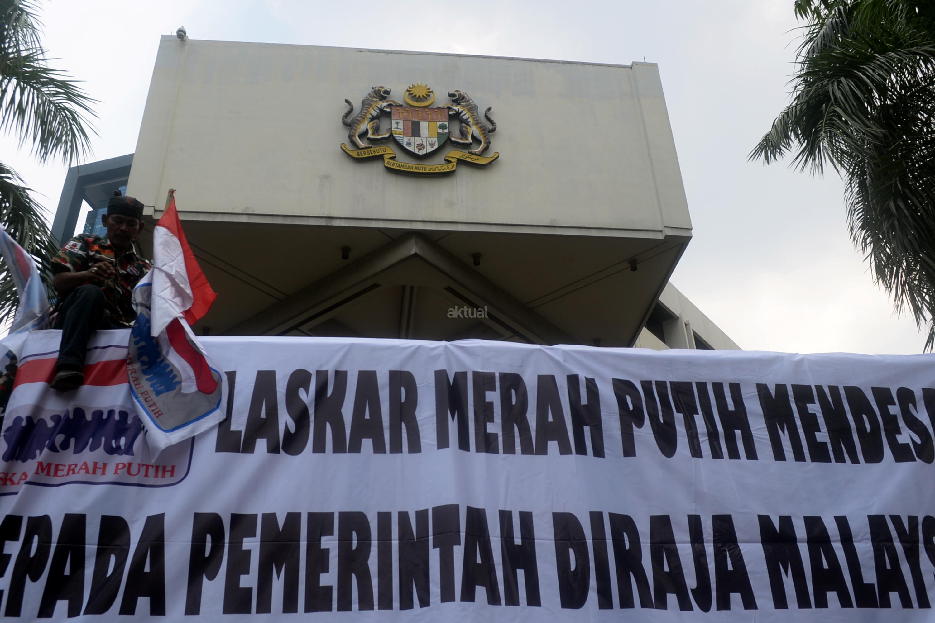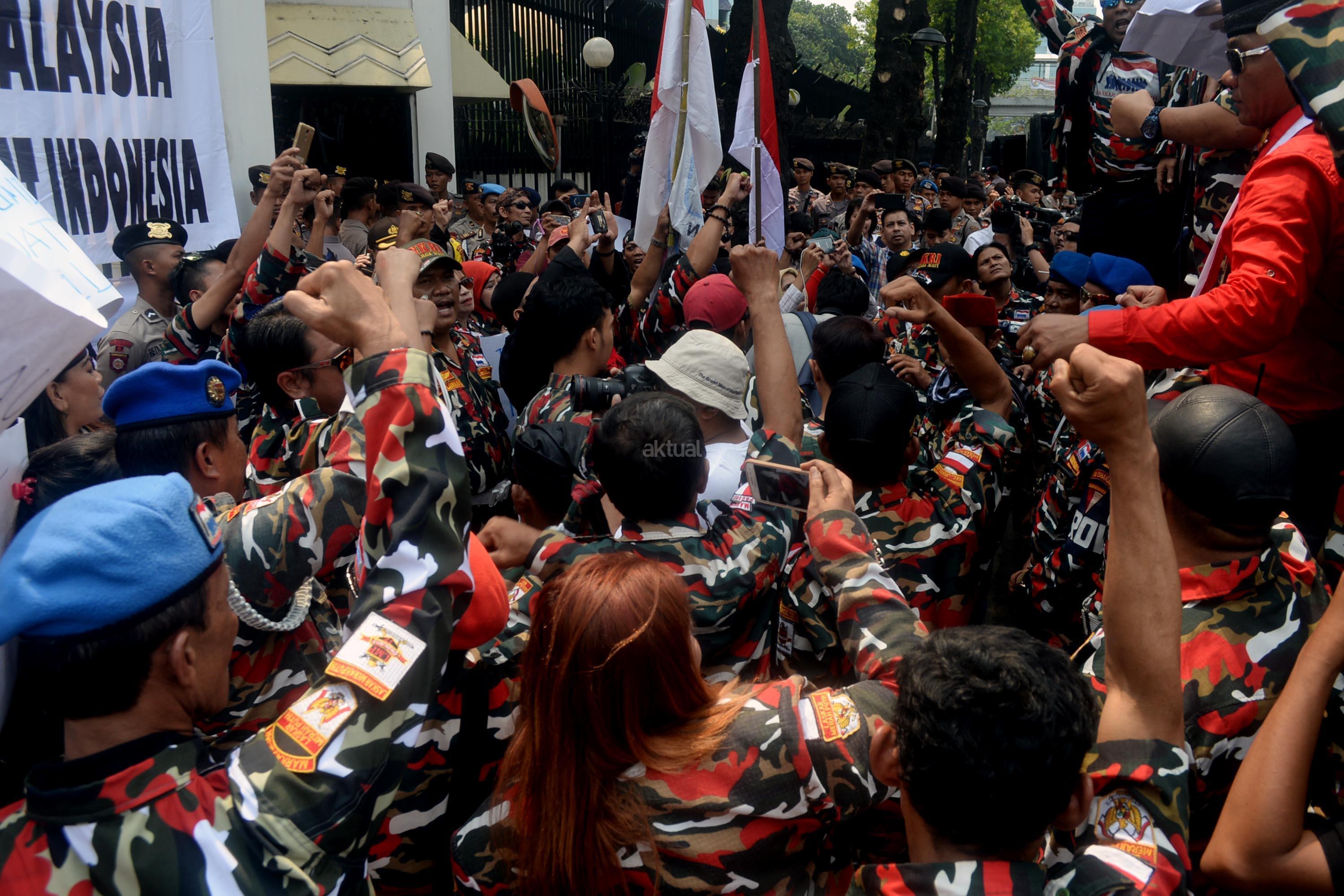 Massa yang tergabung dalam Laskar Merah Putih (LMP) melakukan aksi unjuk rasa di depan Kedutaan Besar Malaysia, Kuningan, Jakarta Selatan, Senin (21/8/2017). Aksi Laskar Merah Putih ini kasus terbaliknya bendera Merah Putih pada buku panduan pelaksanaan SEA Games 2017. AKTUAL/Munzir