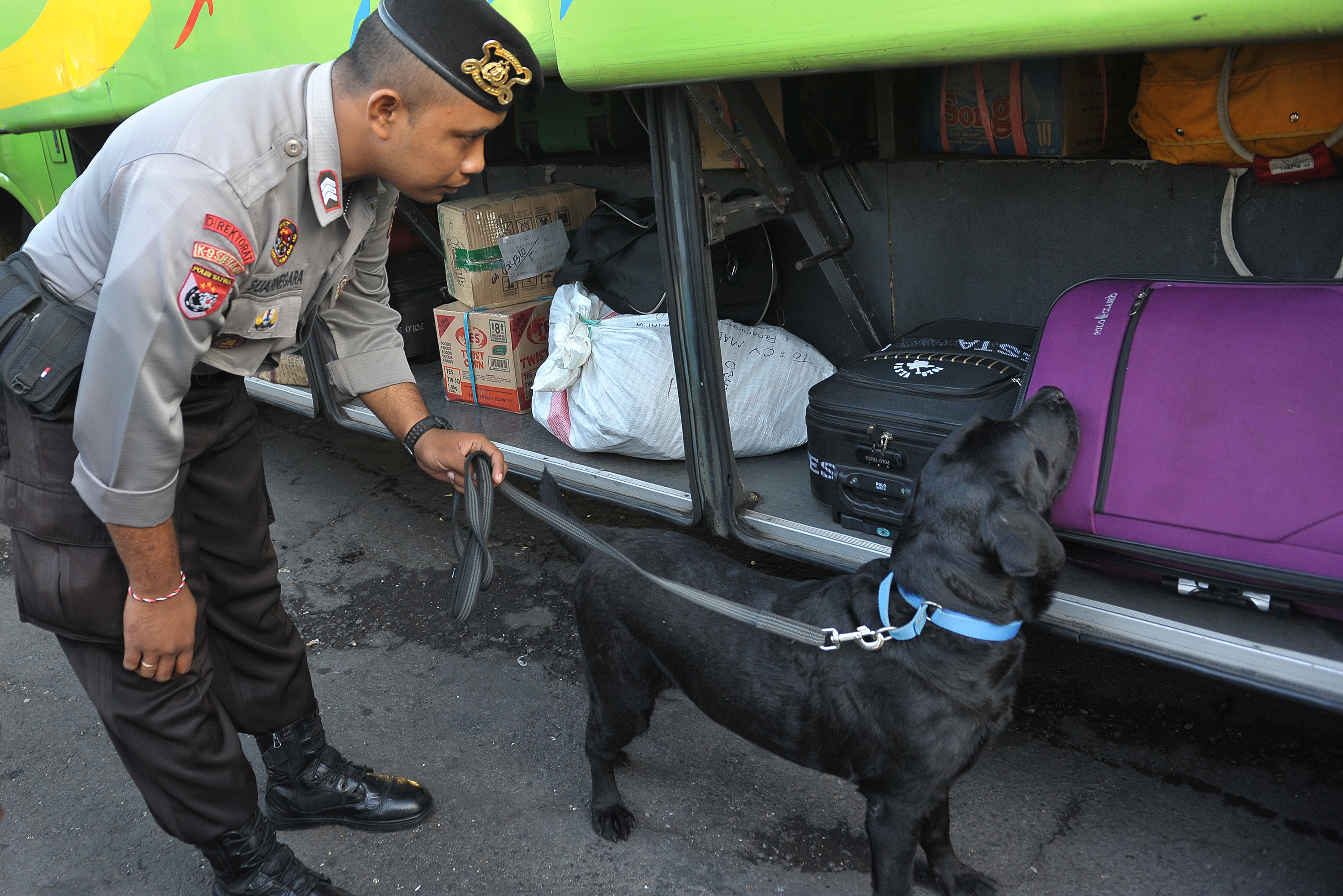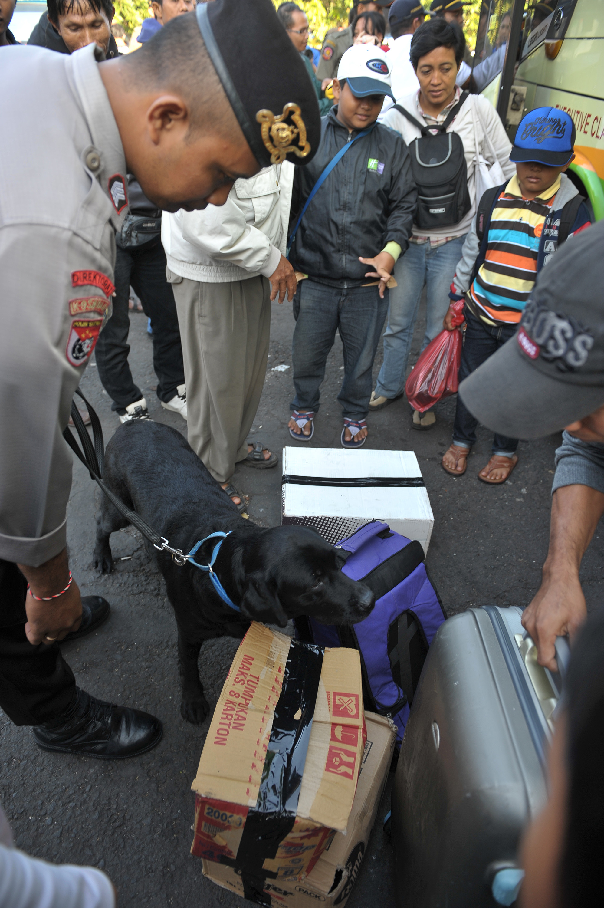 Anggota Polisi dari unit Satwa K-9 memeriksa barang bawaan penumpang bus setibanya di Terminal Ubung pada H+4 Lebaran di Denpasar, Bali, Senin (11/7). Inspeksi petugas gabungan dari berbagai unsur tersebut dilakukan untuk mencegah upaya penyelundupan barang berbahaya dan urbanisasi ilegal ke Bali yang memanfaatkan keramaian arus balik Idul Fitri 1437H. ANTARA FOTO/Nyoman Budhiana/Spt/16.