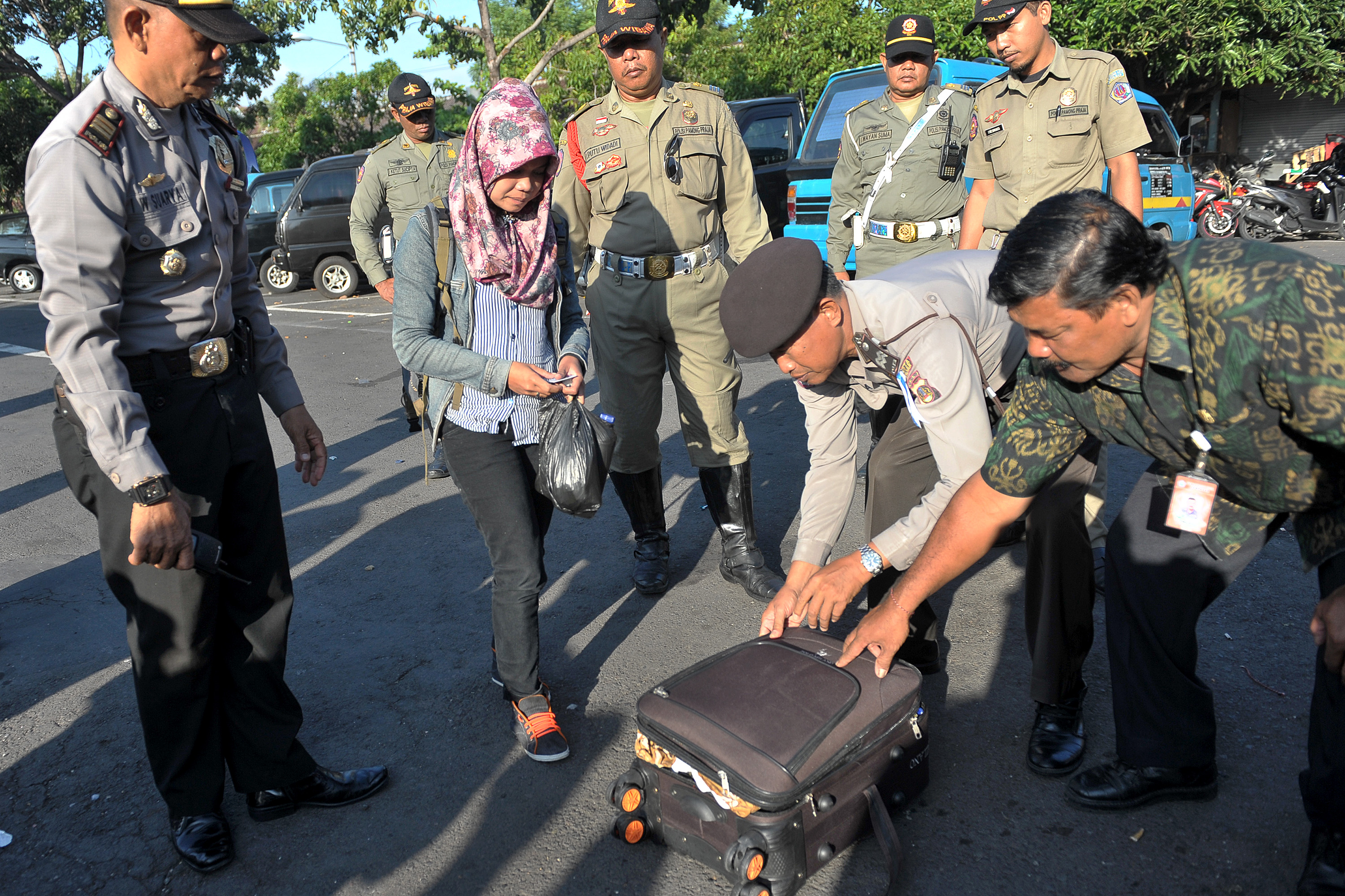 Anggota Satuan Polisi Pamong Praja Kota Denpasar memeriksa identitas para penumpang bus setibanya di Terminal Ubung pada H+4 Lebaran di Denpasar, Bali, Senin (11/7). Inspeksi petugas gabungan dari berbagai unsur tersebut dilakukan untuk mencegah upaya penyelundupan barang berbahaya dan urbanisasi ilegal ke Bali yang memanfaatkan keramaian arus balik Idul Fitri 1437H. ANTARA FOTO/Nyoman Budhiana/Spt/16.